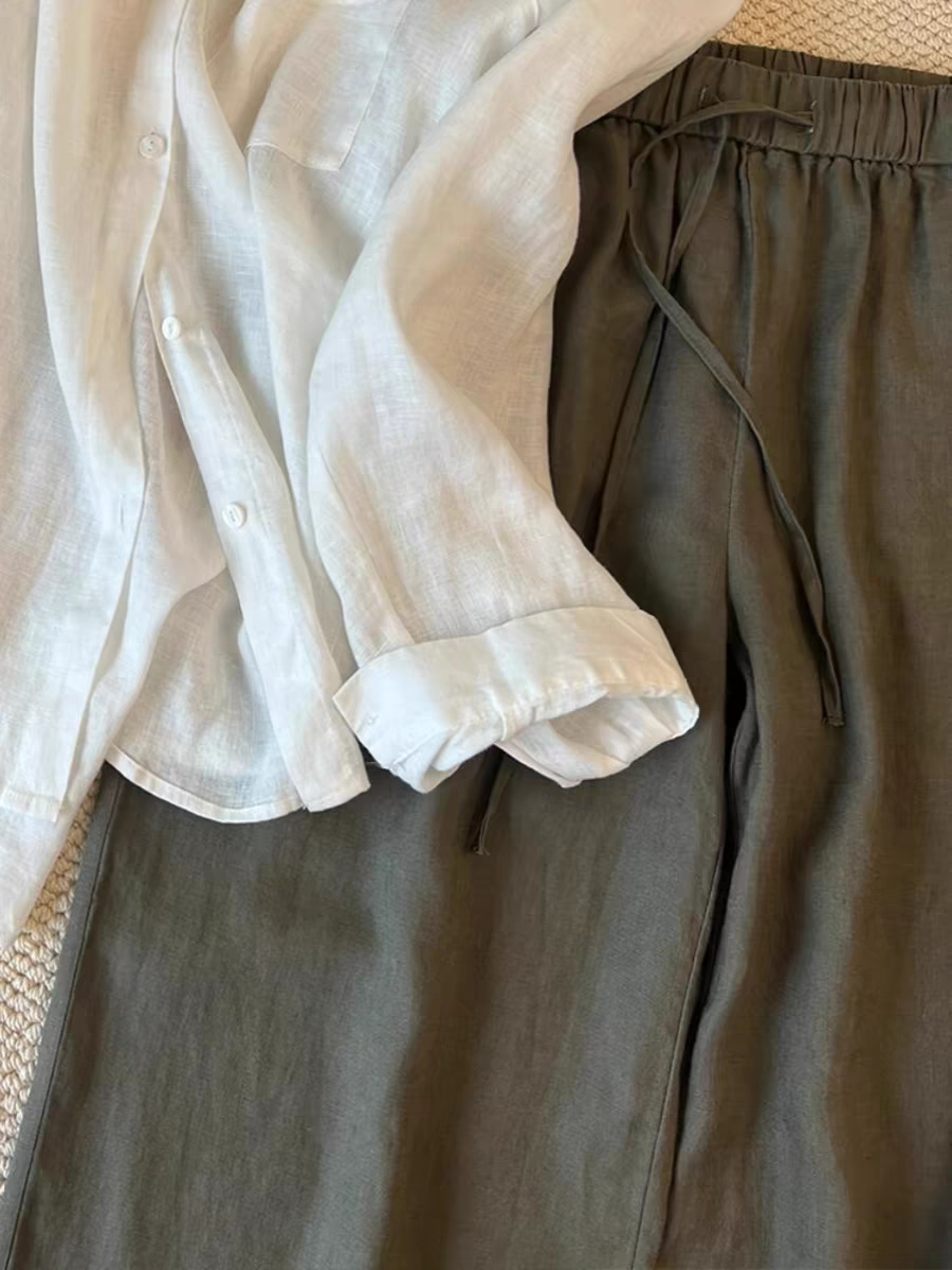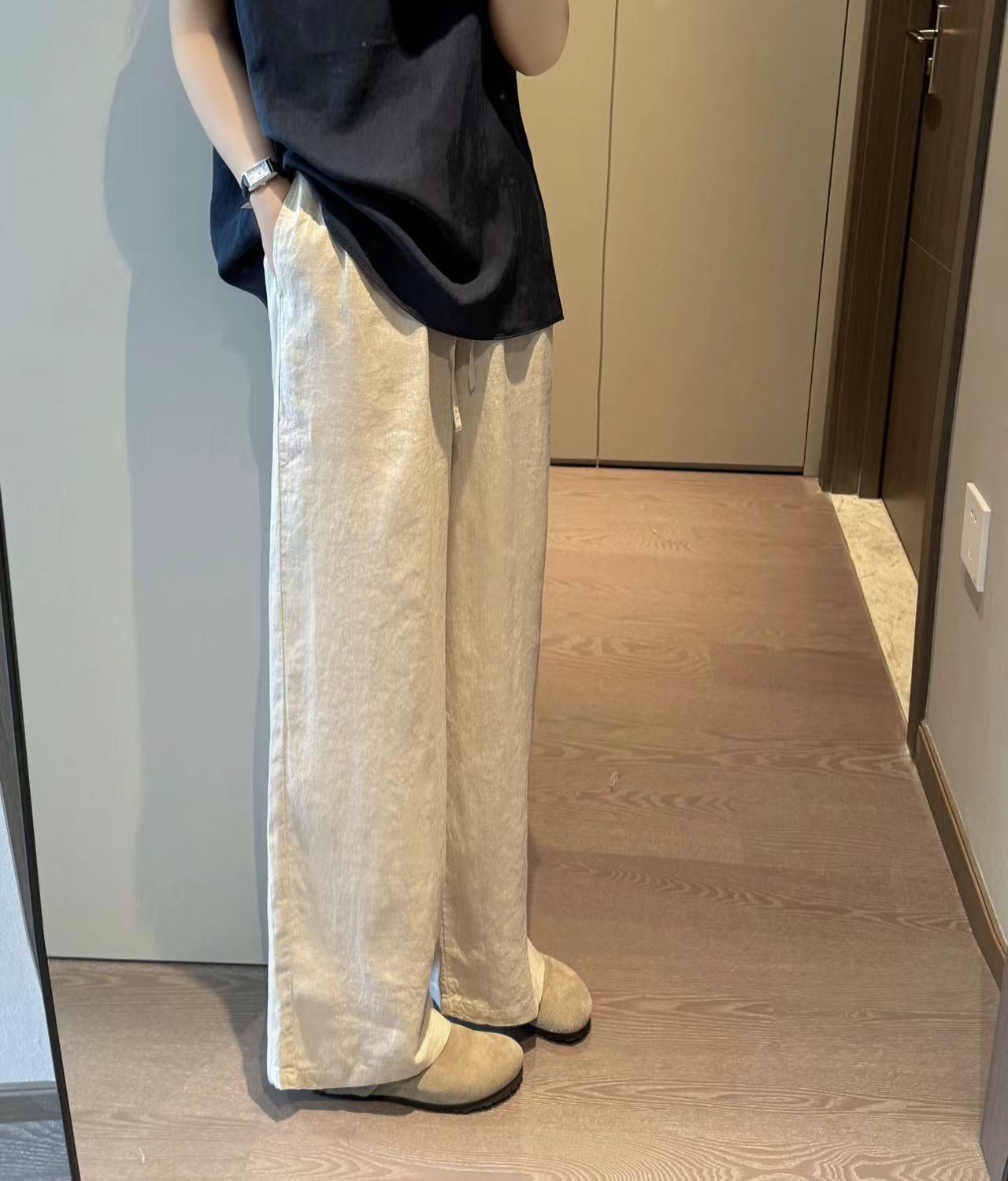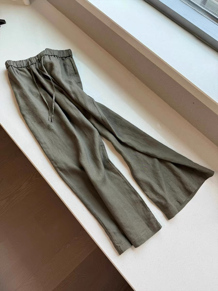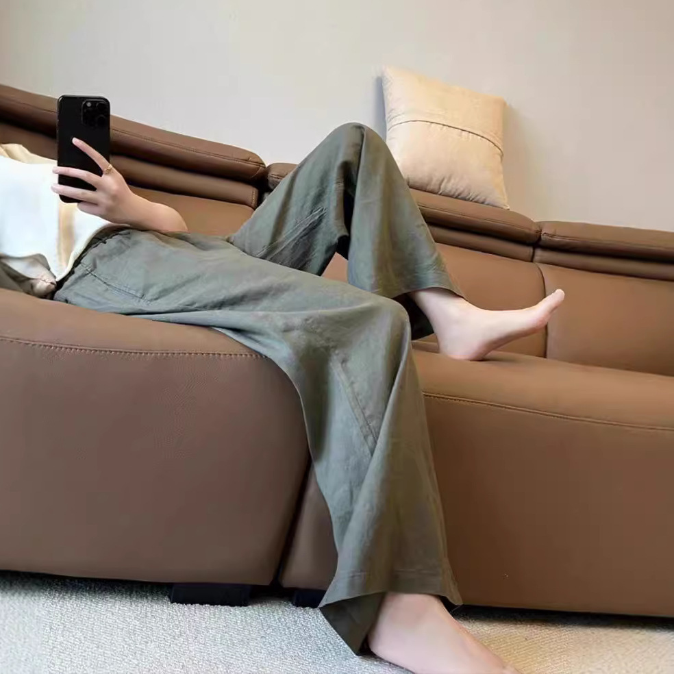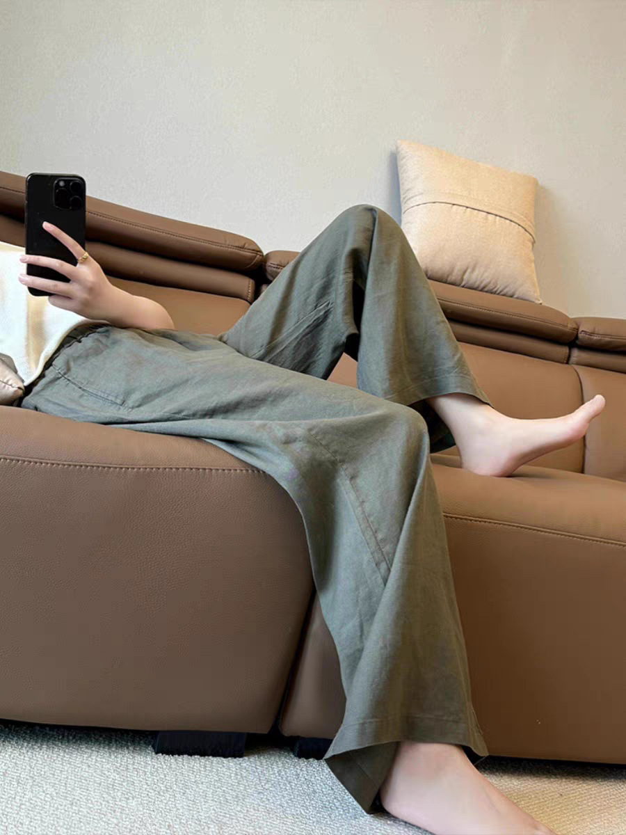 CHAO级推荐!军绿色仿天丝亚麻阔腿裤松紧腰抽绳舒适百搭透气裤子