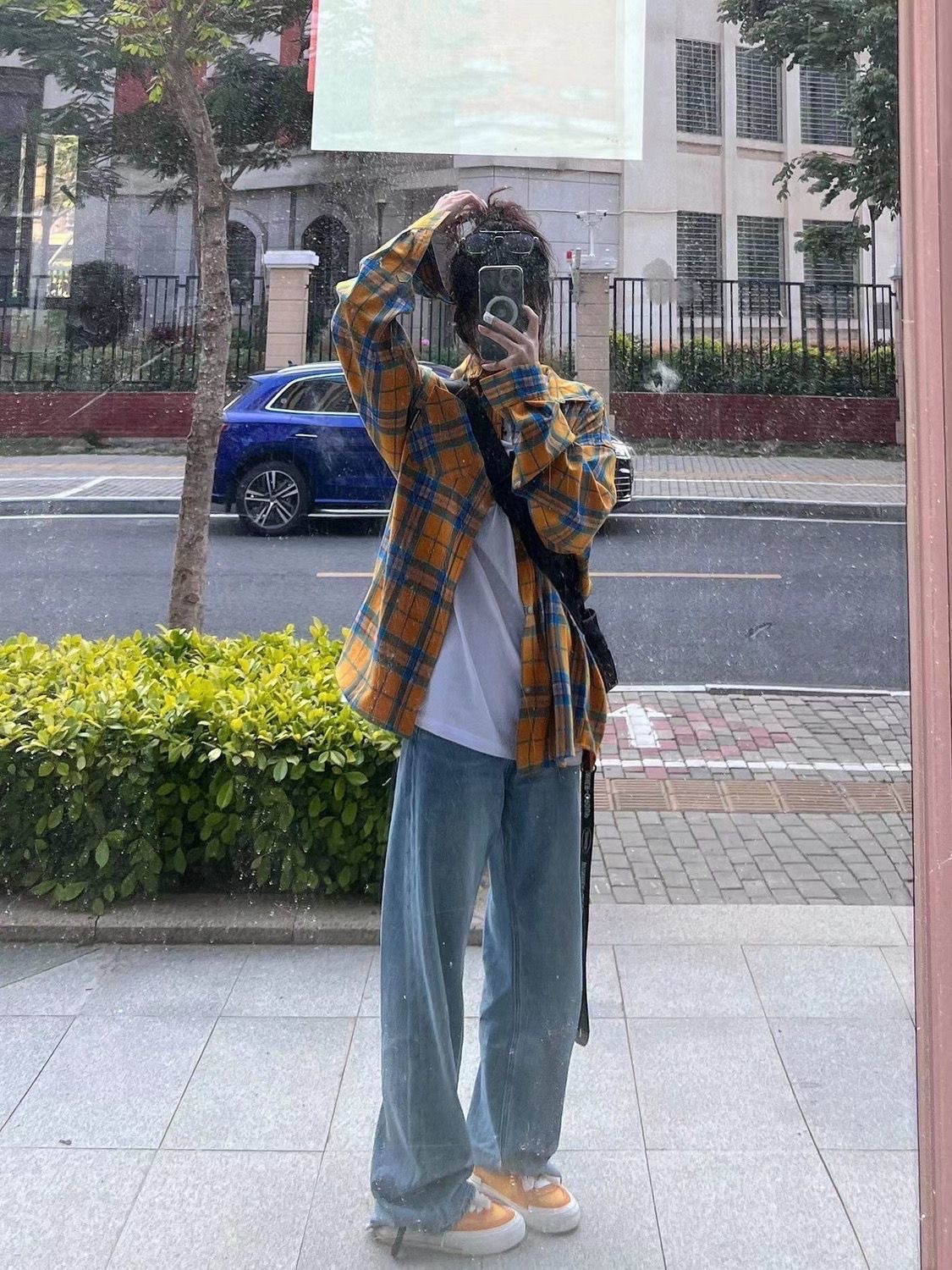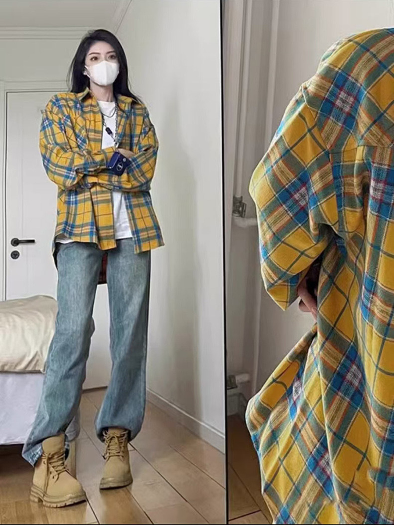 프랑스 노란색 격자 무늬 셔츠 코트 여성의 봄과 가을 2024 새로운 작은 내부 긴 소매 탑스토어 가기