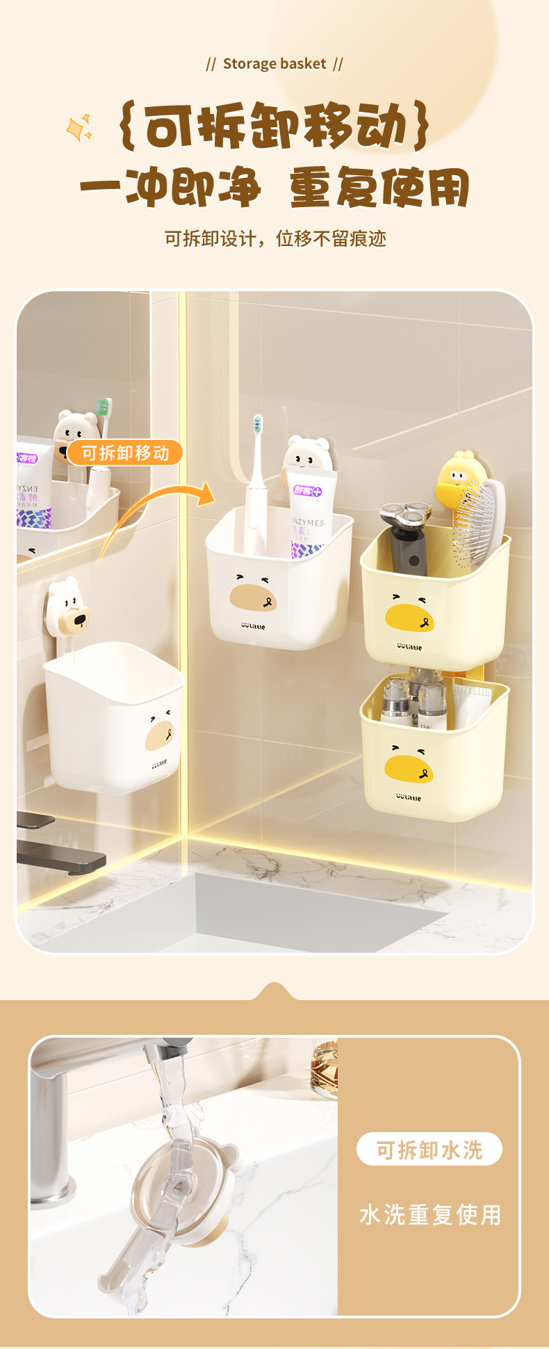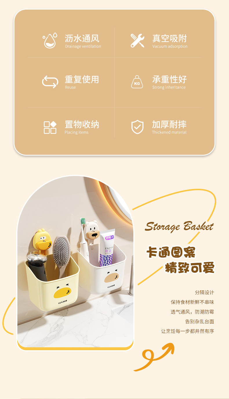 만화 귀여운 욕실 벽걸이 흡입 컵 칫솔 홀더 학생 기숙사 욕실 보관 랙 대용량 벽걸이 보관 바구니