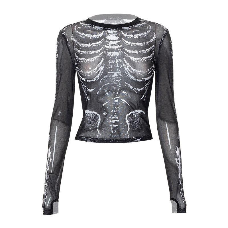 2024 새로운 라운드 넥 풀오버 긴 소매 메쉬 해골 인쇄 캐주얼 유럽과 미국 여성의 탑