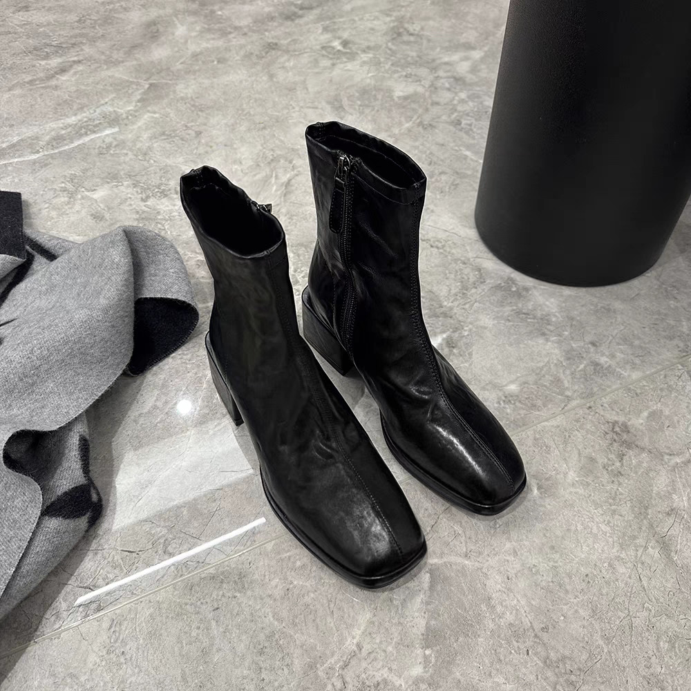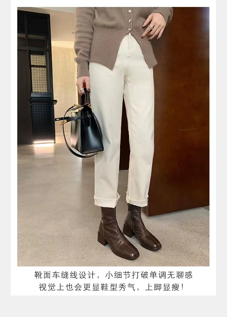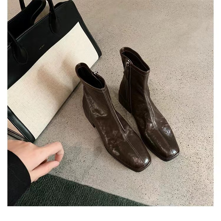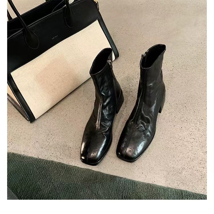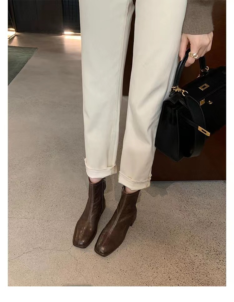 씻은 Cowhide ~ 정품 가죽 스퀘어 헤드 레트로 얇은 부츠 여성용 두꺼운 힐 발목 부츠 영국 스타일 마틴 부츠 싱글 부츠스토어 가기