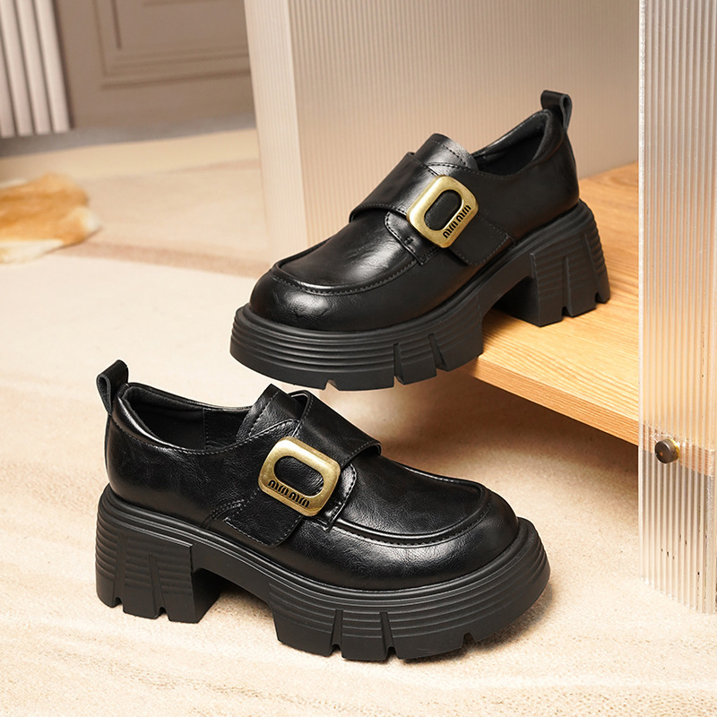 정품 가죽 두꺼운 밑창 로퍼 여성의 2024 새로운 소프트 가죽 라운드 토 두꺼운 굽 작은 가죽 신발 벨크로 하이힐 로퍼스토어 가기