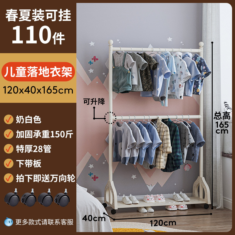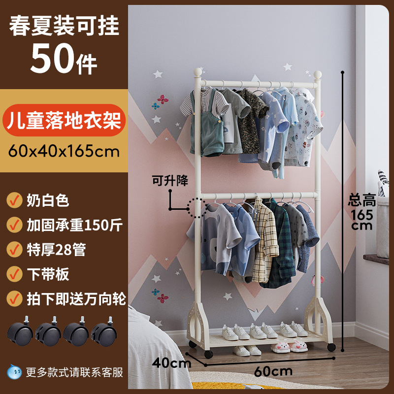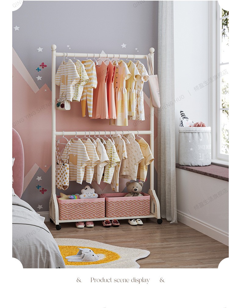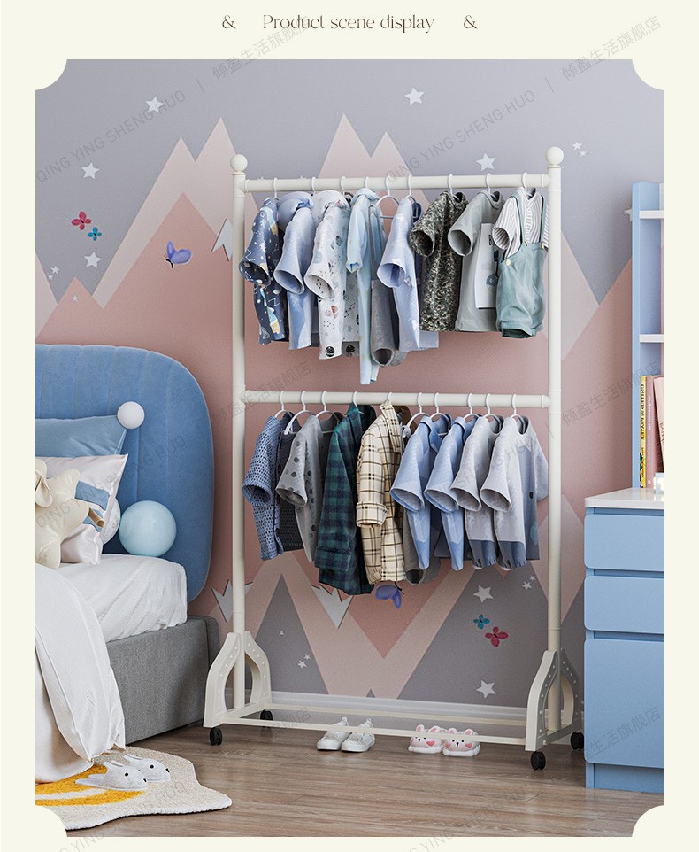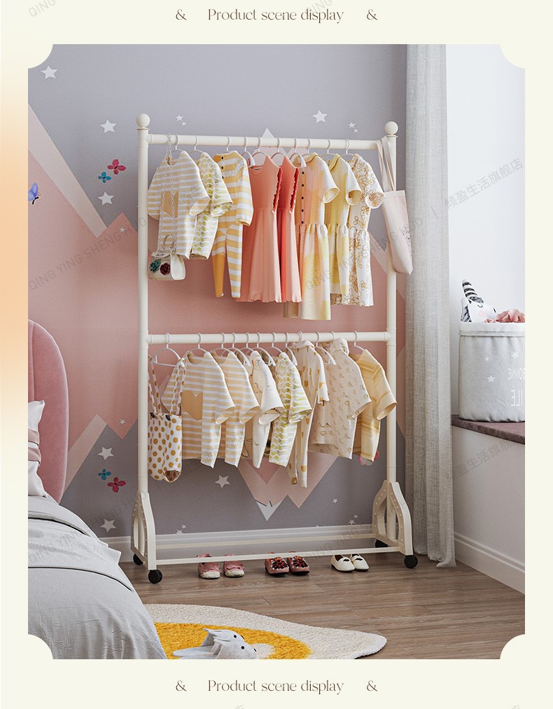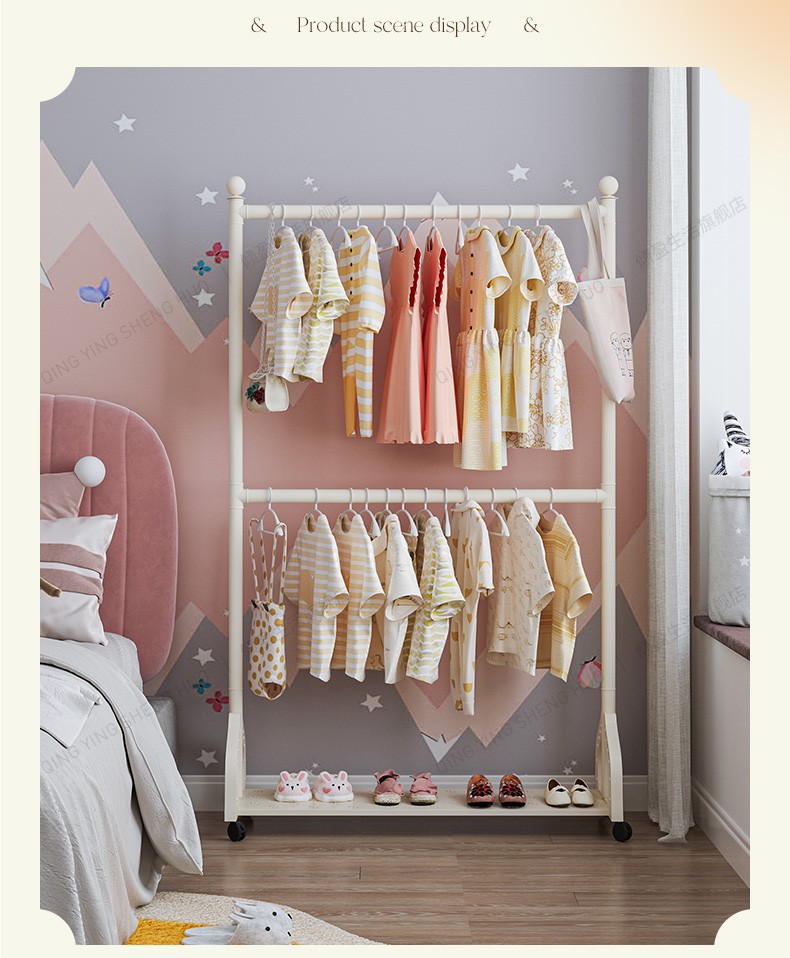 어린이 방 행거 침실 바닥 서 이동식 코트 랙 크림 스타일 옷걸이 상단 및 하단 더블 레이어 스토리지 랙 침대 옆