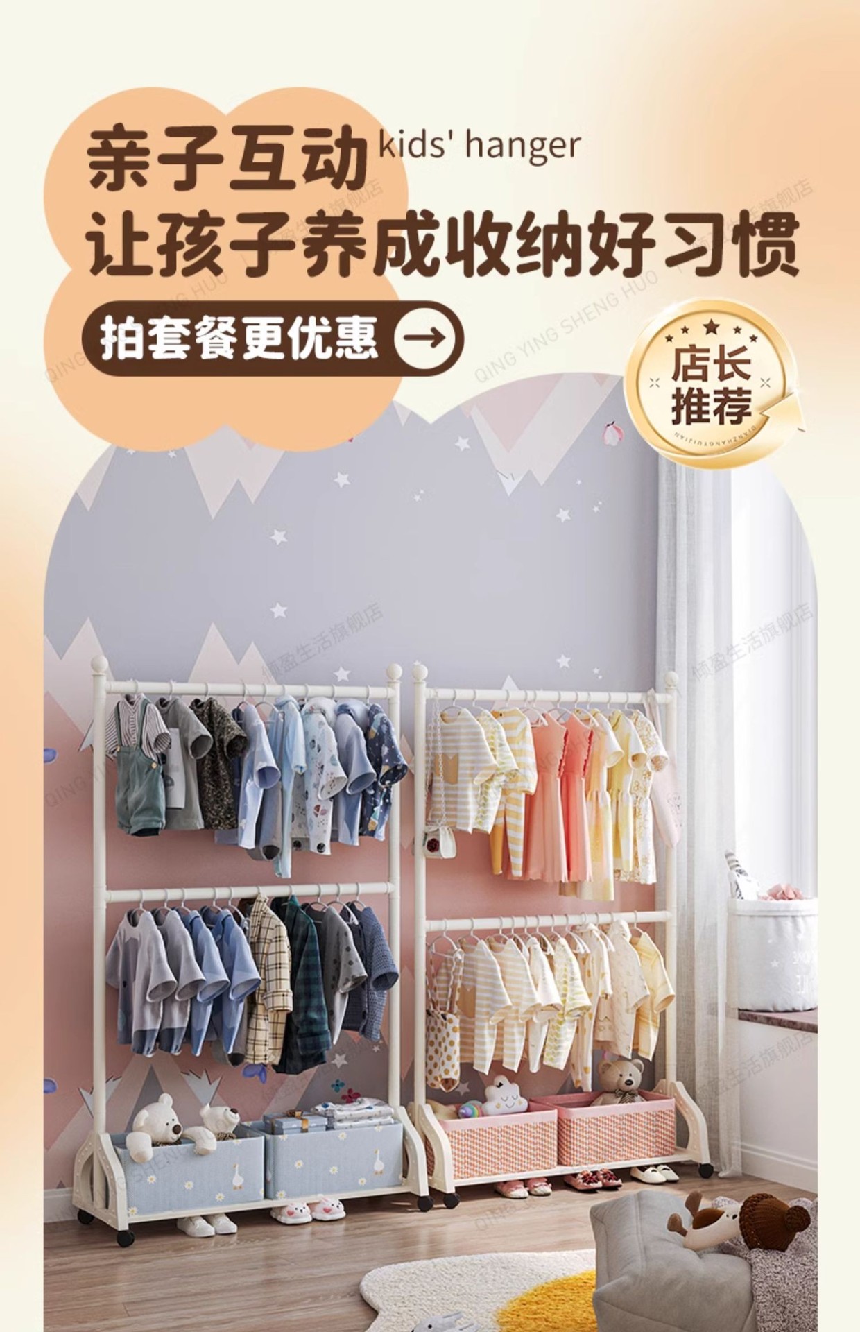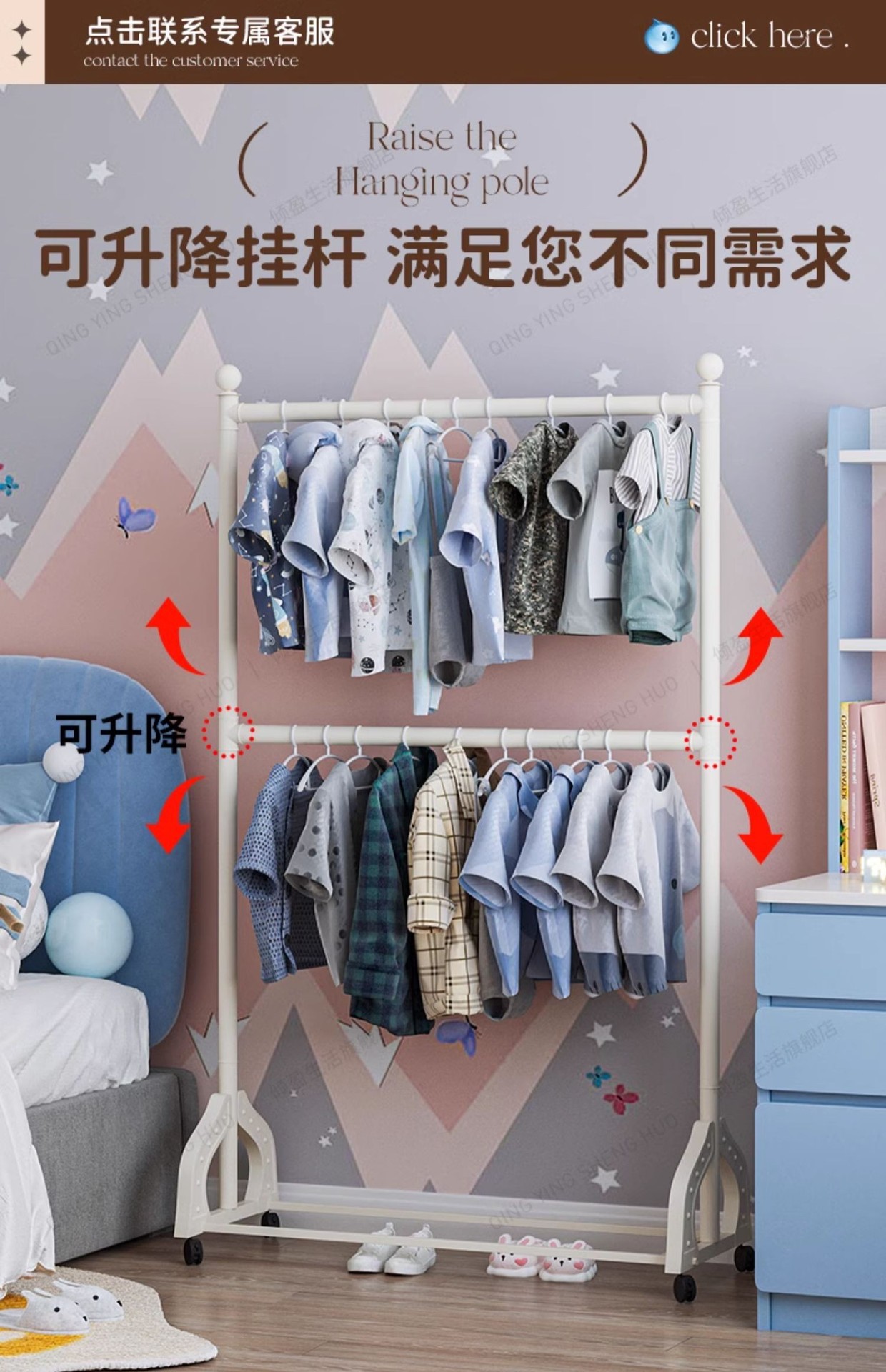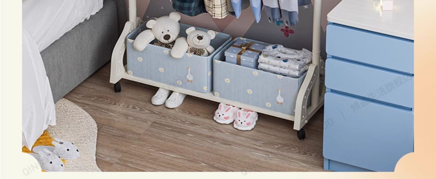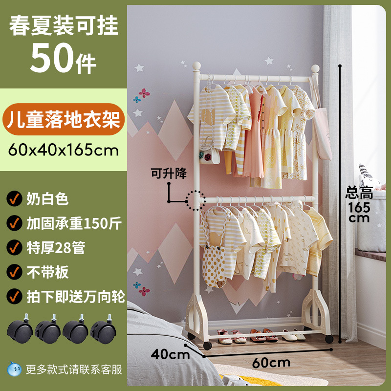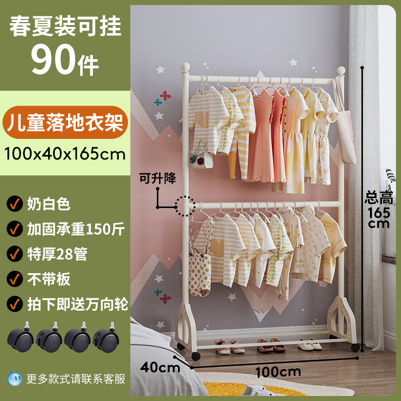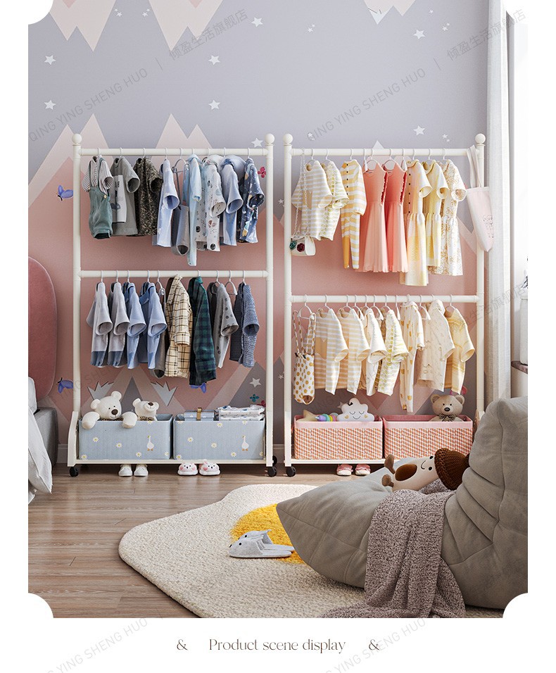 어린이 방 행거 침실 바닥 서 이동식 코트 랙 크림 스타일 옷걸이 상단 및 하단 더블 레이어 스토리지 랙 침대 옆