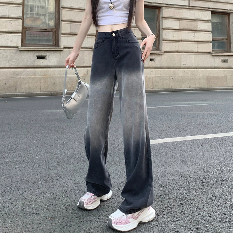 그라디언트 청바지 여성용 대조 색상 작은 높은 허리 한국식 루즈 블랙 그레이 스트레이트 매달린 와이드 레그 바지스토어 가기