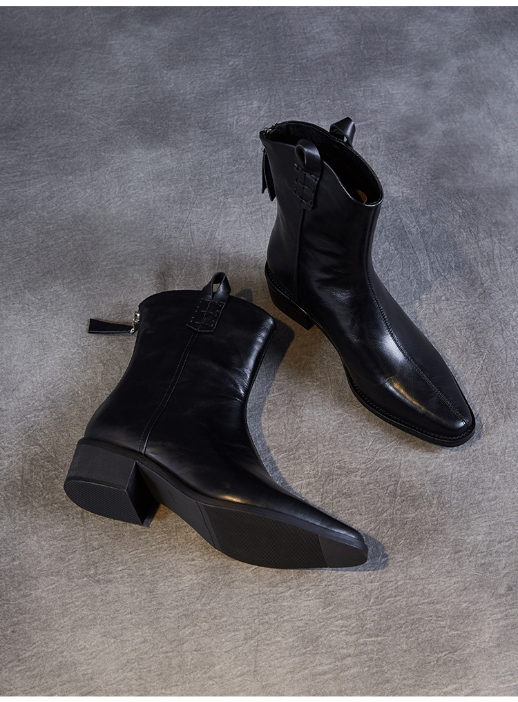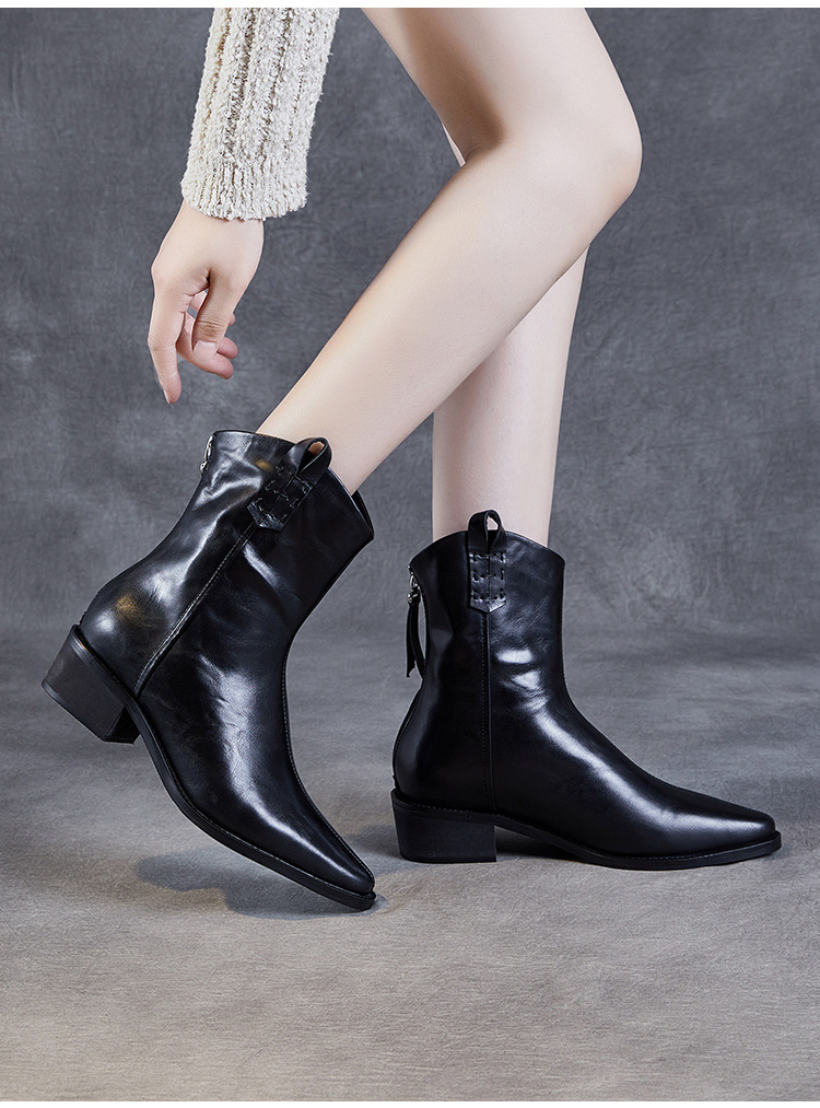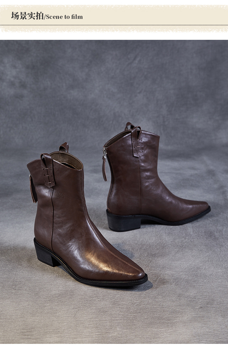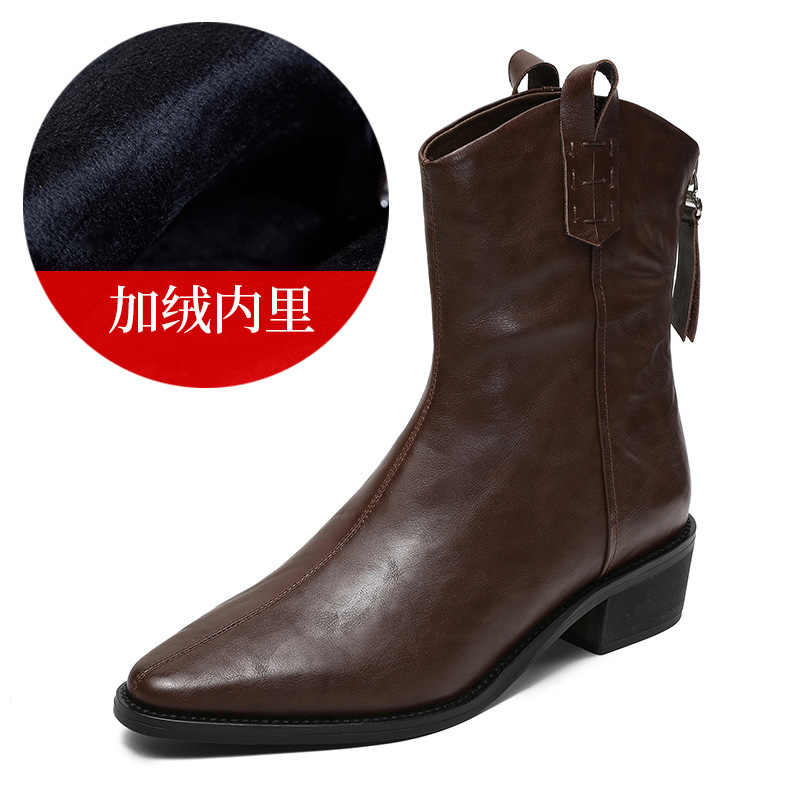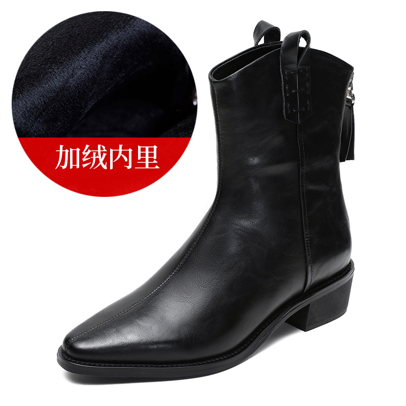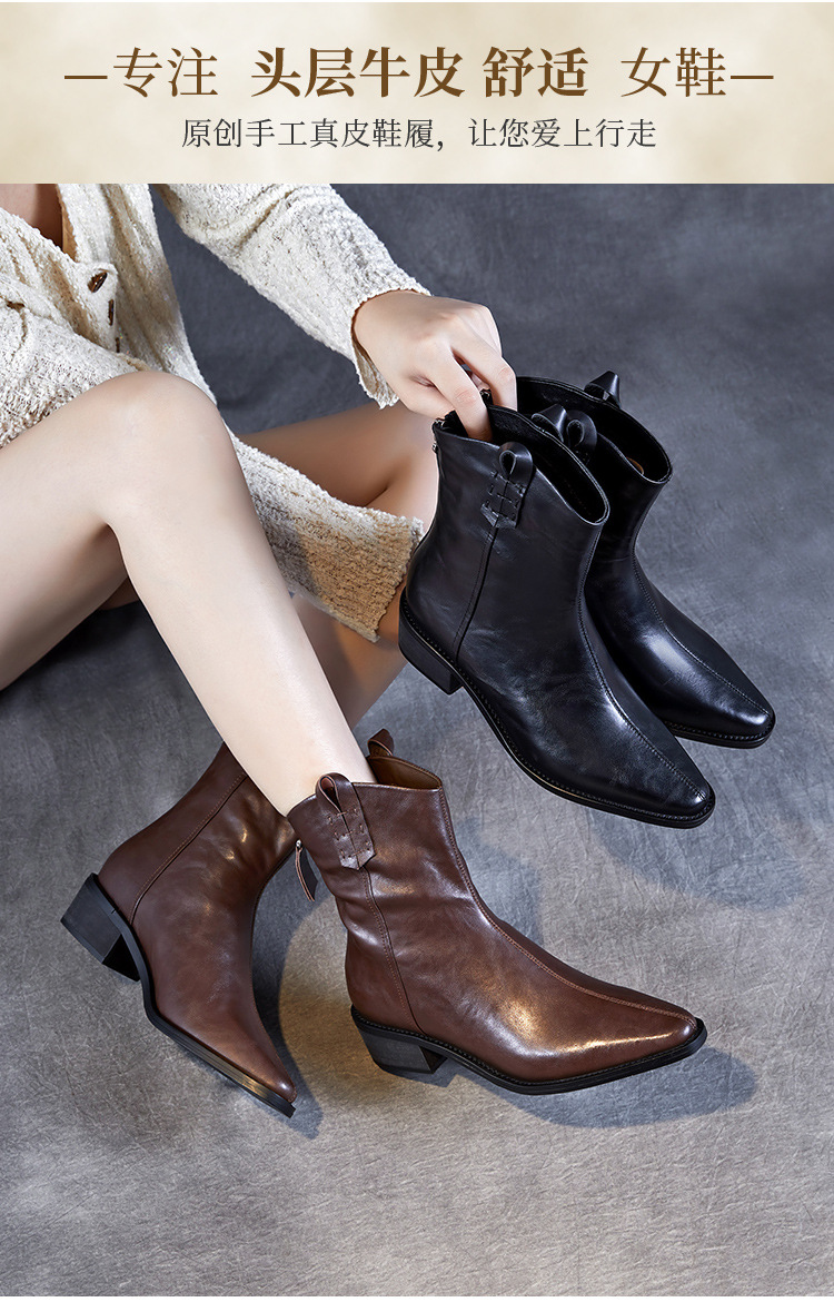 프랑스 정품 가죽 포인팅 웨스턴 발목 부츠 여성의 2024 년 새로운 가을과 겨울 두꺼운 단독 증가 레트로 나이트 마틴 부츠 여성