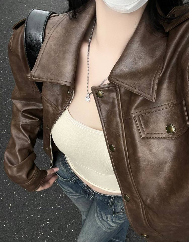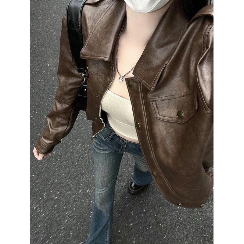 홍콩 스타일의 다크 브라운 가죽 자켓 여성의 가을 2024 새로운 올해 인기있는 복고풍 디자인 pu 가죽 자켓 탑스토어 가기