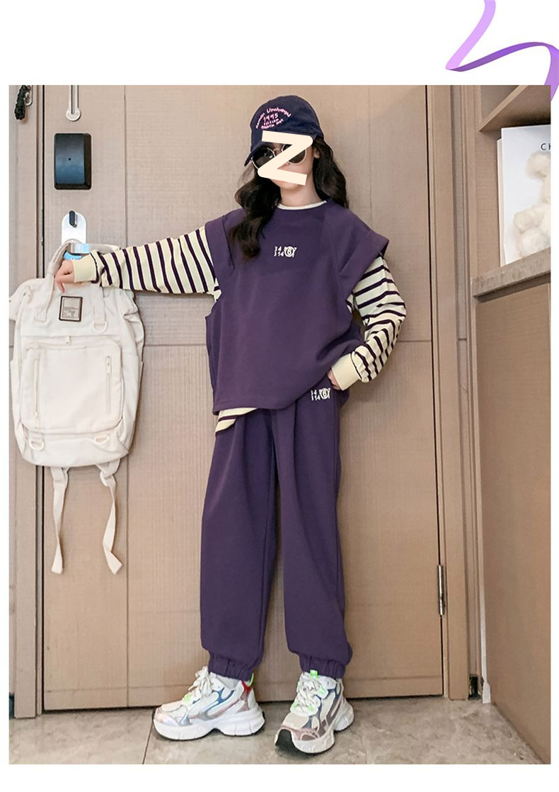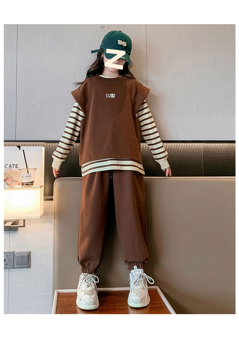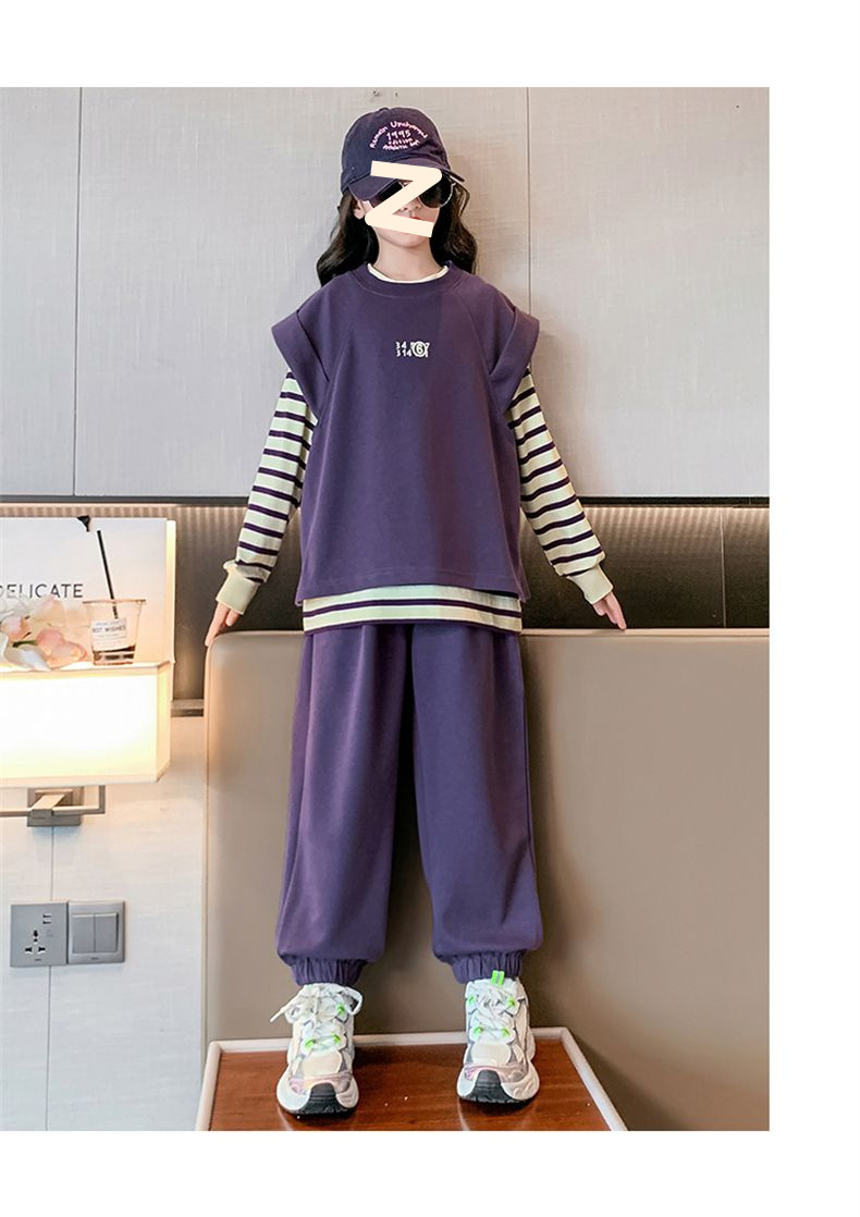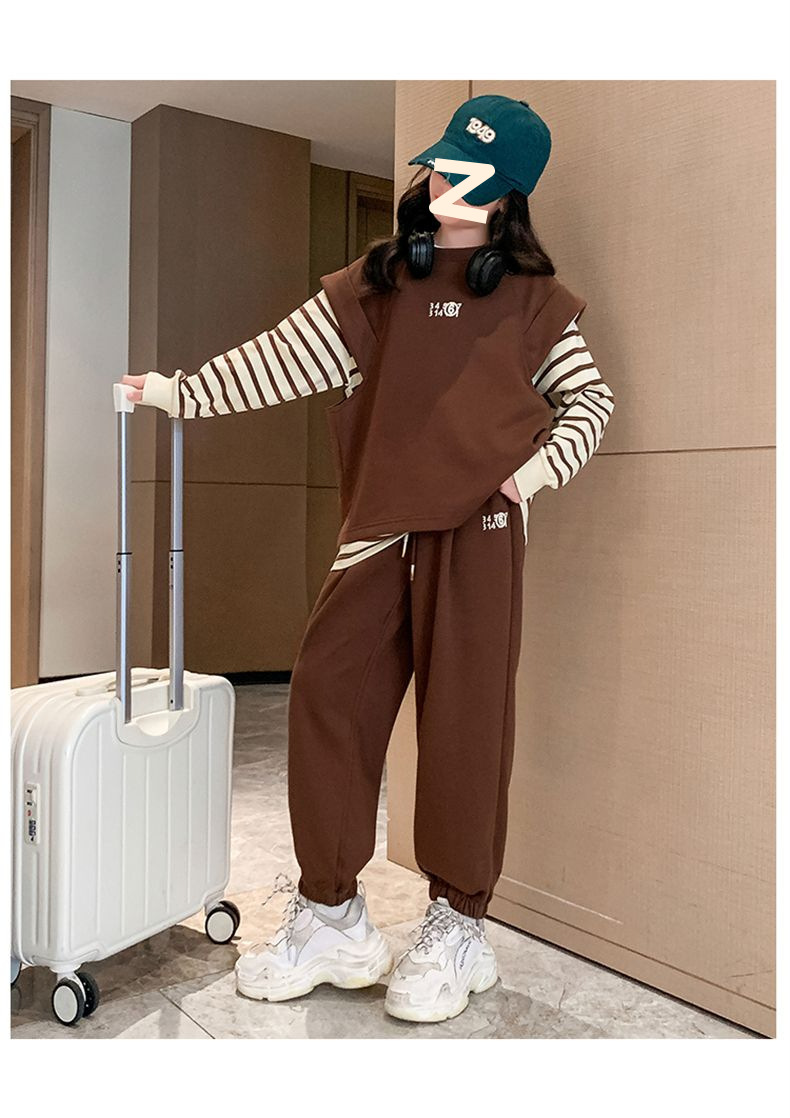 소녀 가을 줄무늬 티셔츠 양복 조끼 바지 3 피스 세트 2024 새로운 대형 어린이 유행 한국 세트