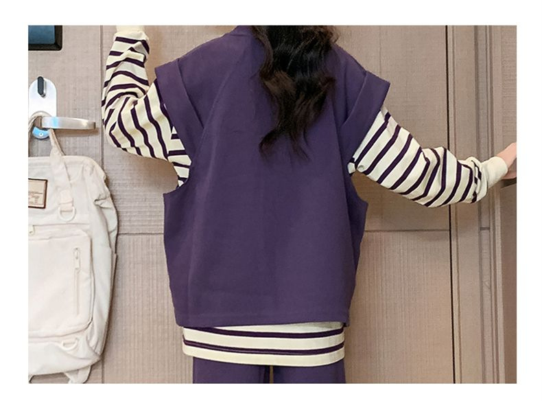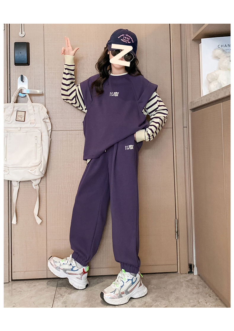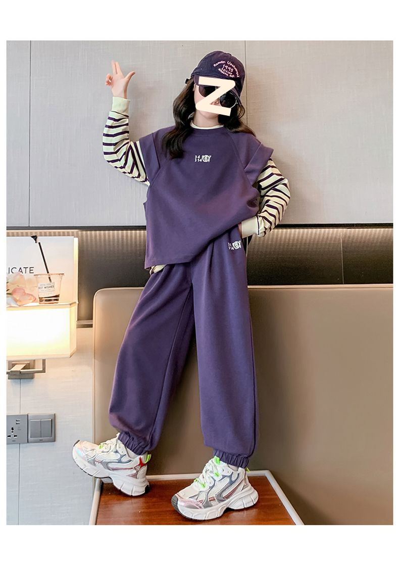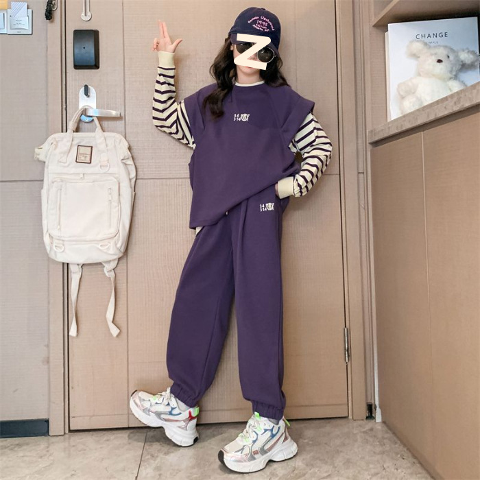 소녀 가을 줄무늬 티셔츠 양복 조끼 바지 3 피스 세트 2024 새로운 대형 어린이 유행 한국 세트