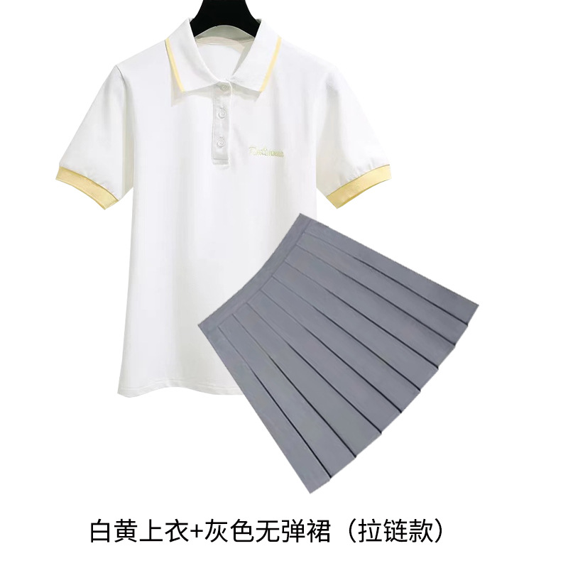 • 흰색과 노란색 T + 회색 스커트 (신축성 없는 지퍼 버전)