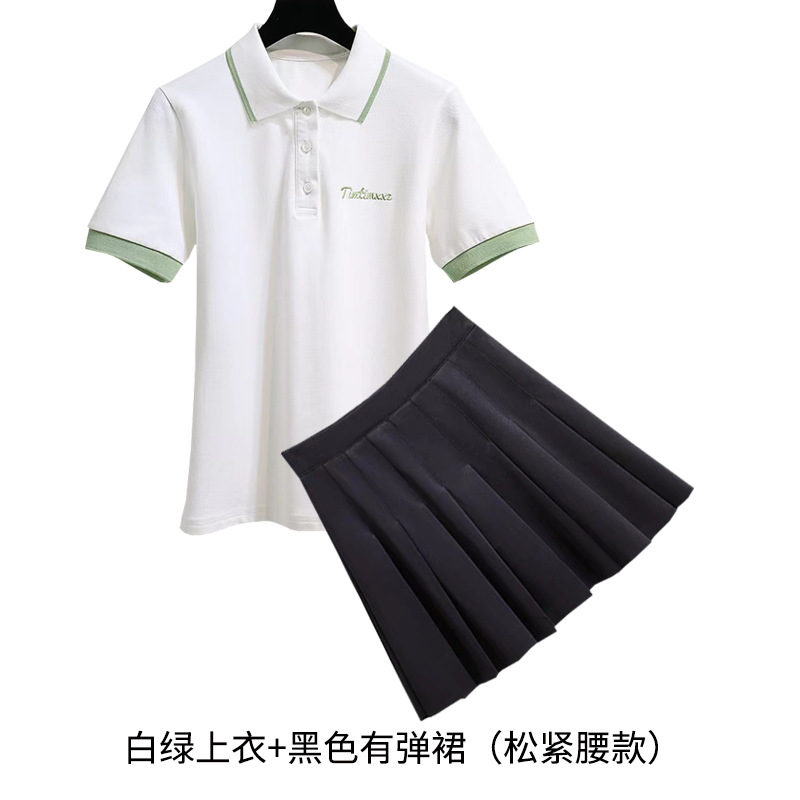 • 화이트, 그린 T + 블랙 스커트 (신축성 있는 허리)