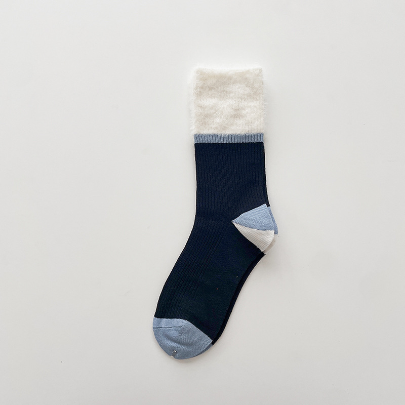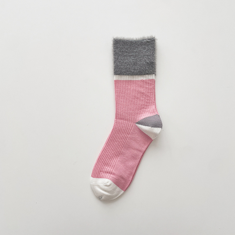 가을과 겨울 상부 튜브 모조 밍크 울 여성 양말 캐주얼 학술 스타일 대비 컬러 캐주얼 통기성 양말 세로 줄무늬 따뜻한 모피 양말