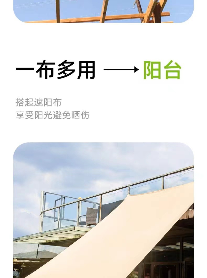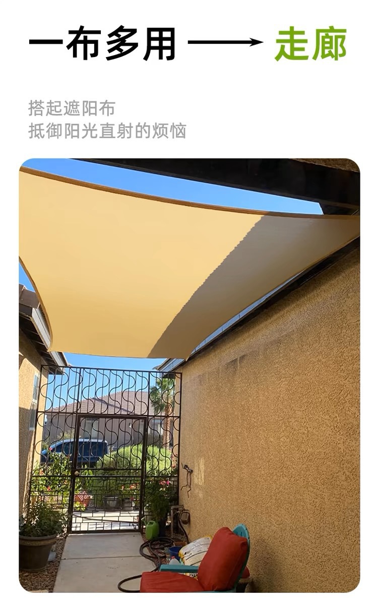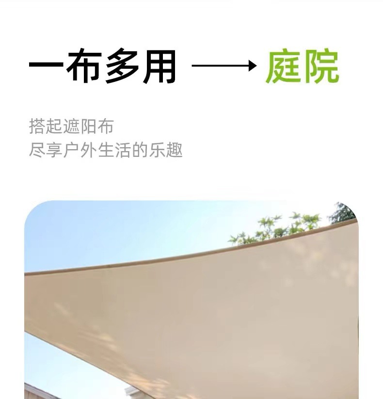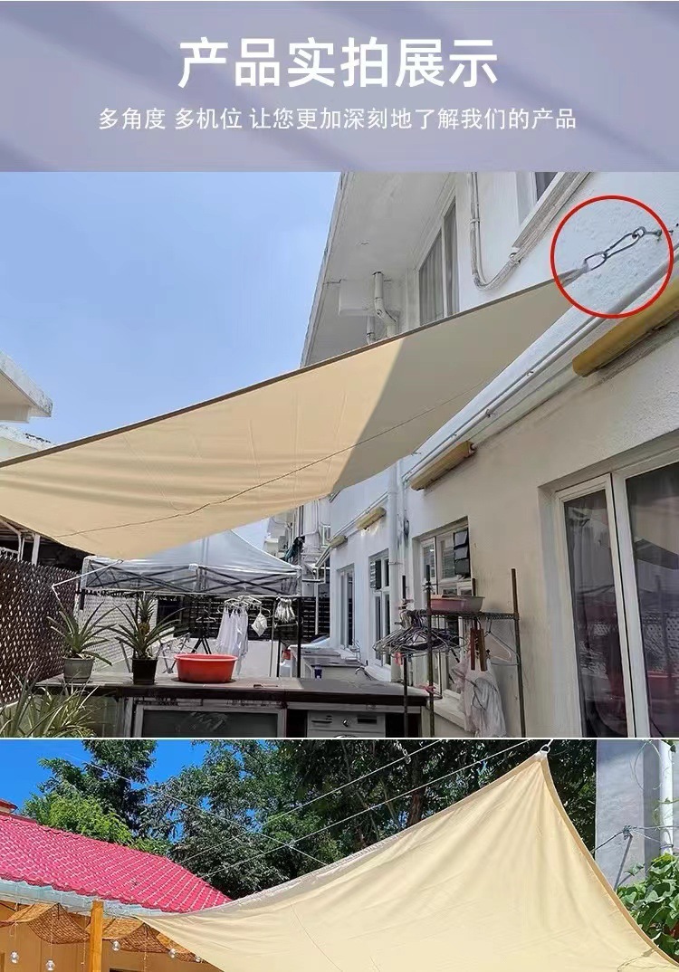 1、遮阳帆标配拉绳每根拉绳2米,三角形弧边配三根拉绳,四角形弧边配四根拉绳。