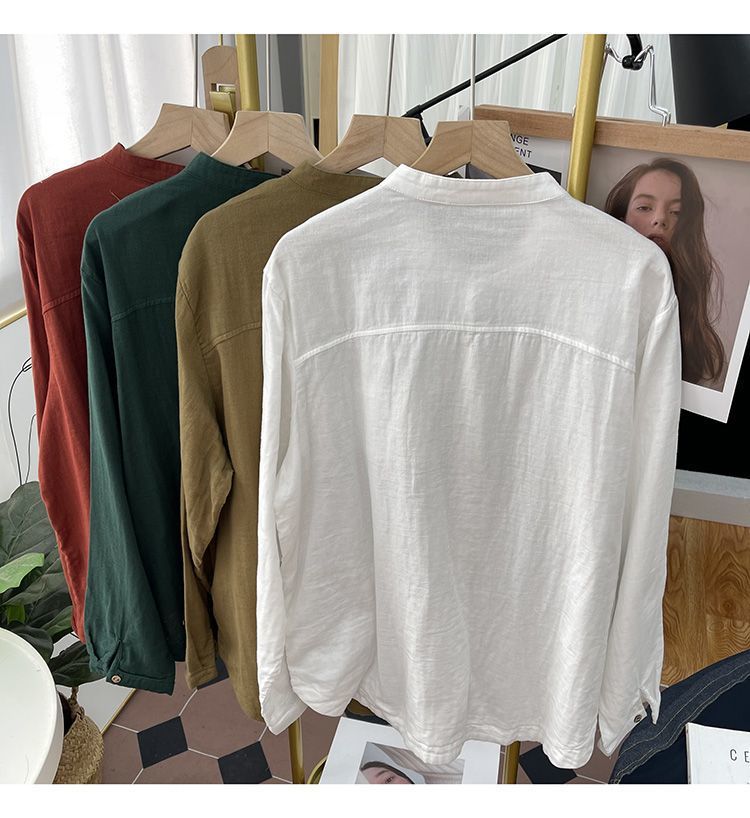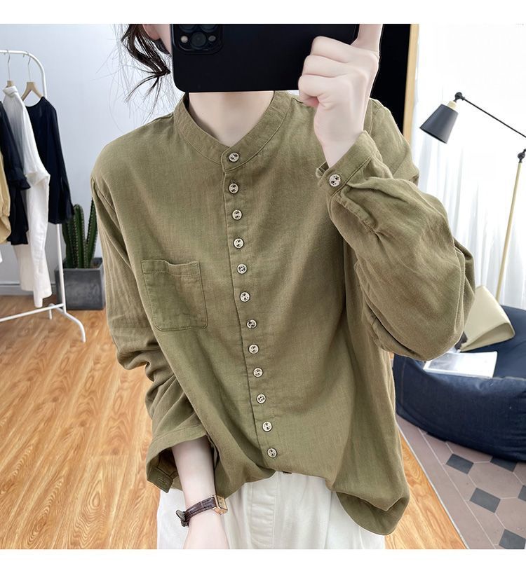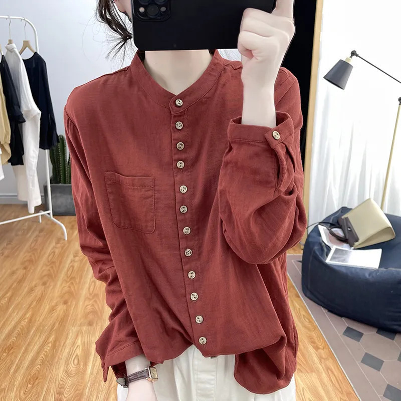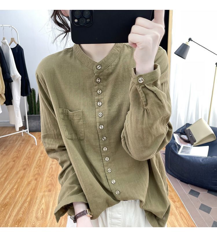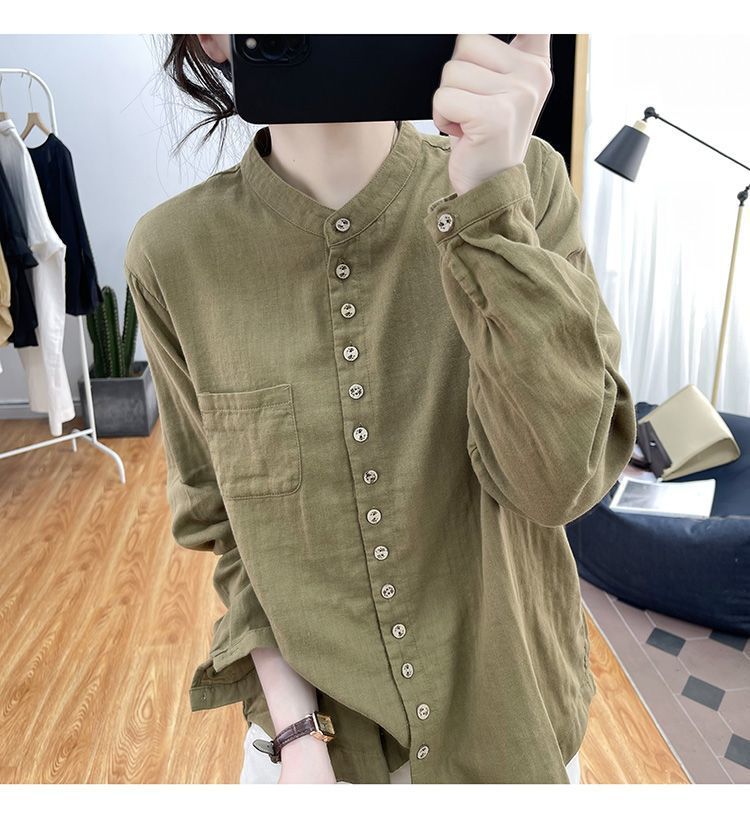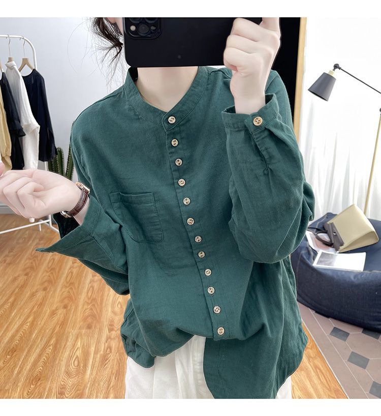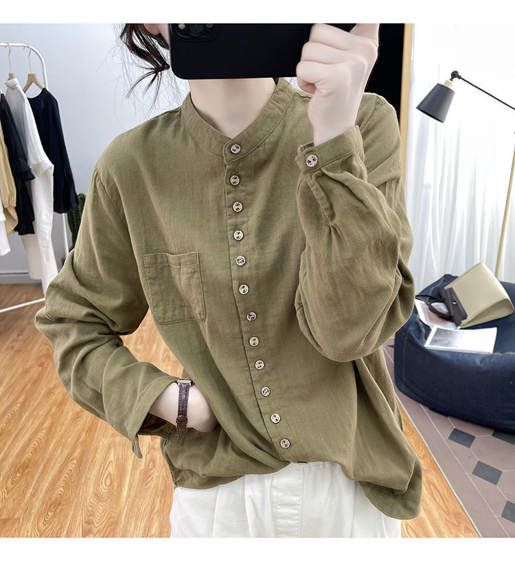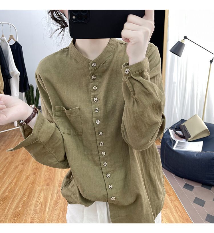 스탠드 칼라 면 긴팔 셔츠 여성용 2025 봄 한국 문학적 레트로 스타일 상의 출근용 기본 셔츠 루즈핏 셔츠스토어 가기