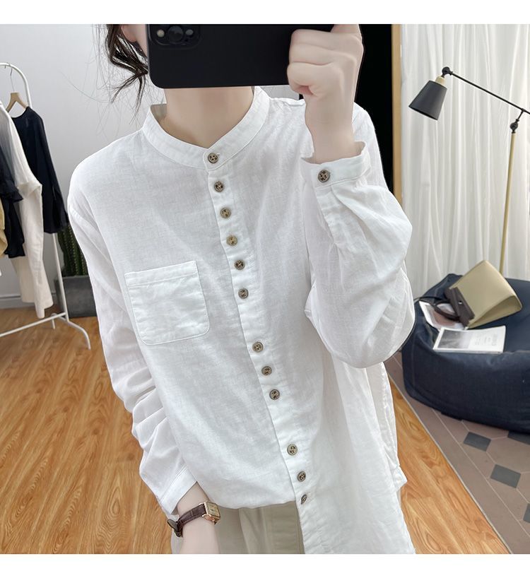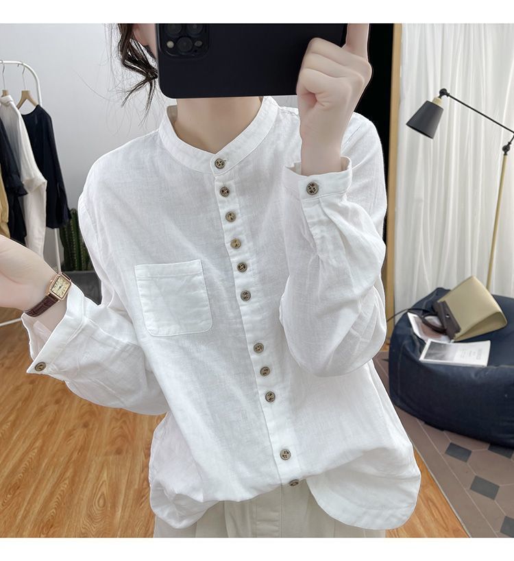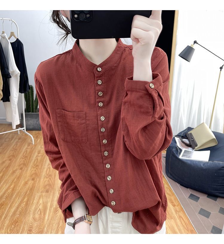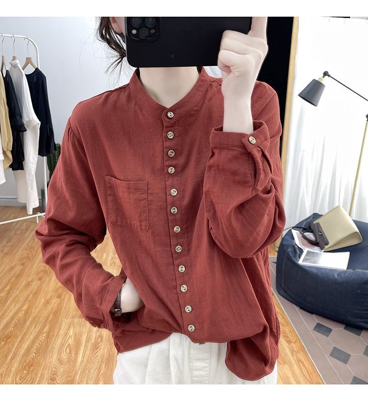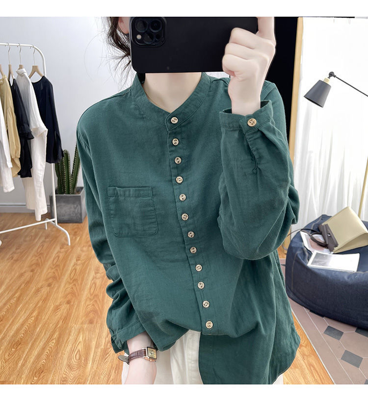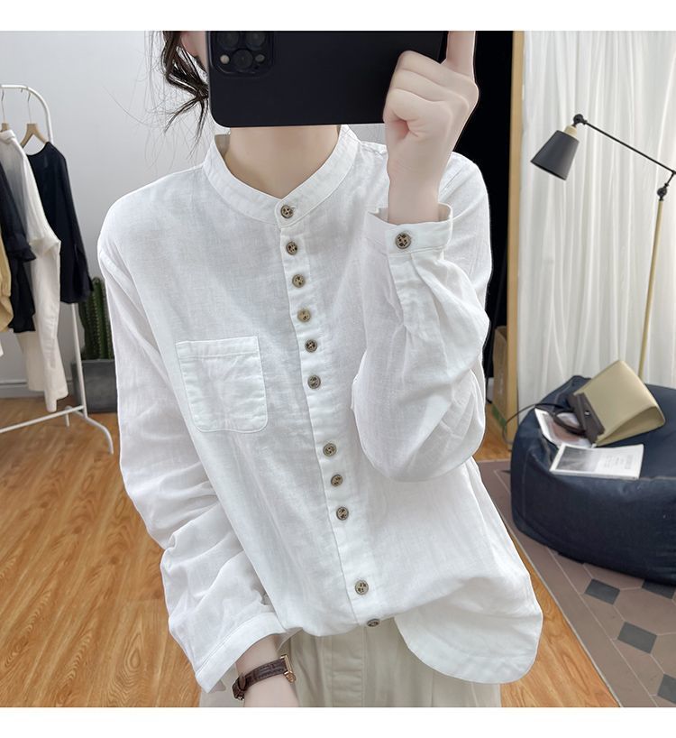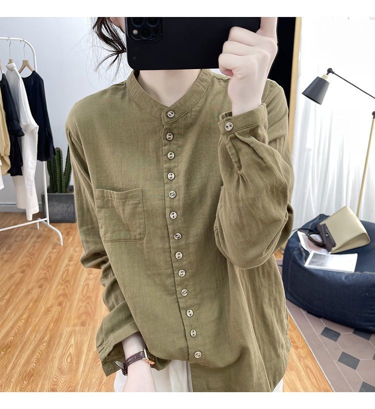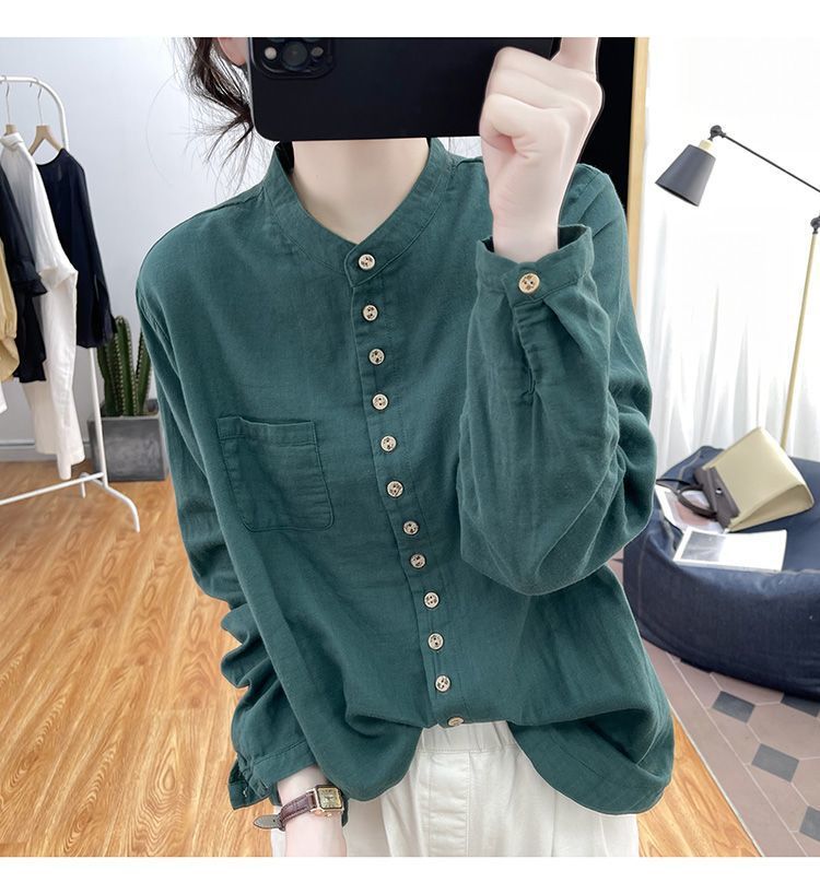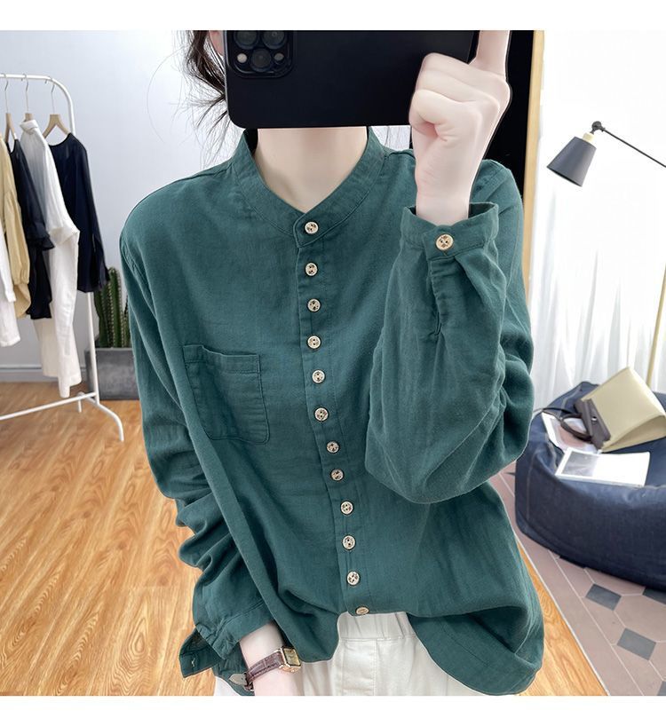 스탠드 칼라 면 긴팔 셔츠 여성용 2025 봄 한국 문학적 레트로 스타일 상의 출근용 기본 셔츠 루즈핏 셔츠스토어 가기