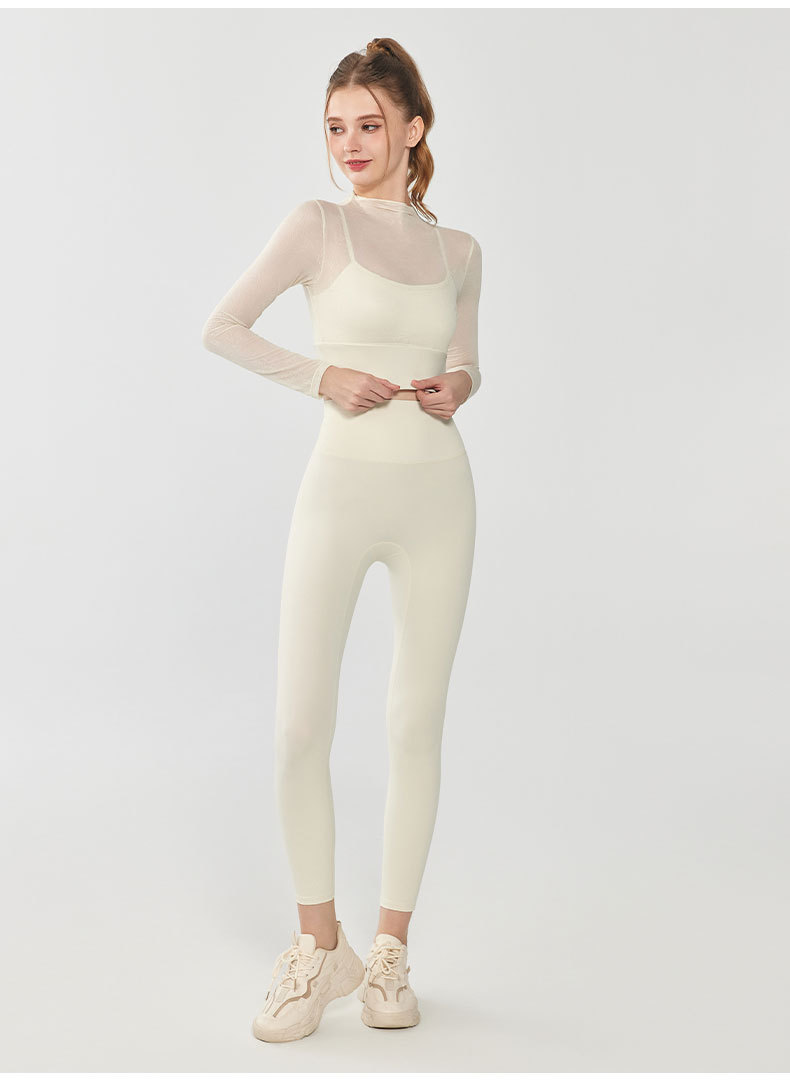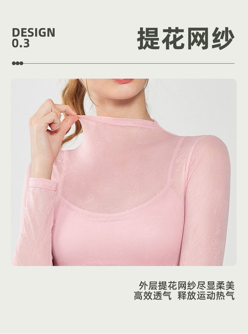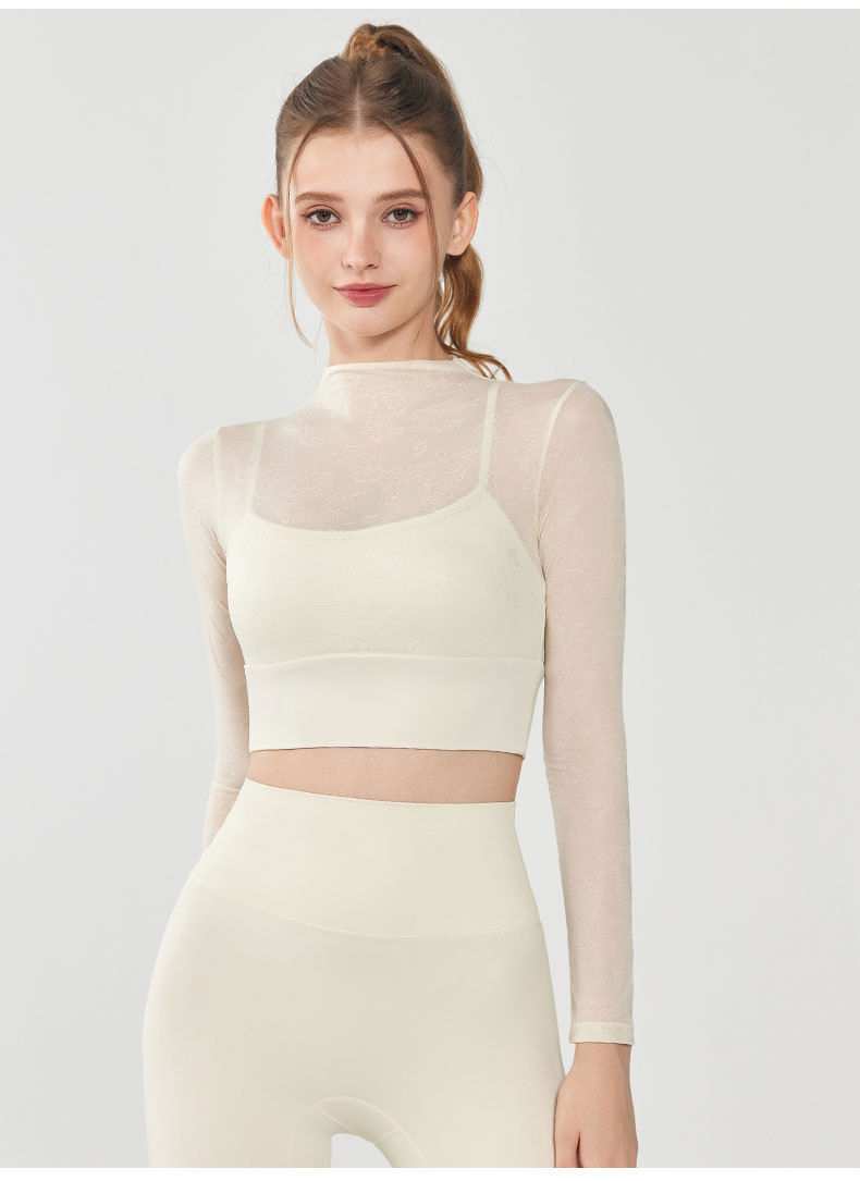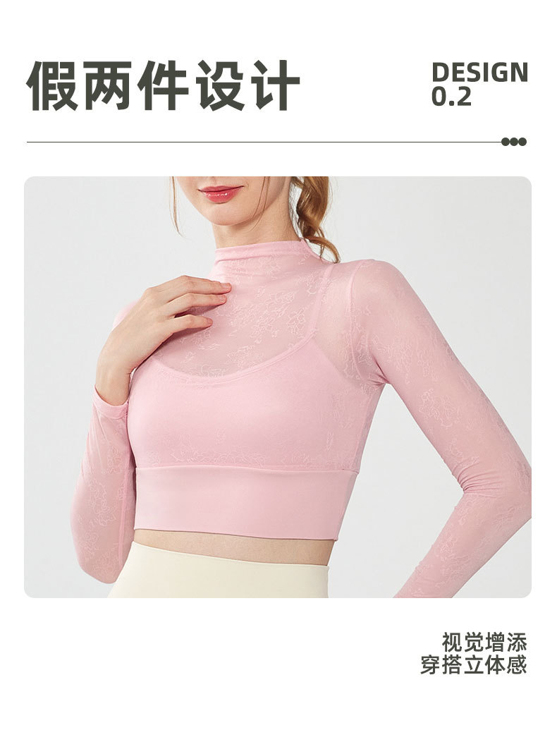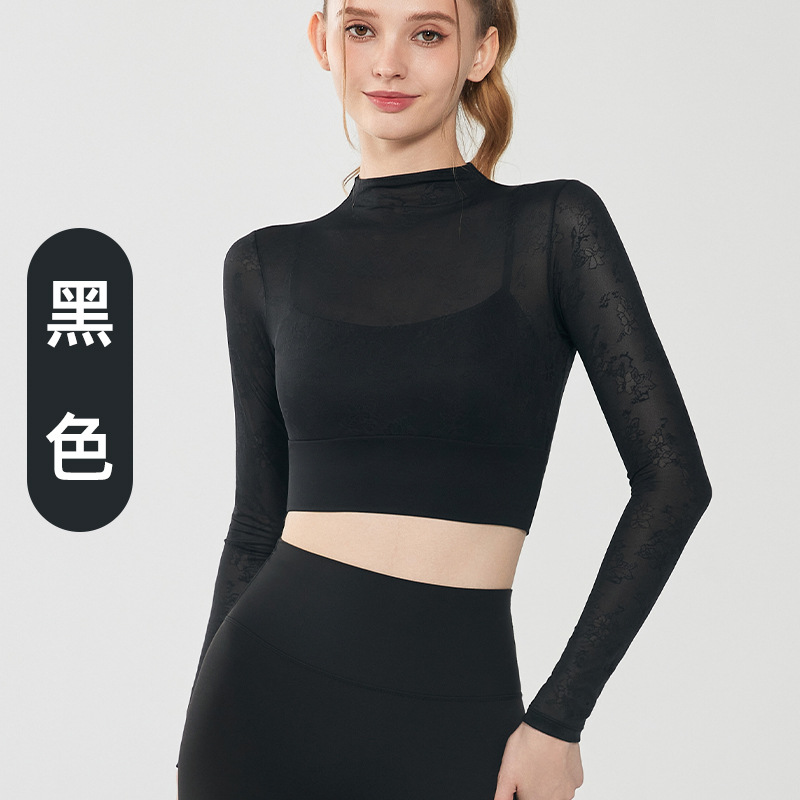 레이스 자카드 요가 옷 긴 소매 여성용 벨트 가슴 패드 고정 컵 섹시한 메쉬 통기성 달리기 피트니스 의류 최고 여성