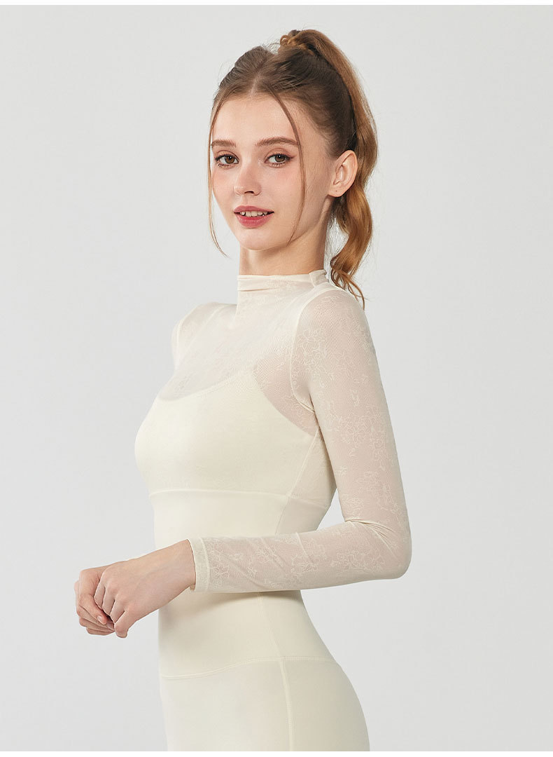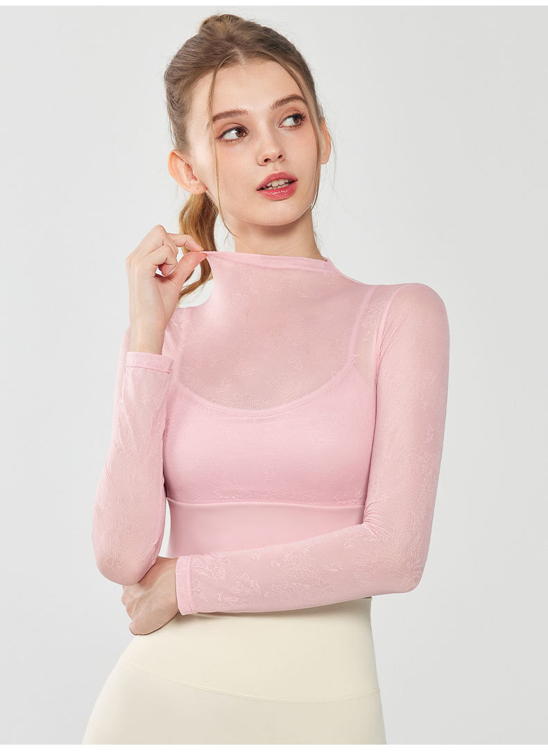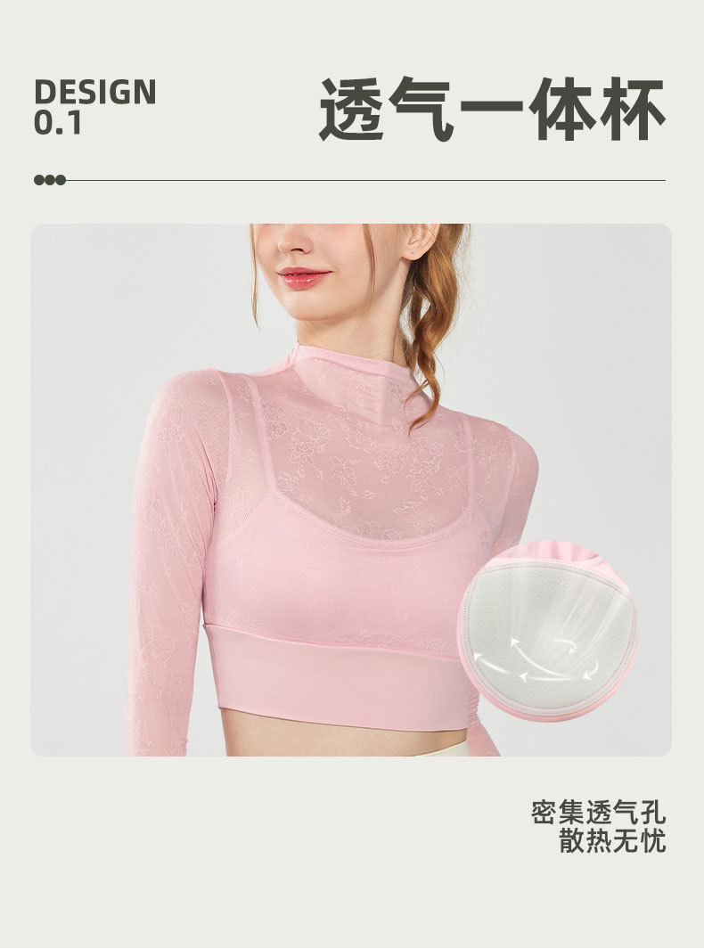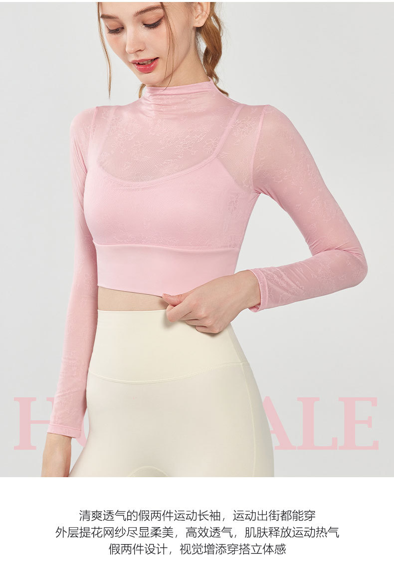 레이스 자카드 요가 옷 긴 소매 여성용 벨트 가슴 패드 고정 컵 섹시한 메쉬 통기성 달리기 피트니스 의류 최고 여성스토어 가기