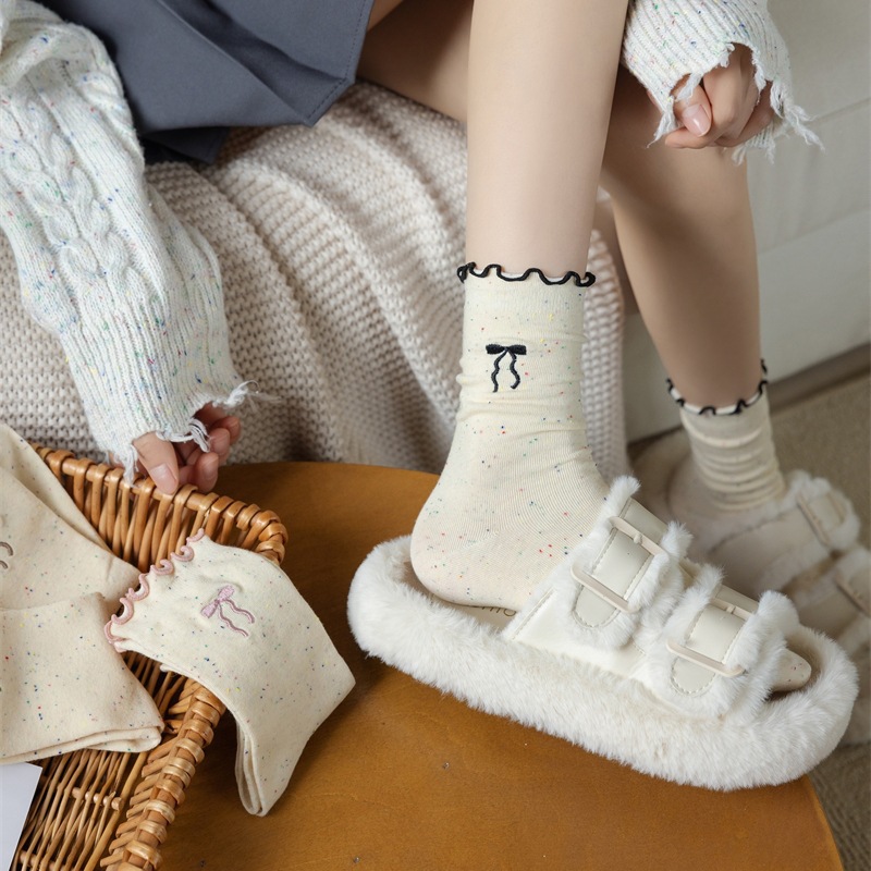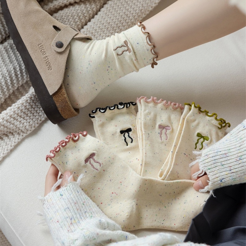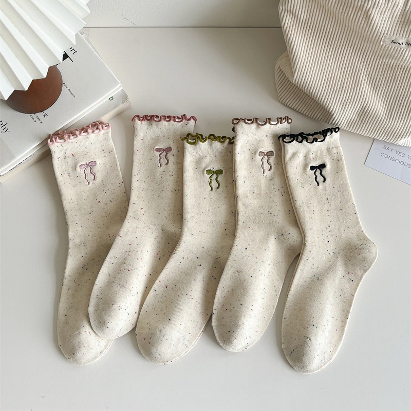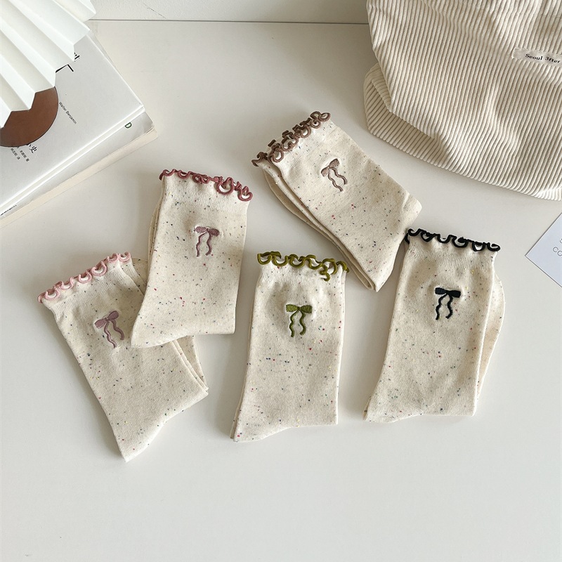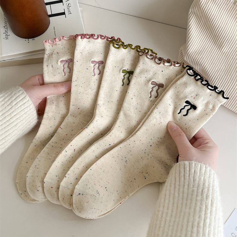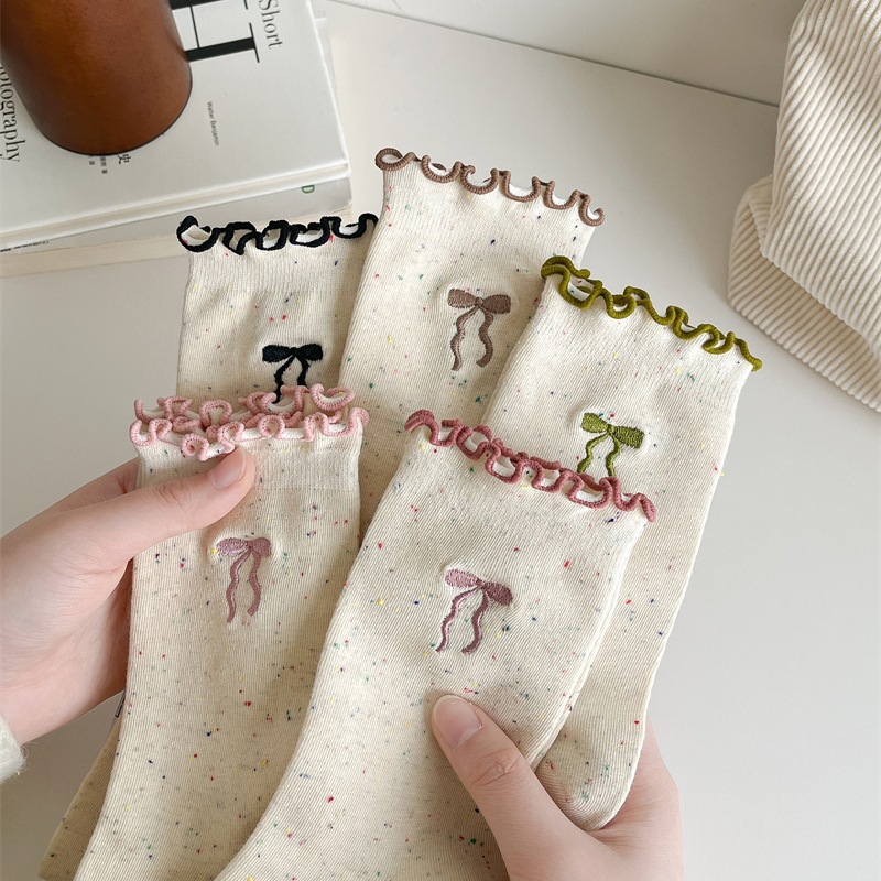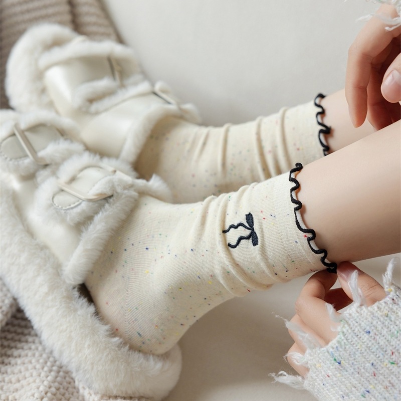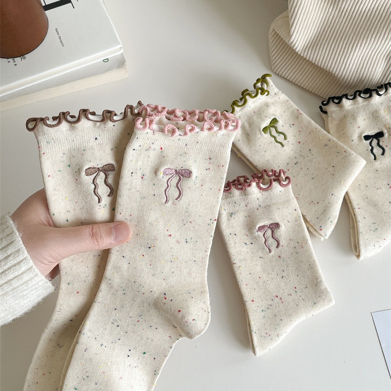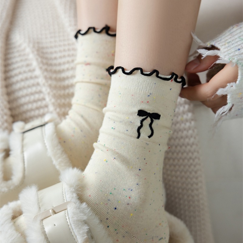 레이스 활 자수 양말 어린이 미드 양말 Ins 유행 일본식 칼리지 스타일 귀 가장자리 도트 원사 스택 양말