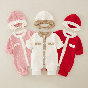 婴儿秋季小香风针织粉色红色衣服新生儿连体衣爬爬服男女宝宝秋装