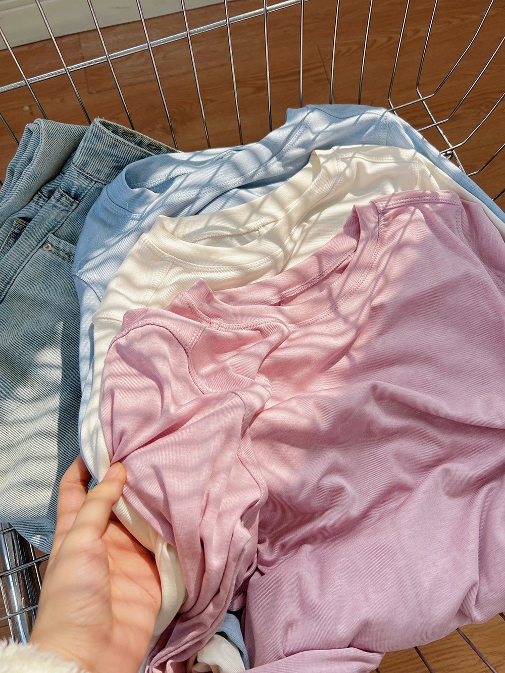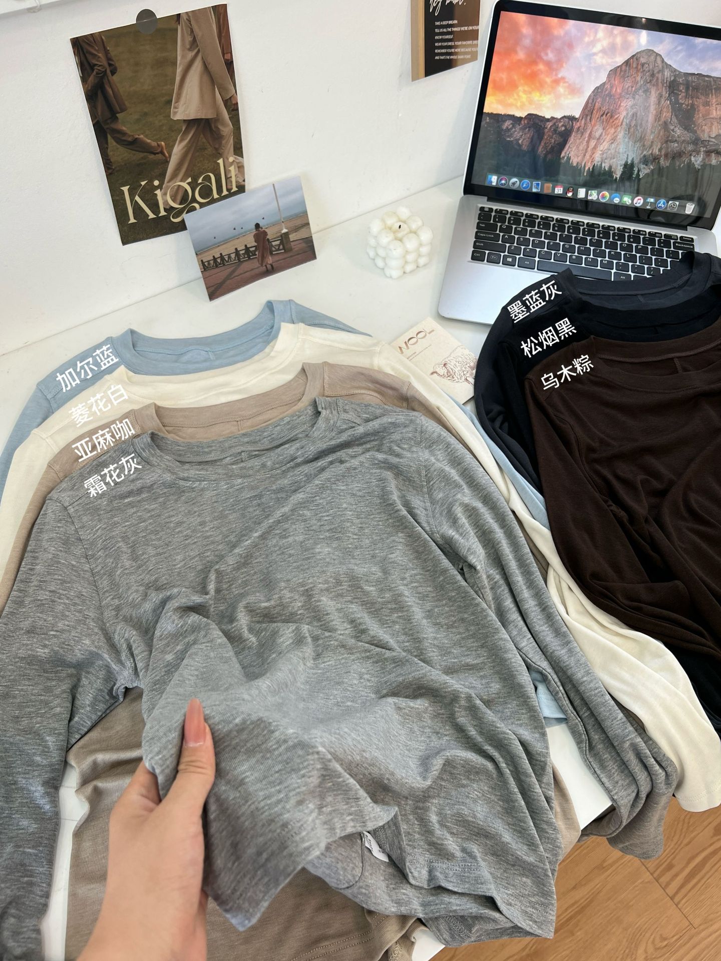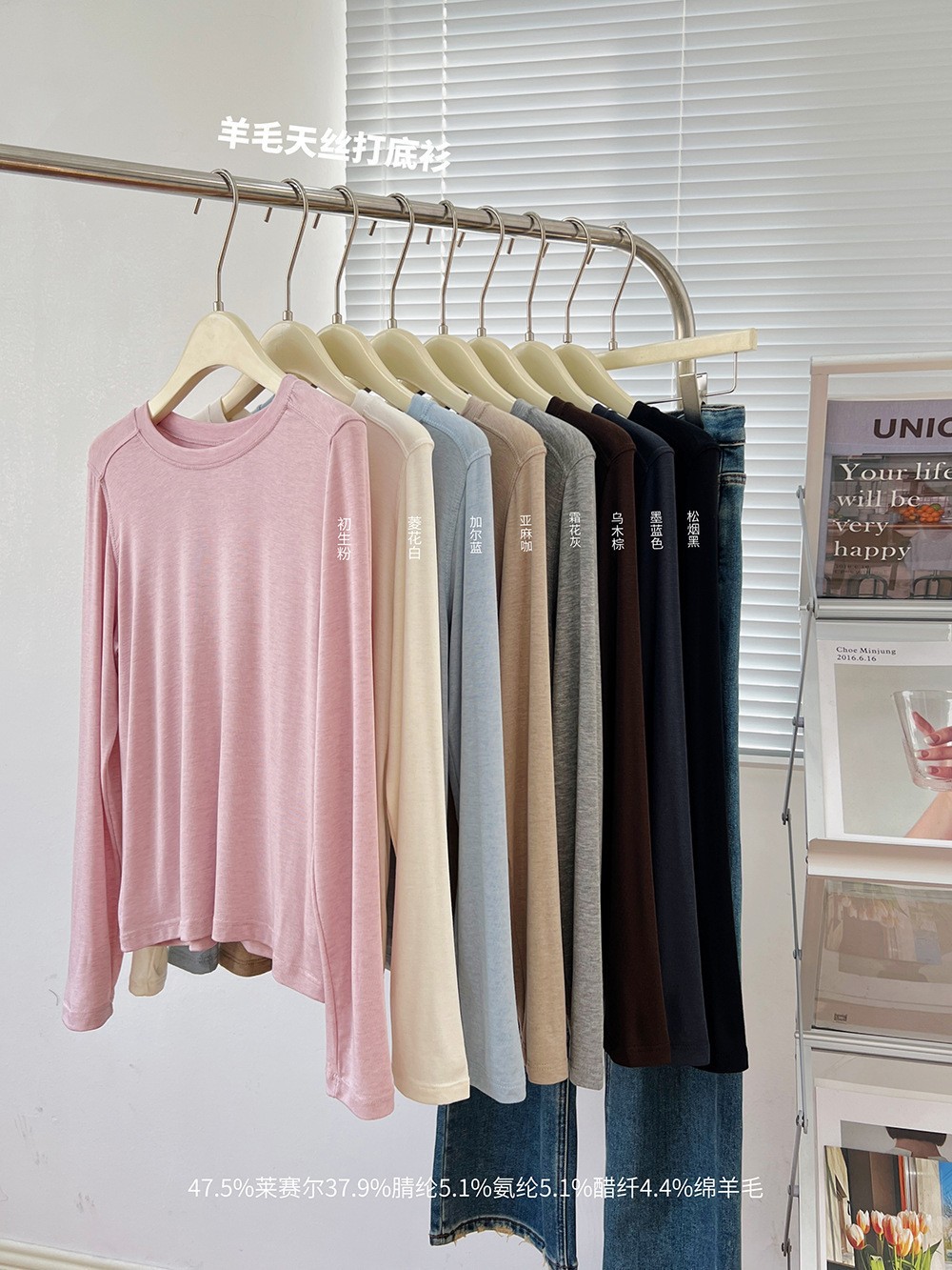 Lyocell 아세테이트 양모 원단베이스 셔츠 작은 둥근 목 긴 소매 여성의 단색 한국 스타일의 내부와 외부 착용 작은 티셔츠스토어 가기
