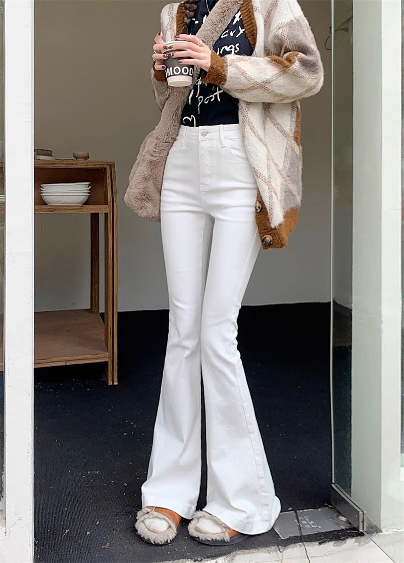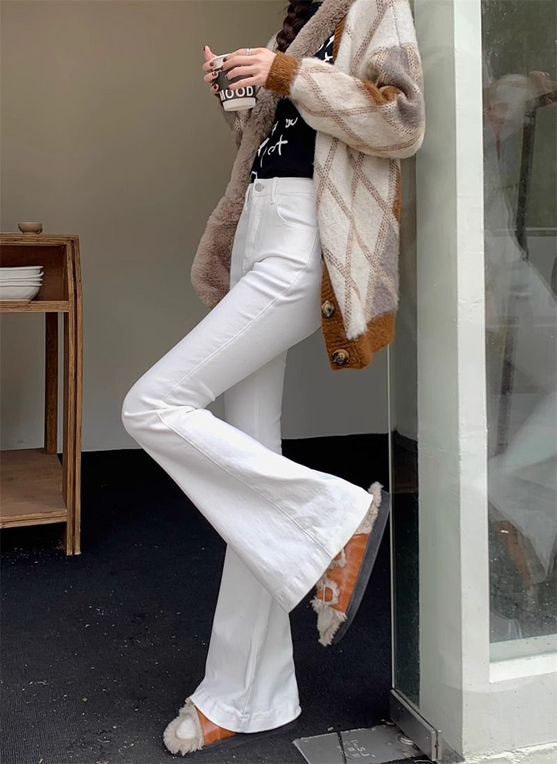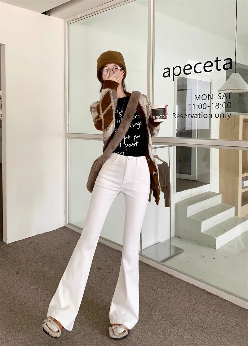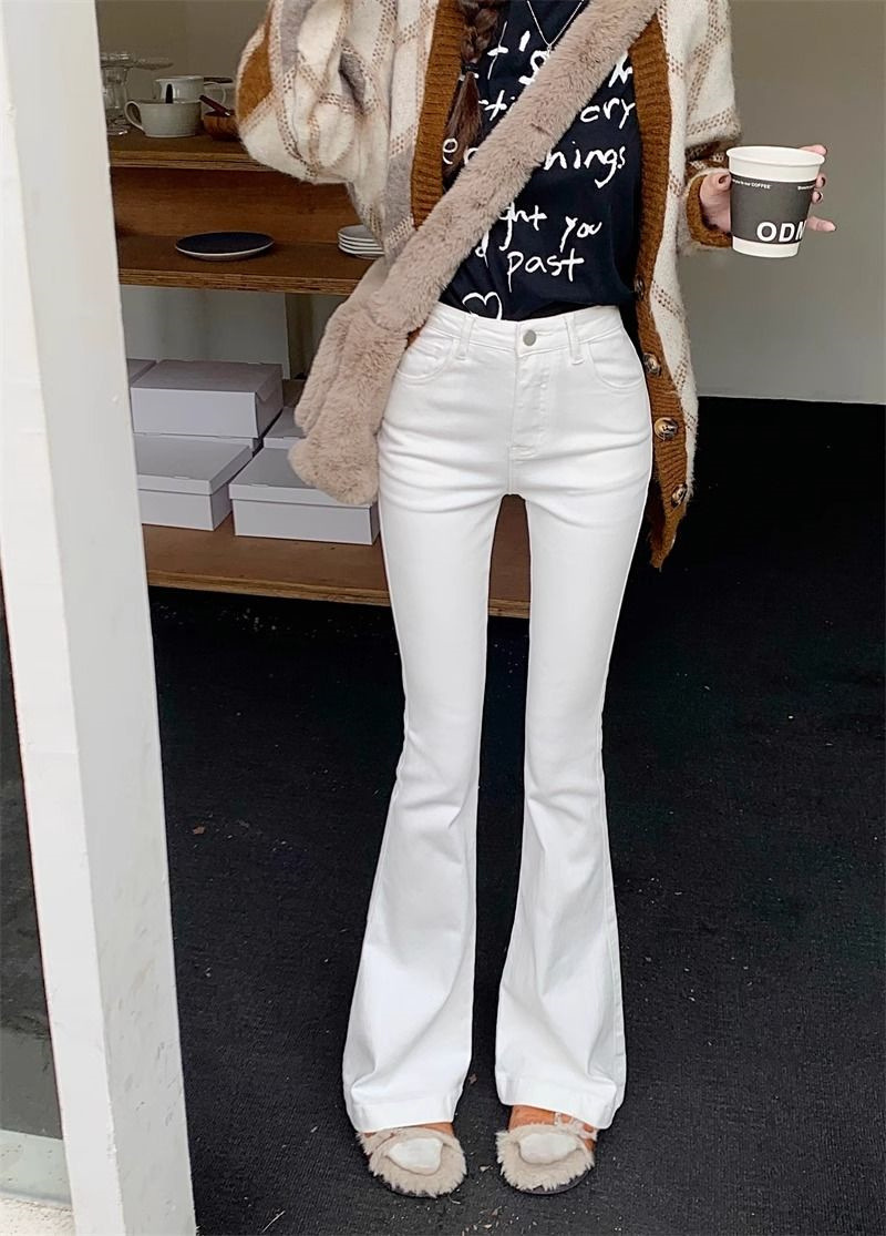 몸집이 작은 여성을 위한 화이트 부츠컷 청바지, 슬림핏, 신축성 있는 말굽팬츠, 하이웨이스트, 와이드레그, 부츠컷팬츠스토어 가기