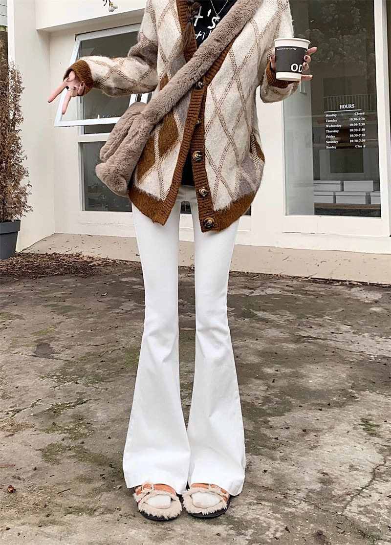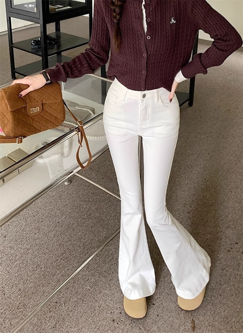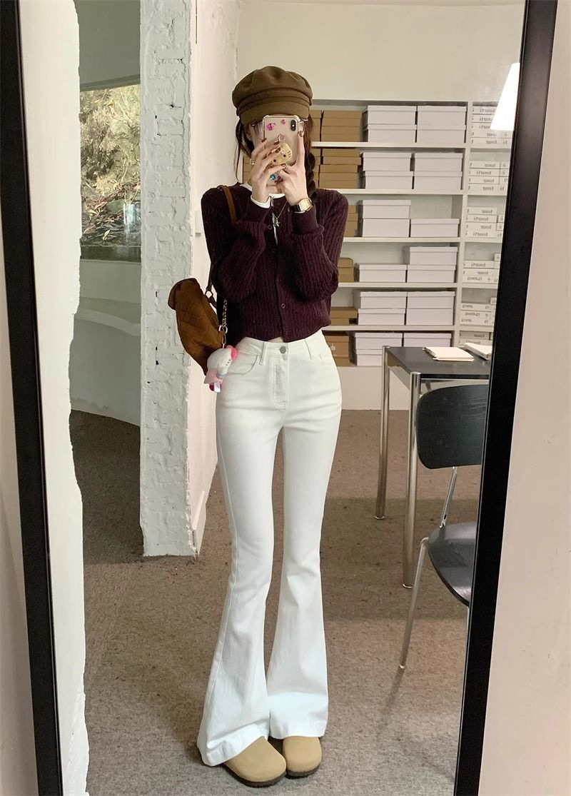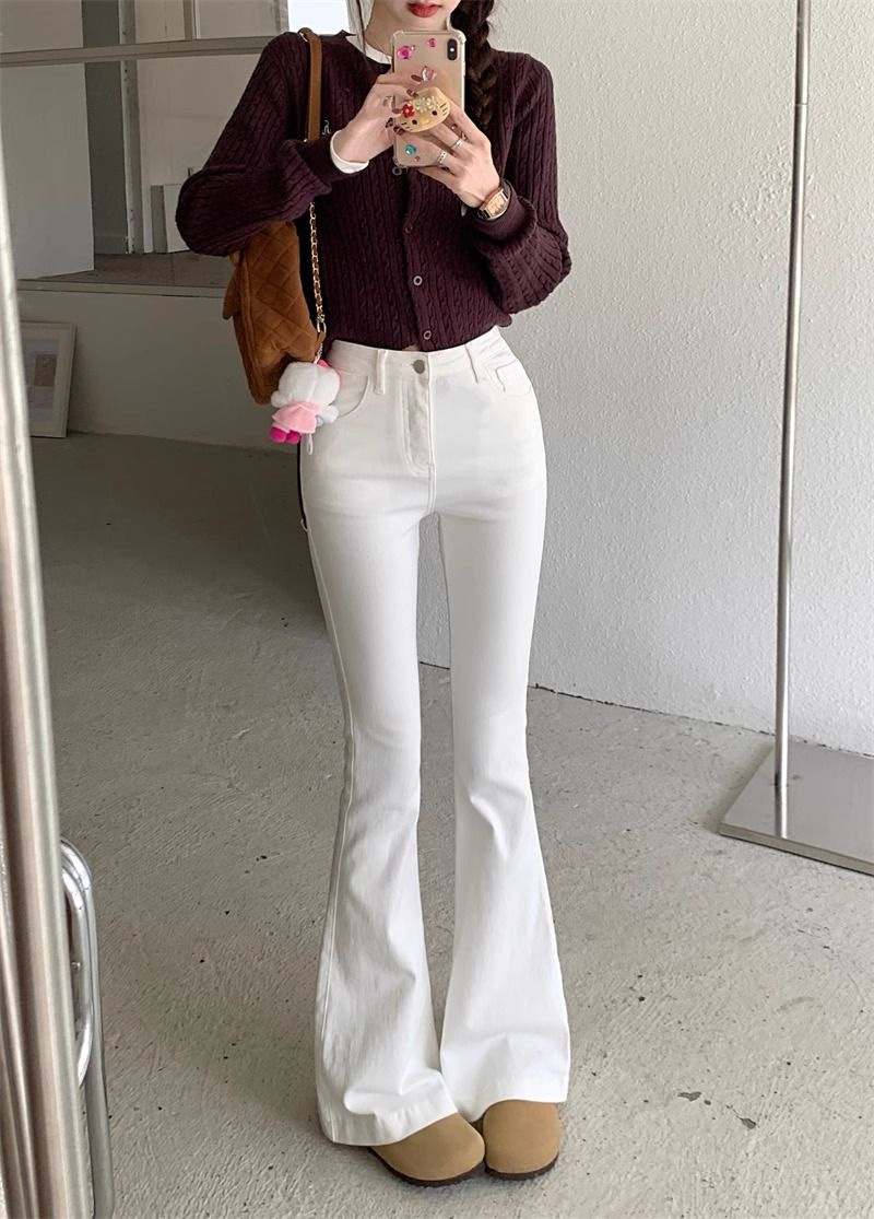 몸집이 작은 여성을 위한 화이트 부츠컷 청바지, 슬림핏, 신축성 있는 말굽팬츠, 하이웨이스트, 와이드레그, 부츠컷팬츠스토어 가기