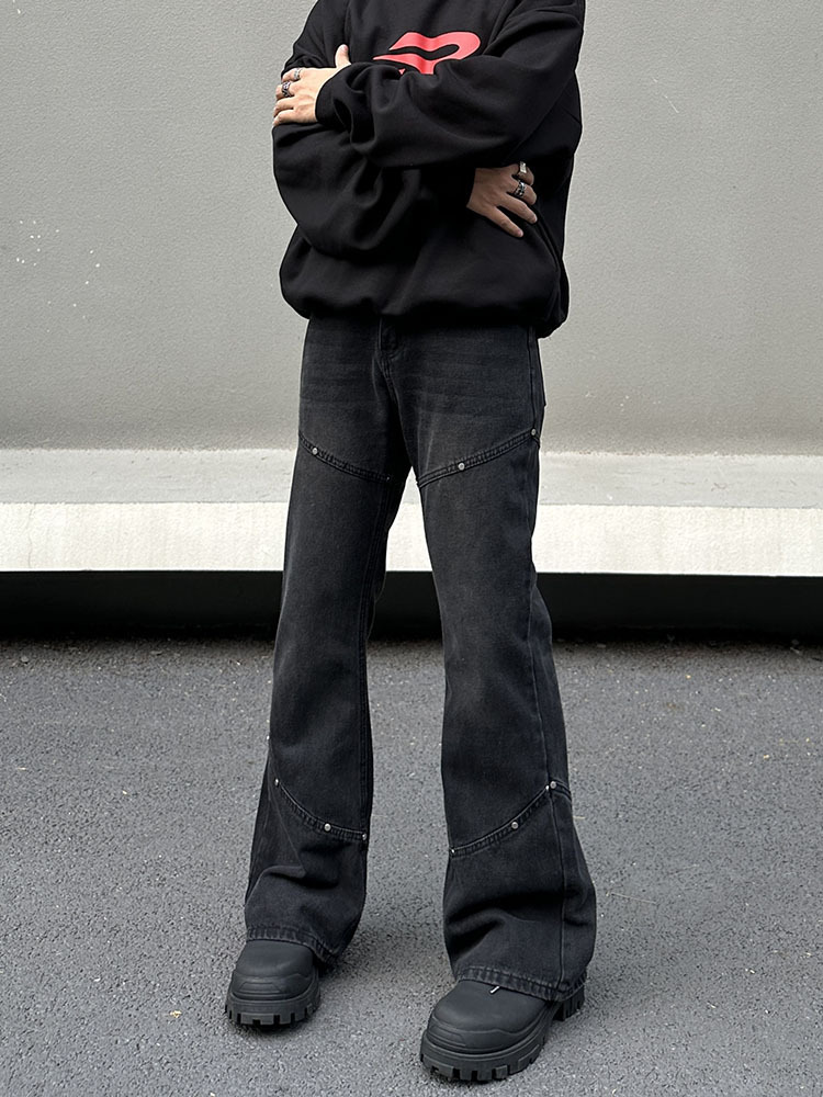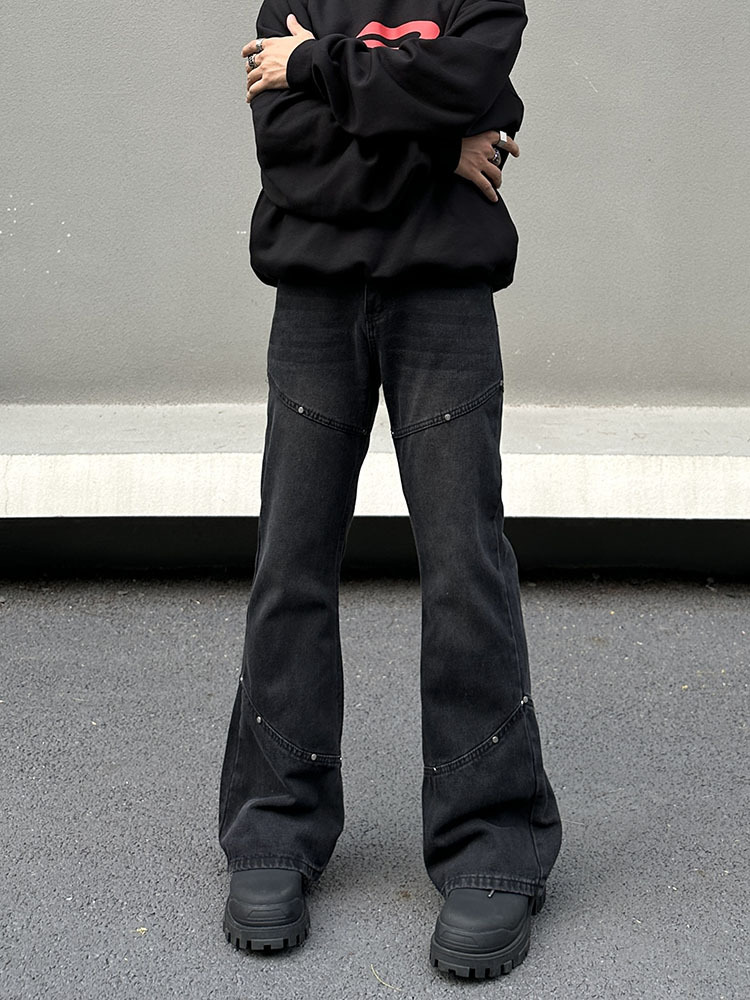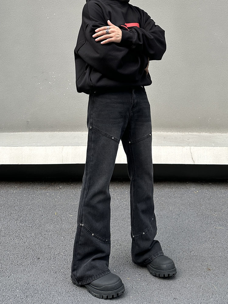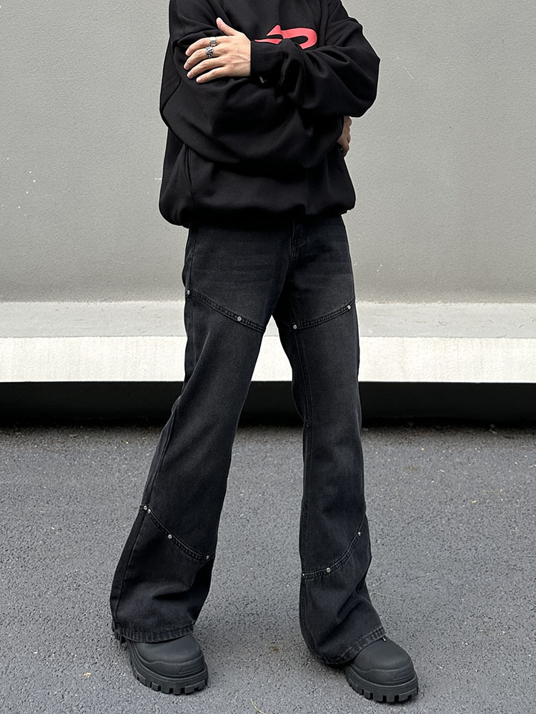 블랙 하이 스트리트 아메리칸 스타일 레트로 청바지 남성용 트렌디 브랜드 리벳 스티칭 바이브 레이드 백 루즈 워킹 와이드 레그