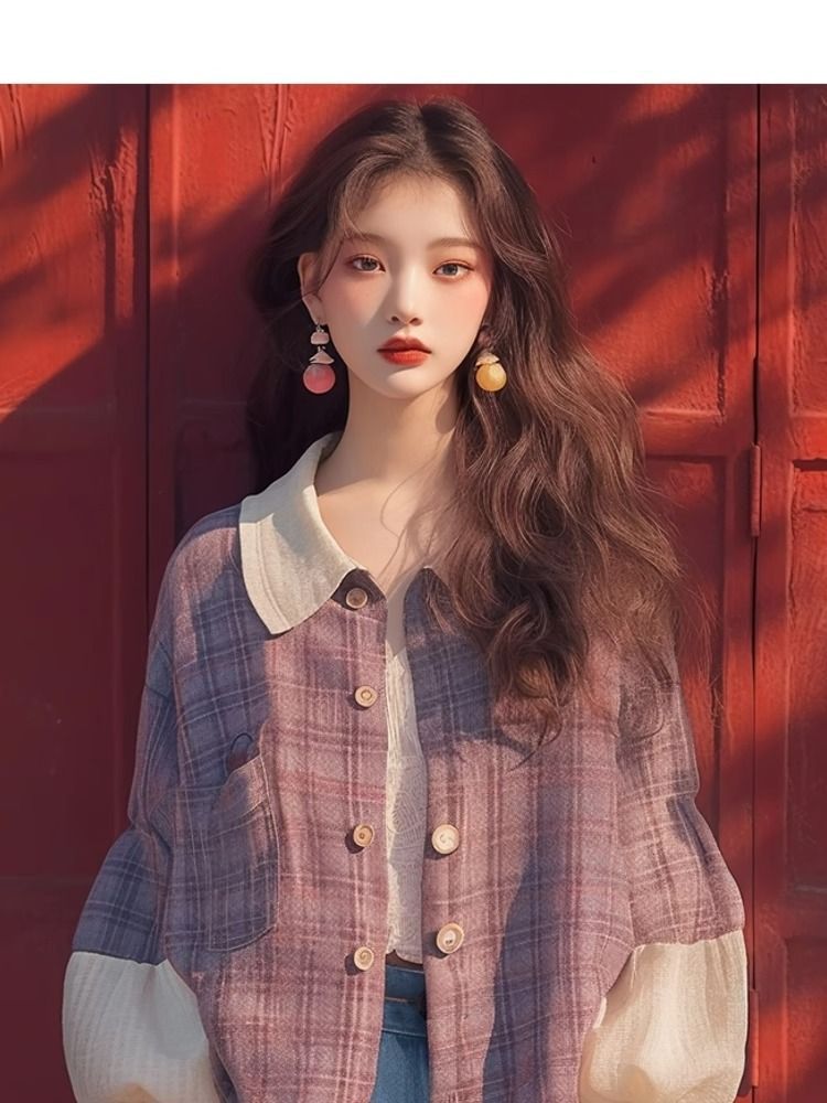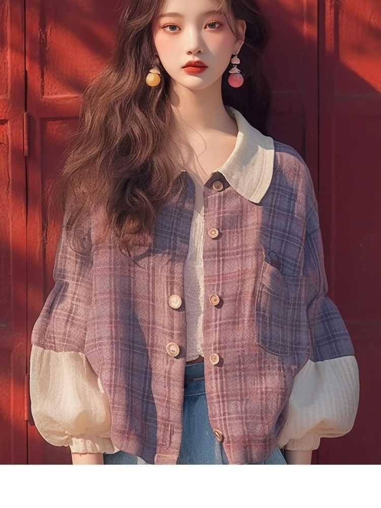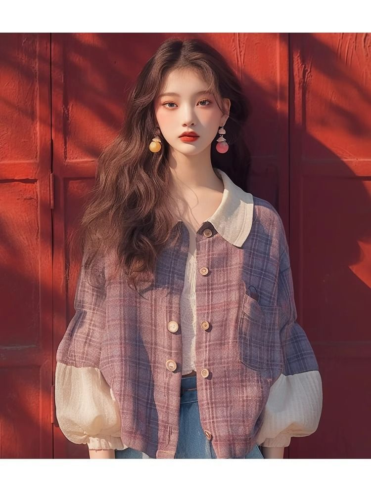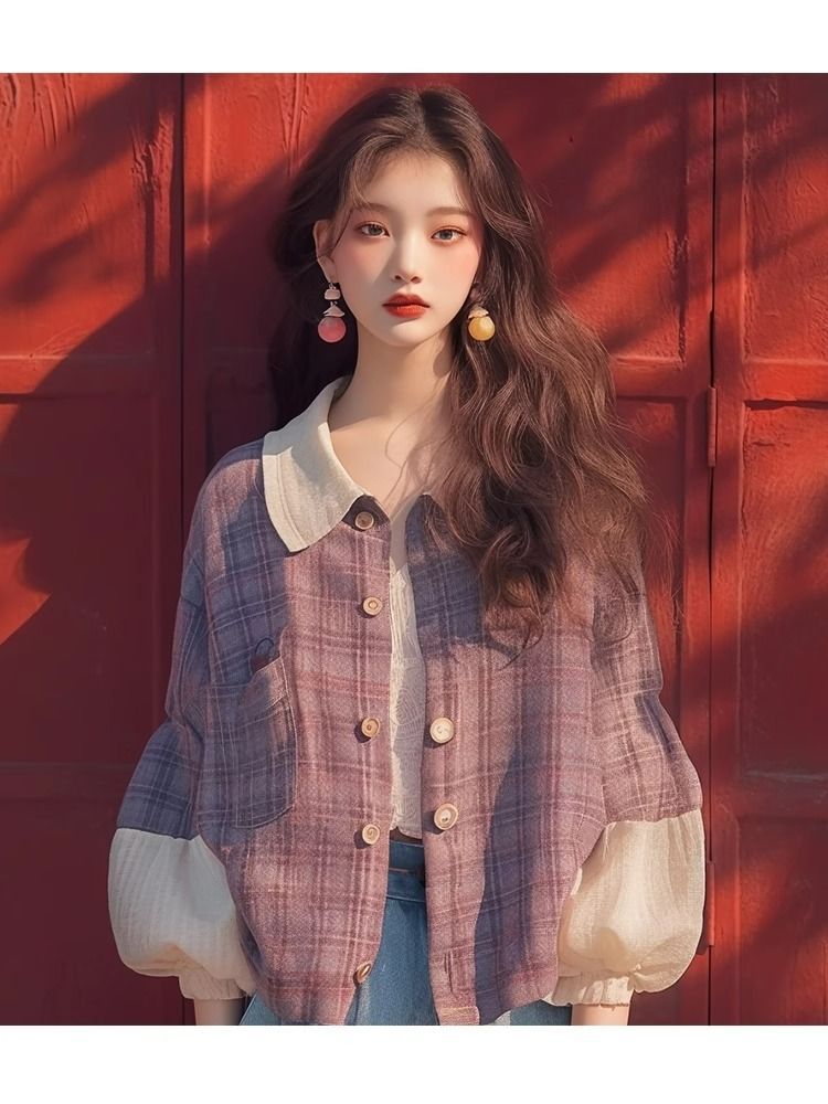 이른 가을 새로운 독특한 슈퍼 잘 생긴 탑 한국 스타일 게으른 스타일 보라색 격자 무늬 퍼프 슬리브 셔츠 코트 여성