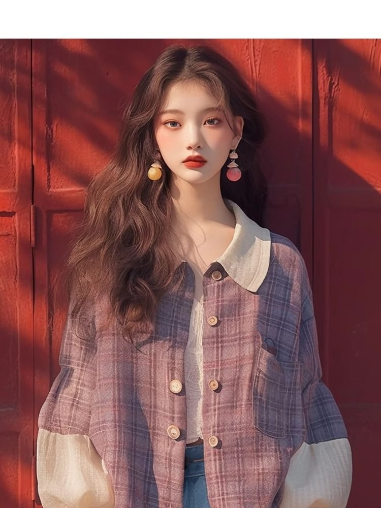 이른 가을 새로운 독특한 슈퍼 잘 생긴 탑 한국 스타일 게으른 스타일 보라색 격자 무늬 퍼프 슬리브 셔츠 코트 여성스토어 가기