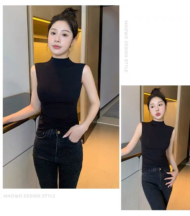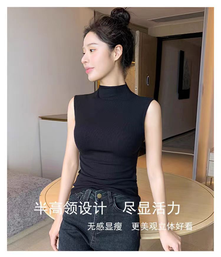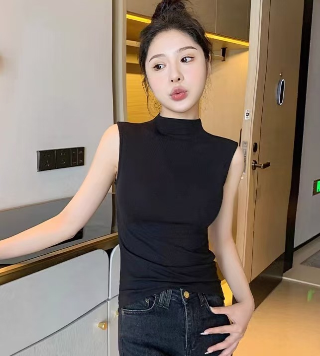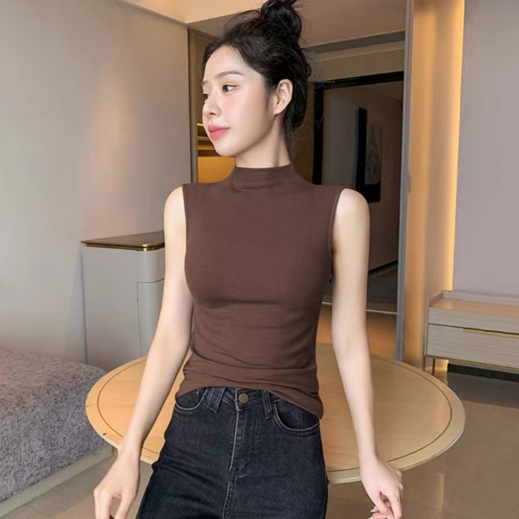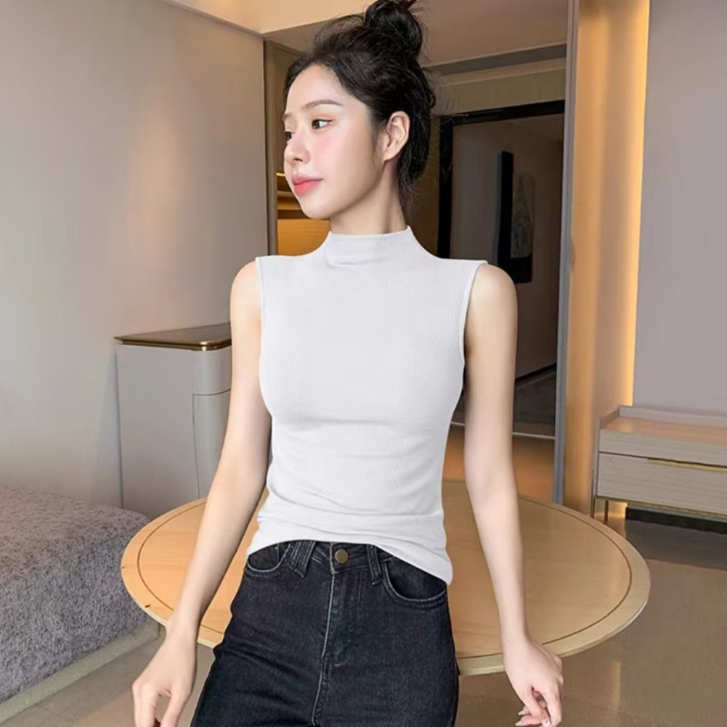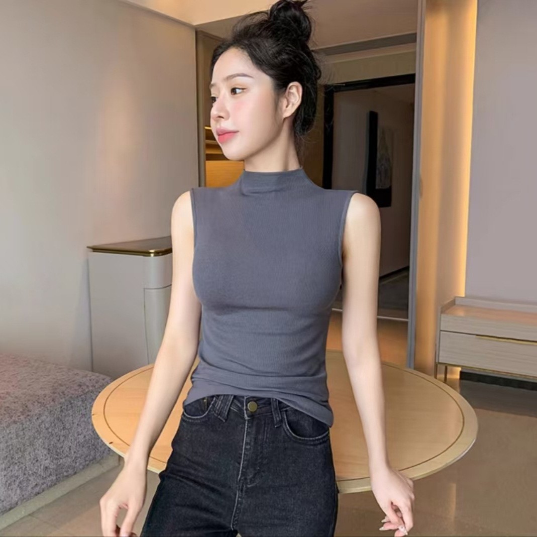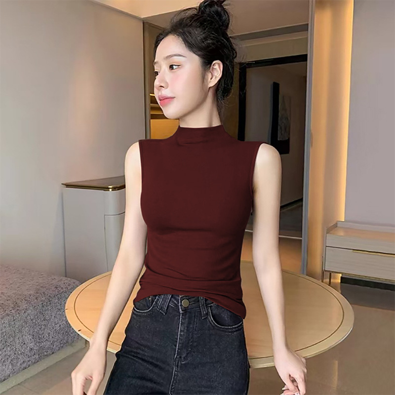 하프 하이 칼라 민소매 안코라 레드 조끼 여성 여름 아우터웨어 2024 새로운 내베이스 셔츠 슬림 핏 탑