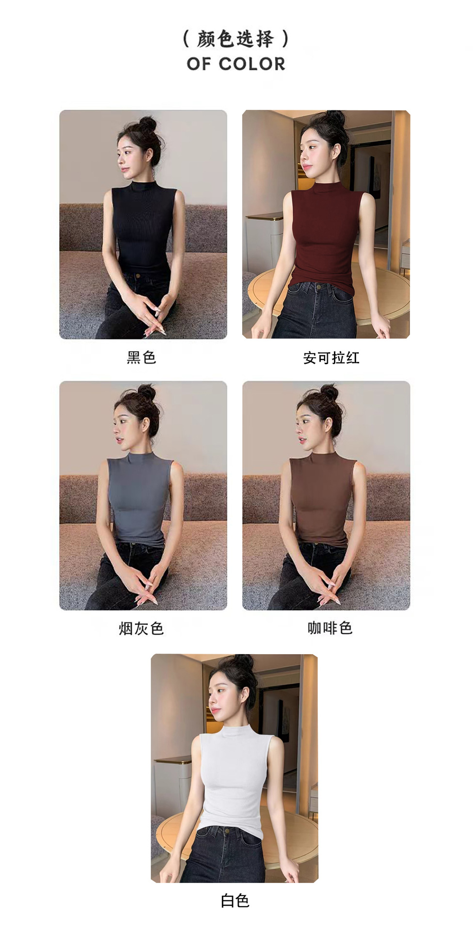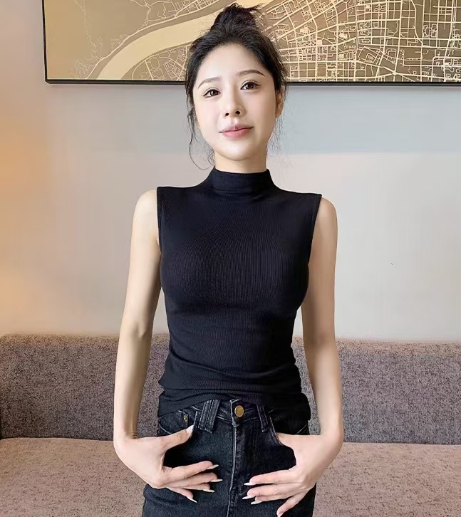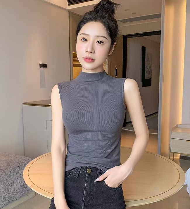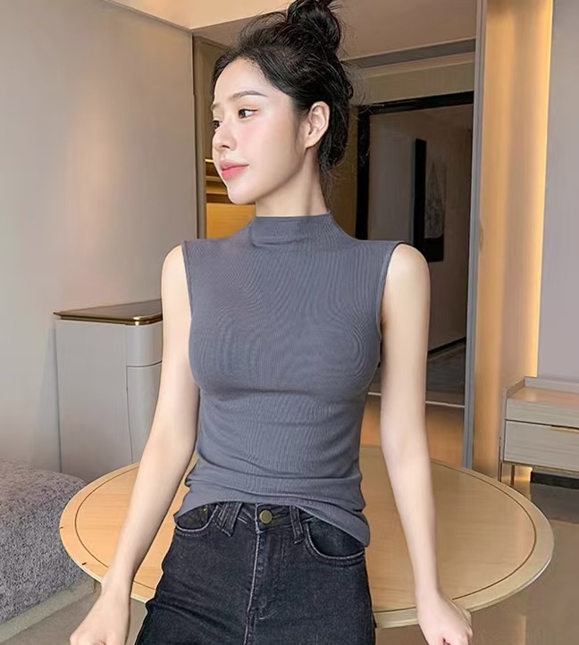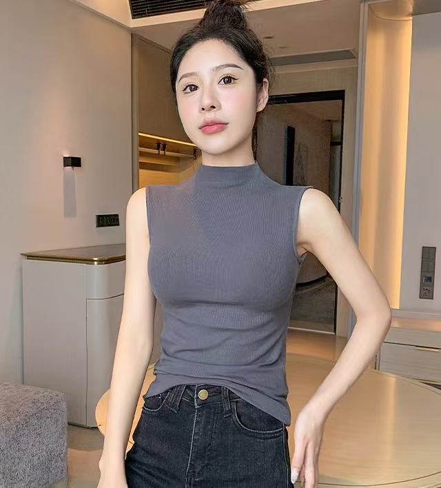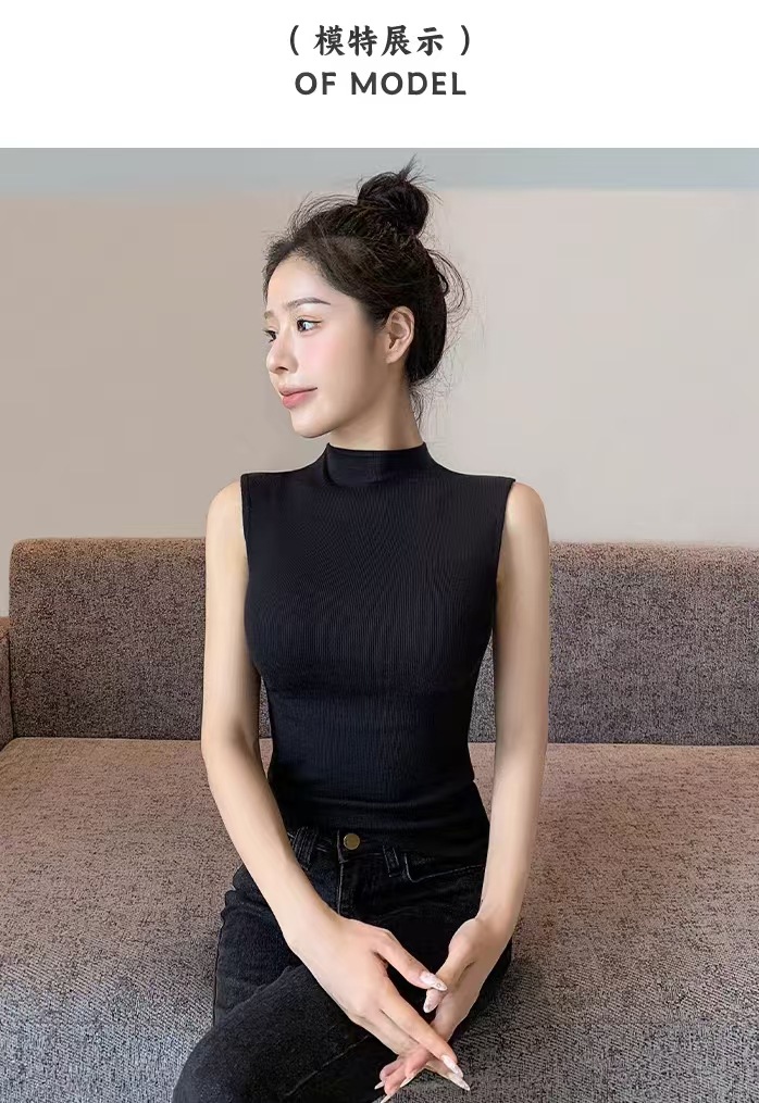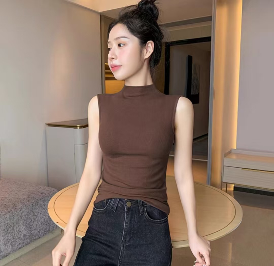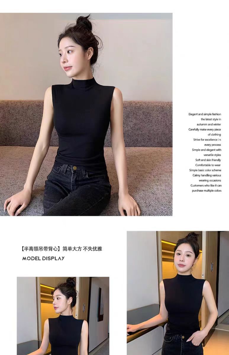 하프 하이 칼라 민소매 안코라 레드 조끼 여성 여름 아우터웨어 2024 새로운 내베이스 셔츠 슬림 핏 탑