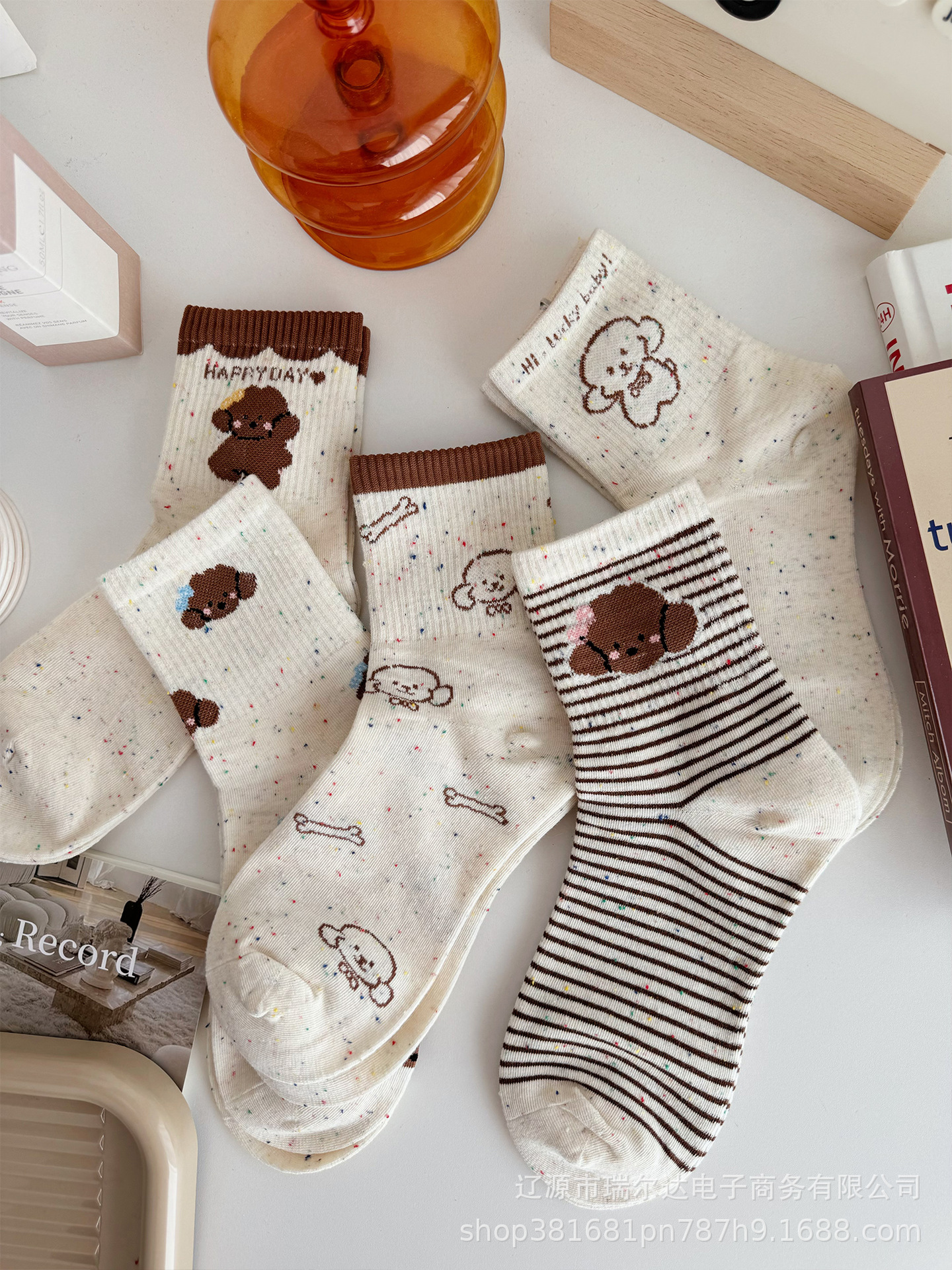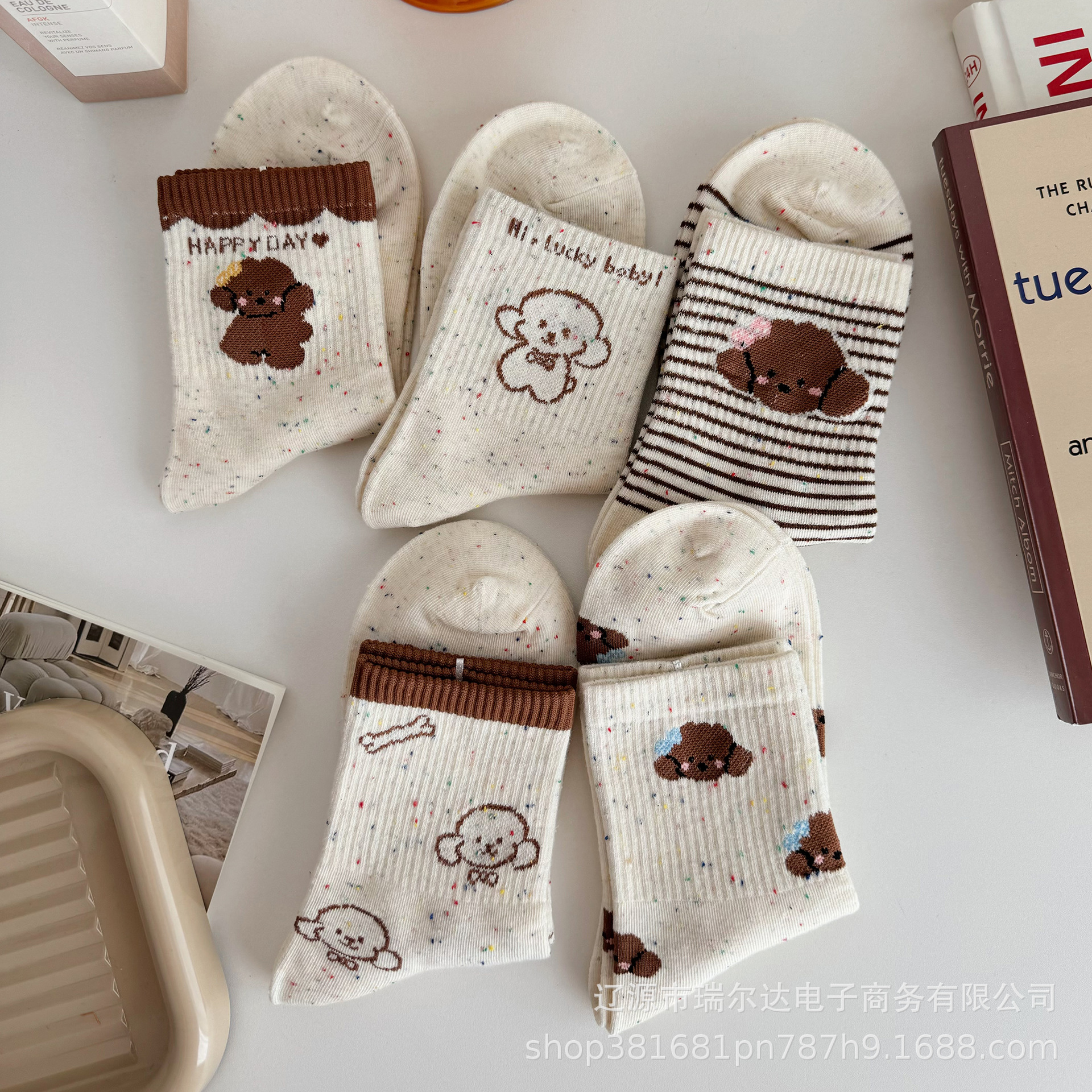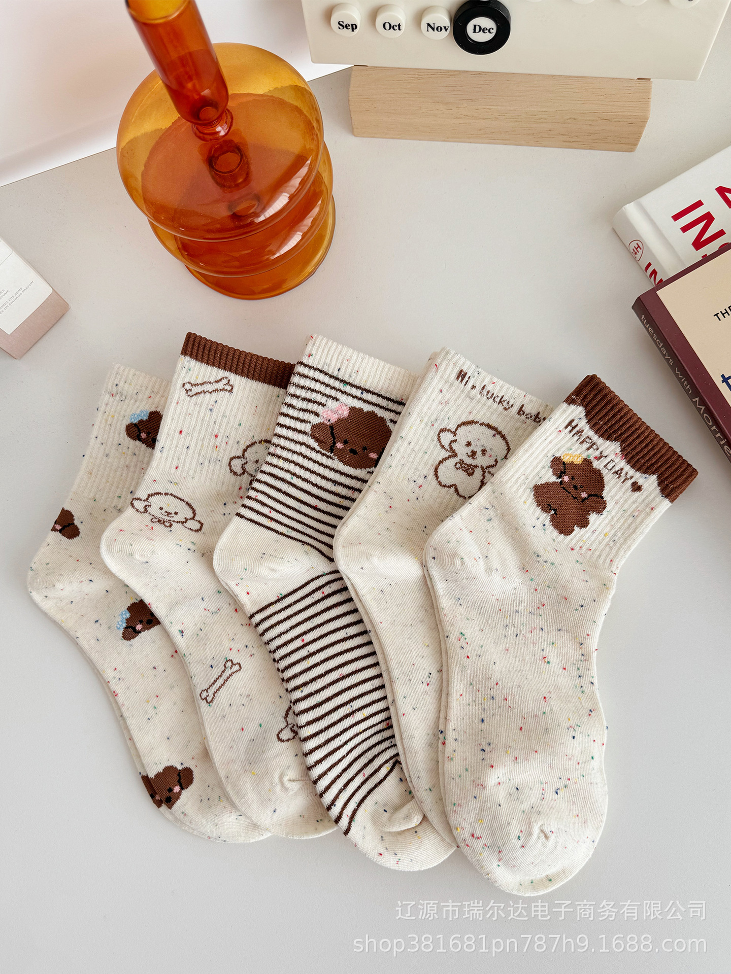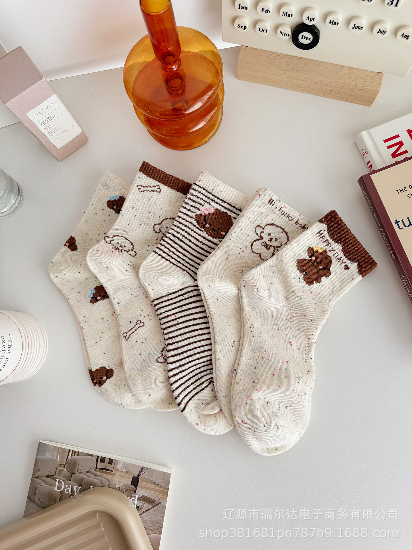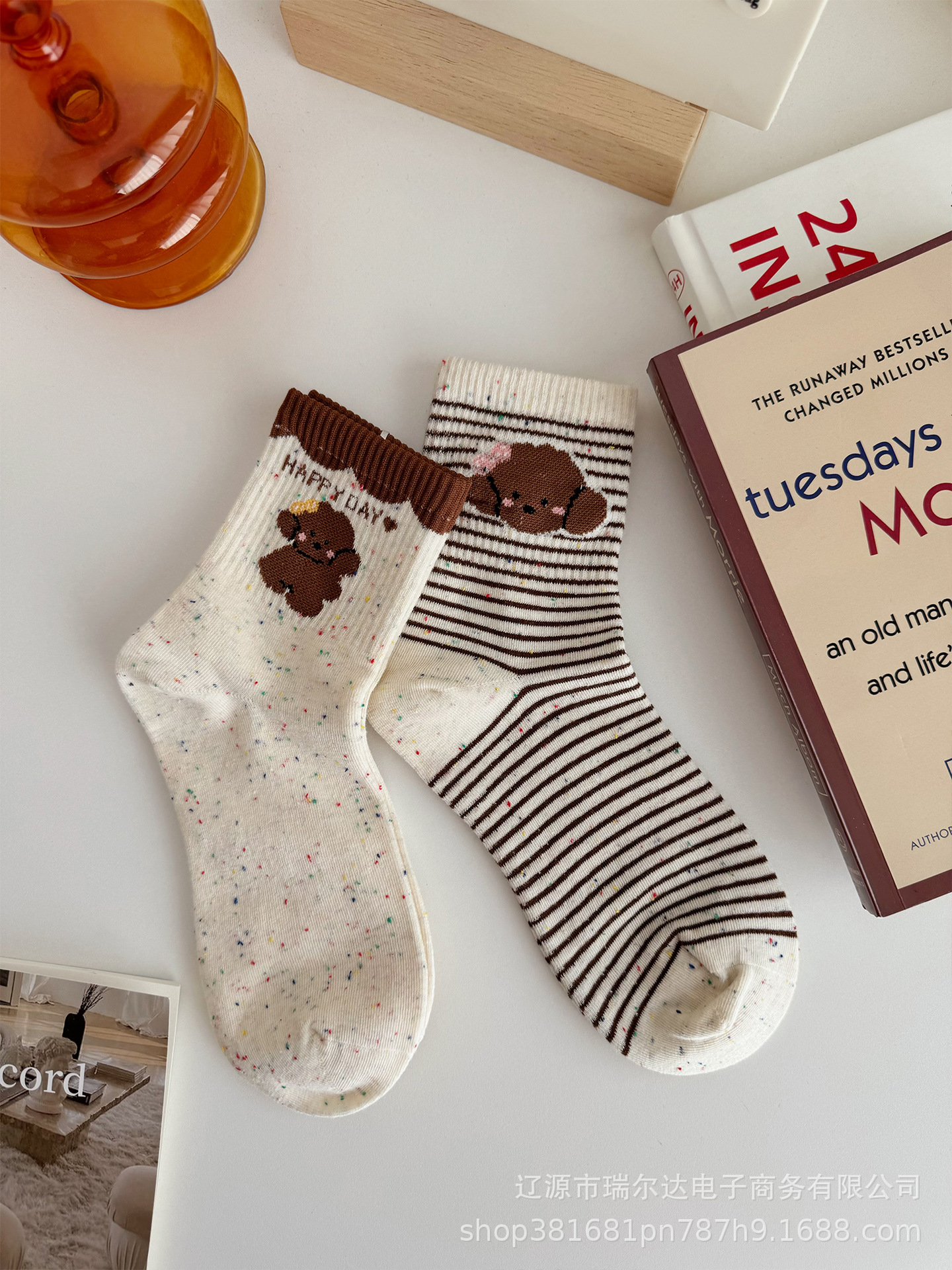한국 스타일 Instagram 스타일 유행 만화 개 도트 원사 다크 브라운 스타일 양말 여성 중형 튜브 달콤한 귀여운 소녀의 줄무늬 면 양말