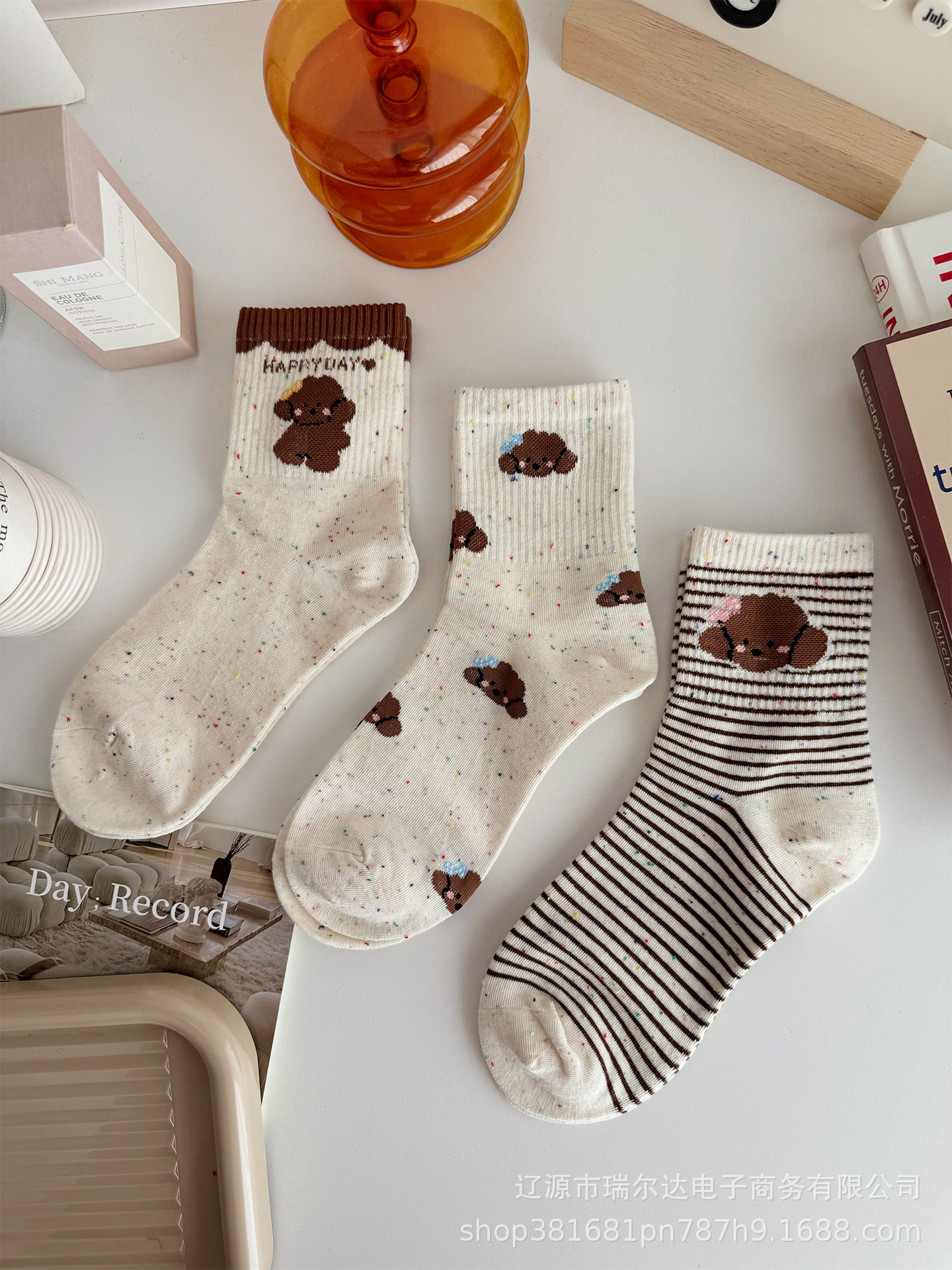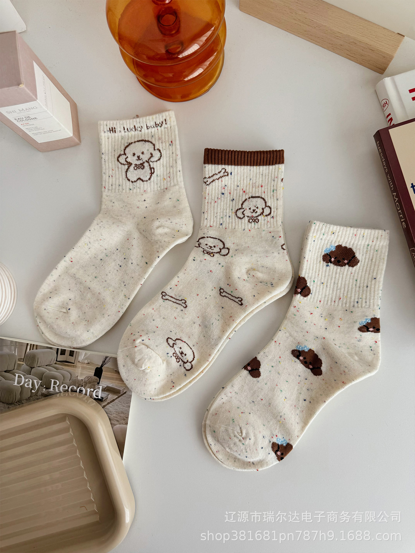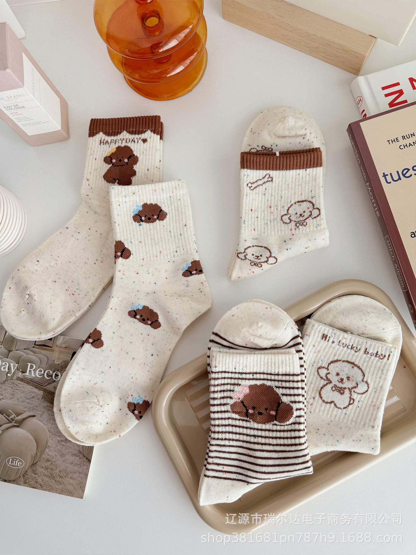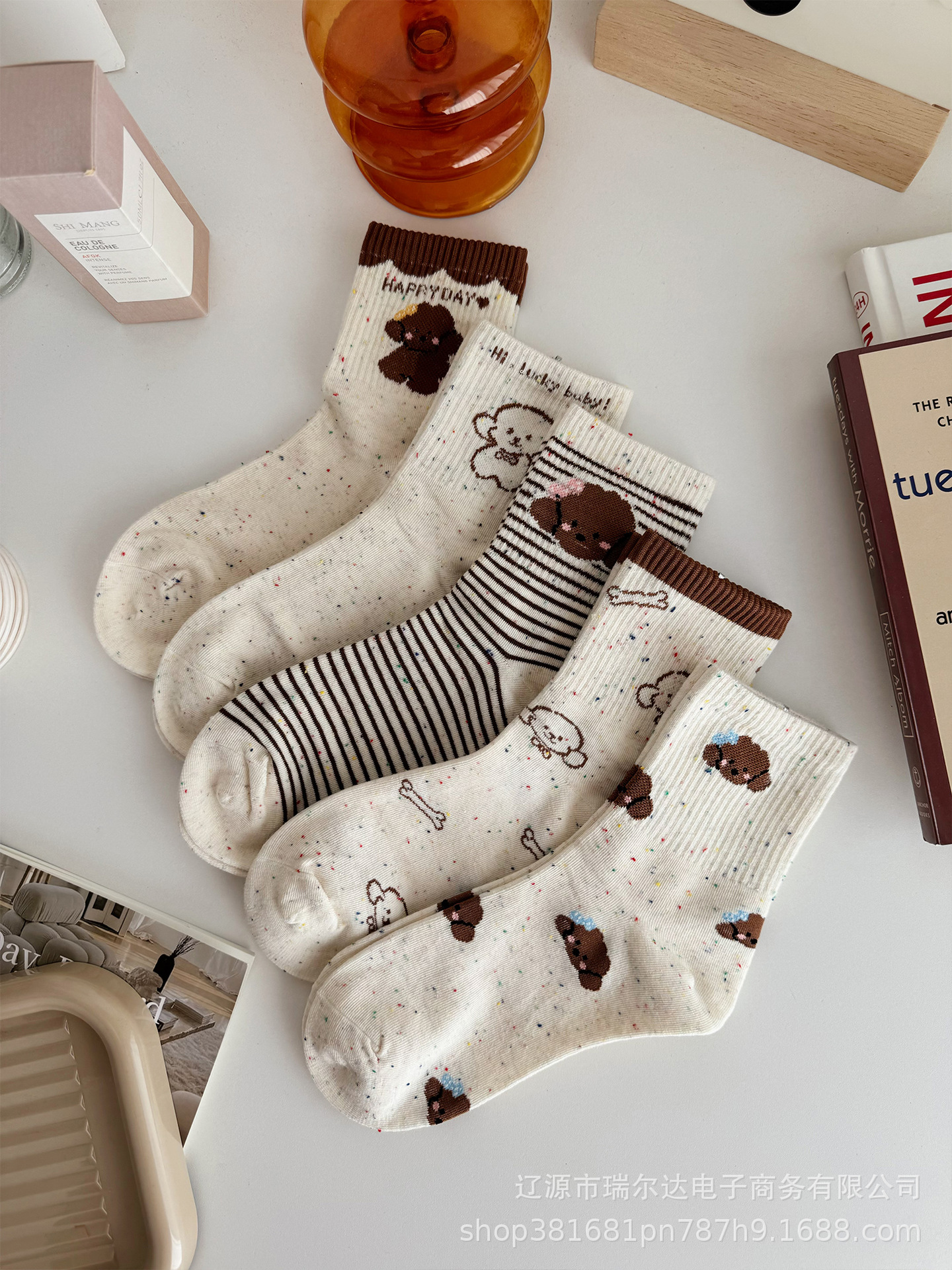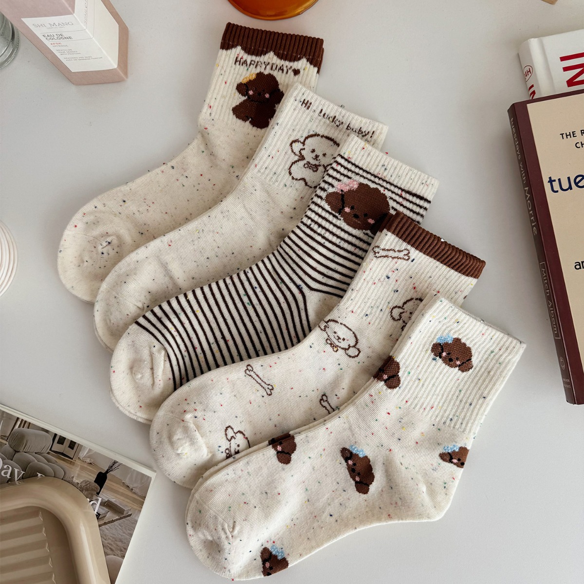 한국 스타일 Instagram 스타일 유행 만화 개 도트 원사 다크 브라운 스타일 양말 여성 중형 튜브 달콤한 귀여운 소녀의 줄무늬 면 양말