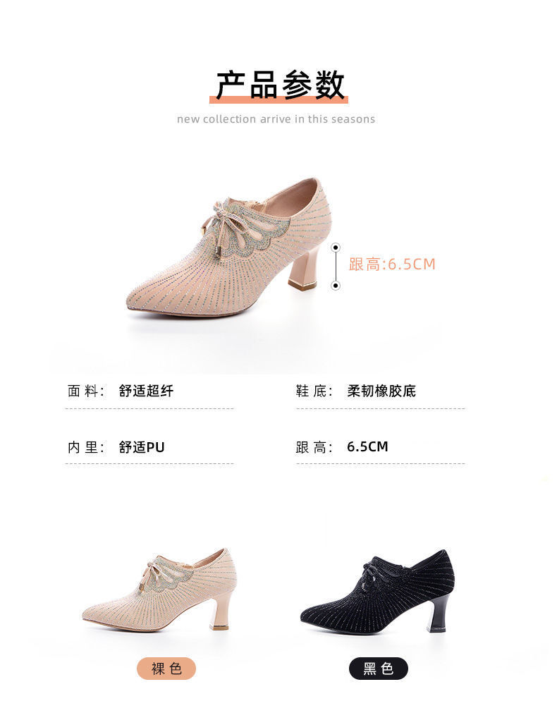 홍콩 모조 다이아몬드 하이힐 신발 어린이 두꺼운 발 뒤꿈치 2024 봄 새로운 깊은 입 작은 가죽 신발은 여성을위한 발가락 중간 뒤꿈치 단층 신발을 가리 켰습니다.스토어 가기