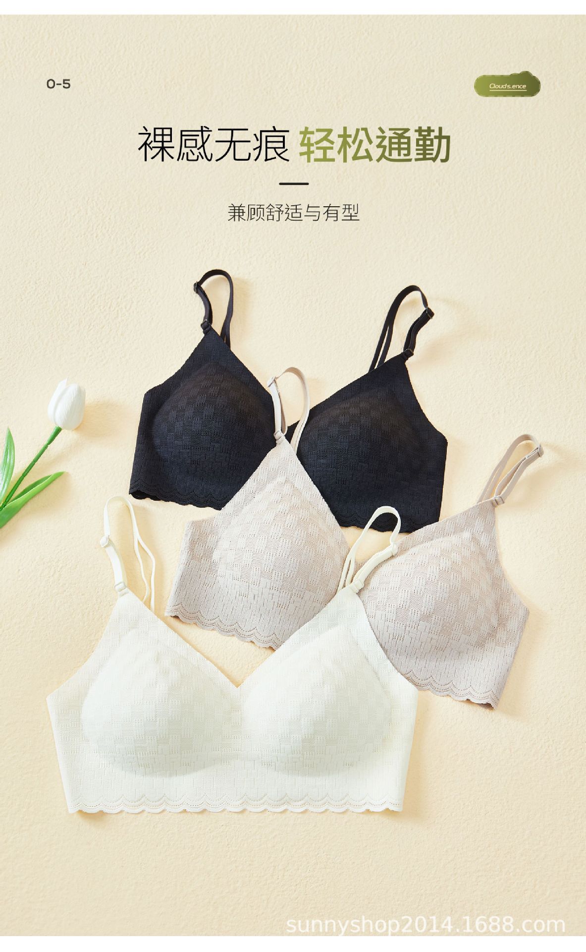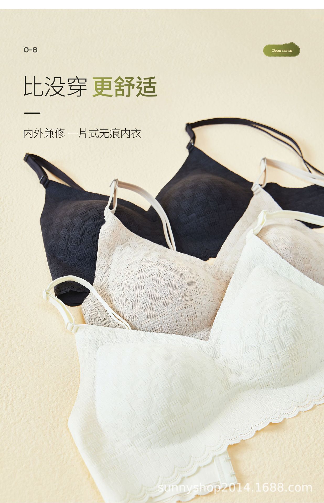 1、采用提花随心裁锁边面料, 2、简单时尚大气一体透气水滴杯,舒适承托不跑杯 3、半固定模杯,机洗不变形。 4、后比一字型性感美背设计,多种穿法搭配衣服更时尚