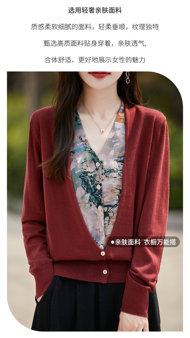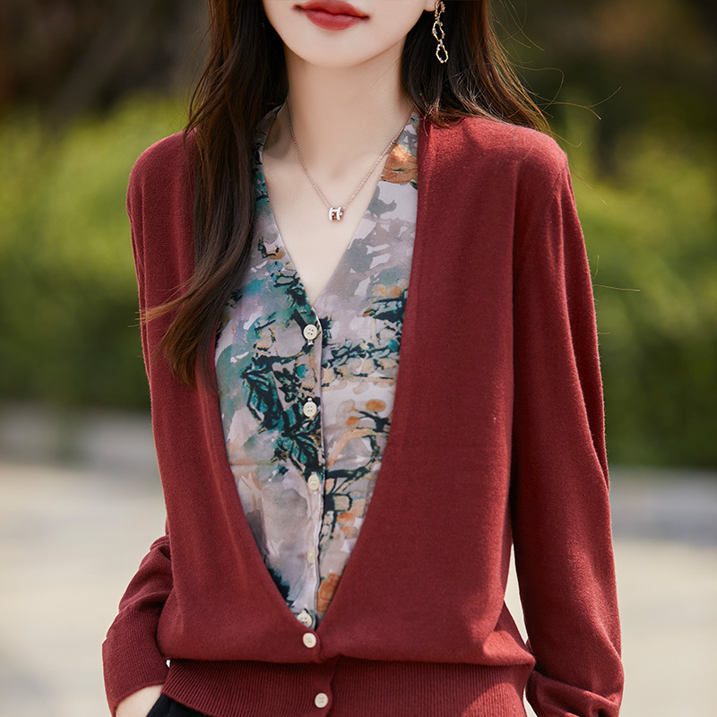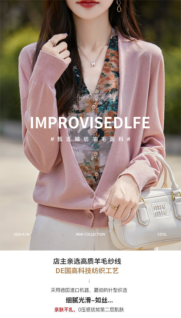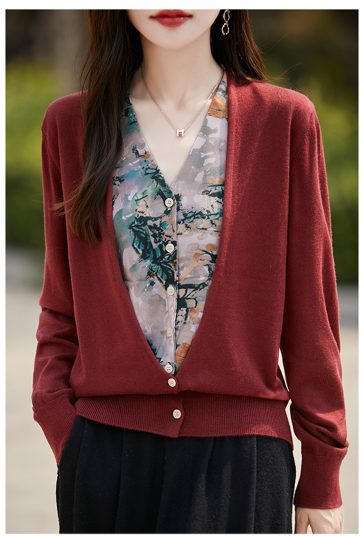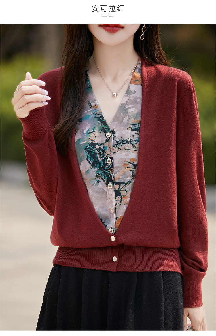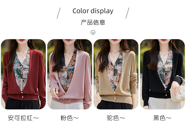 초가을 2024 새로운 도착 Worsted Wool V-Neck 니트 카디건 긴팔 여성용 인쇄 디자인 센스 페이크 투피스 탑스토어 가기
