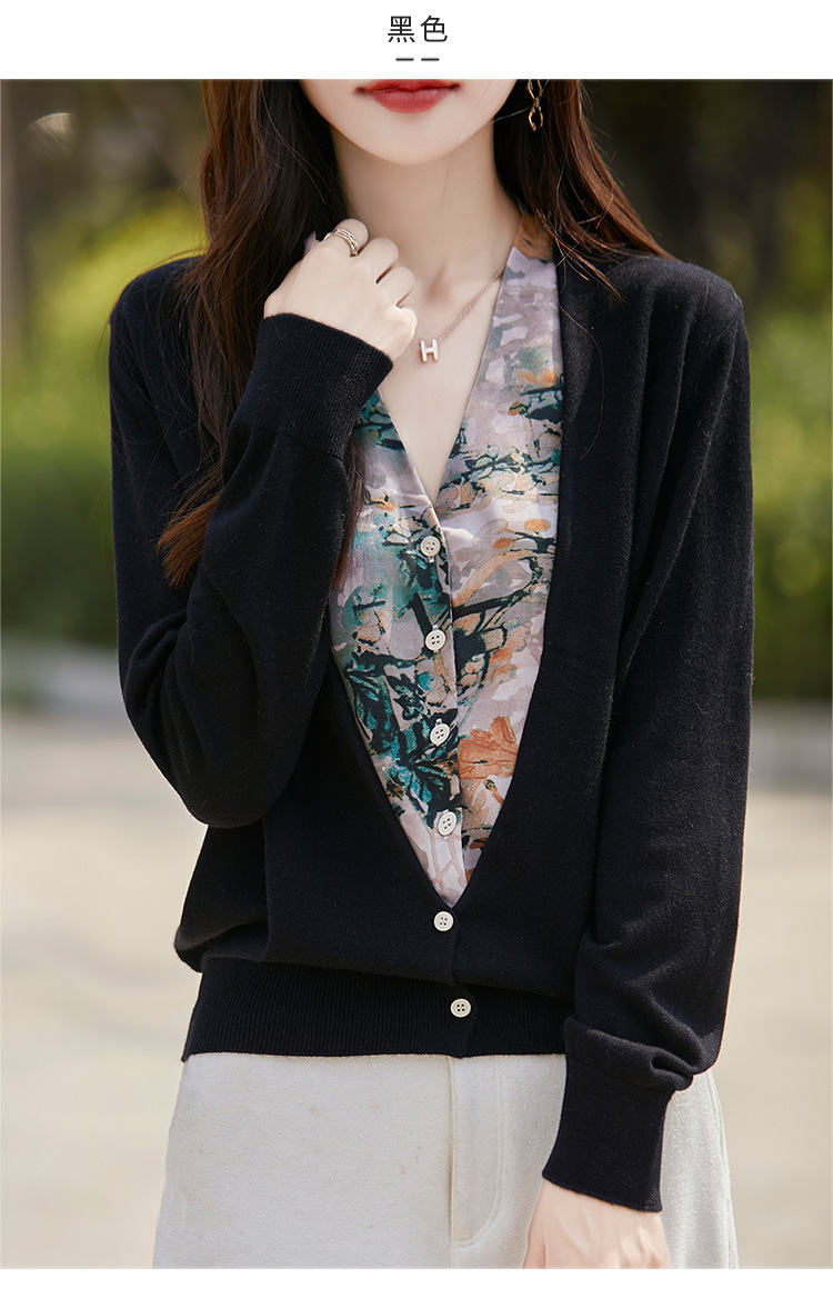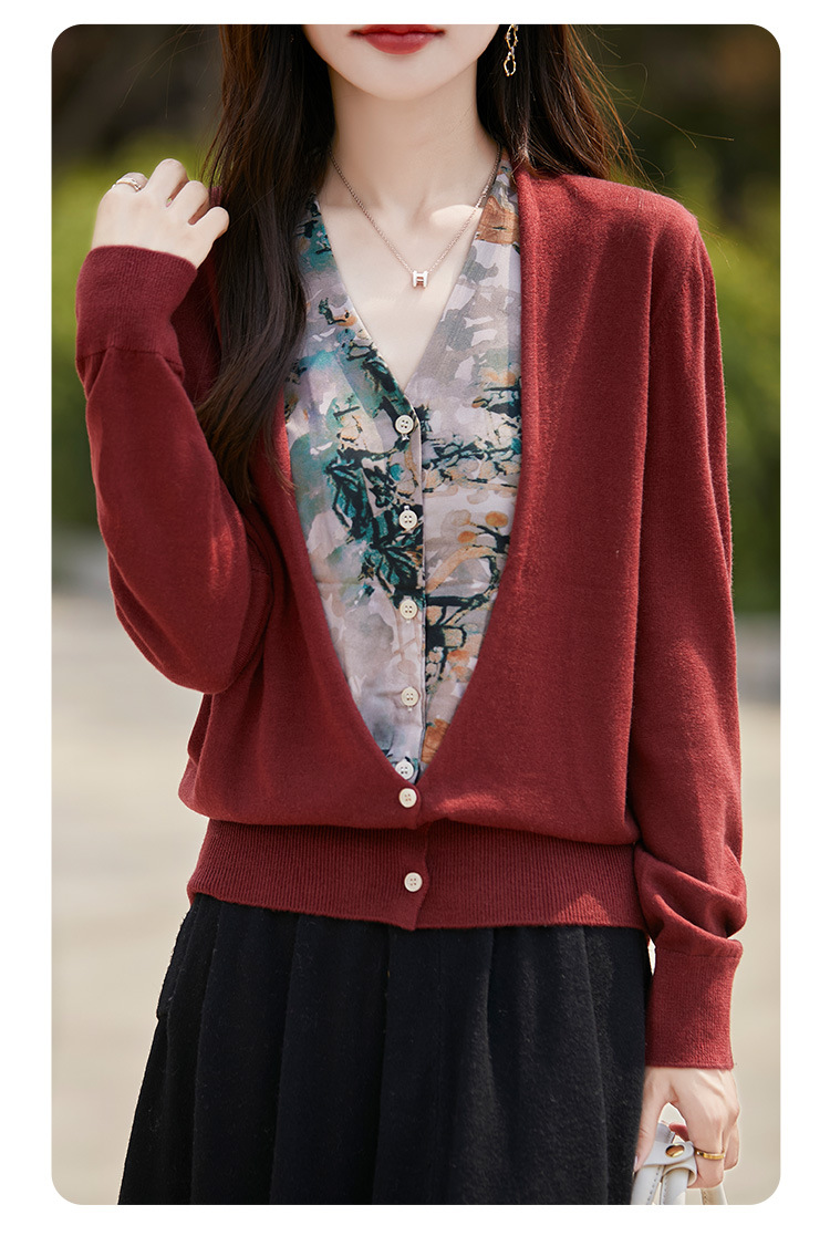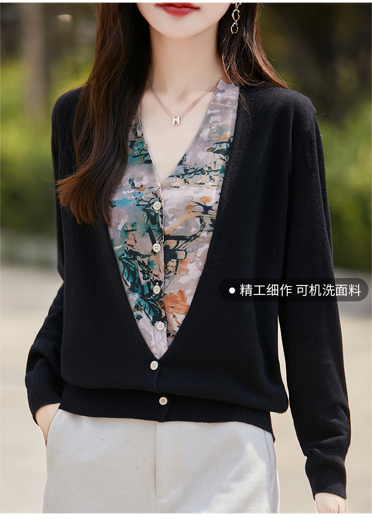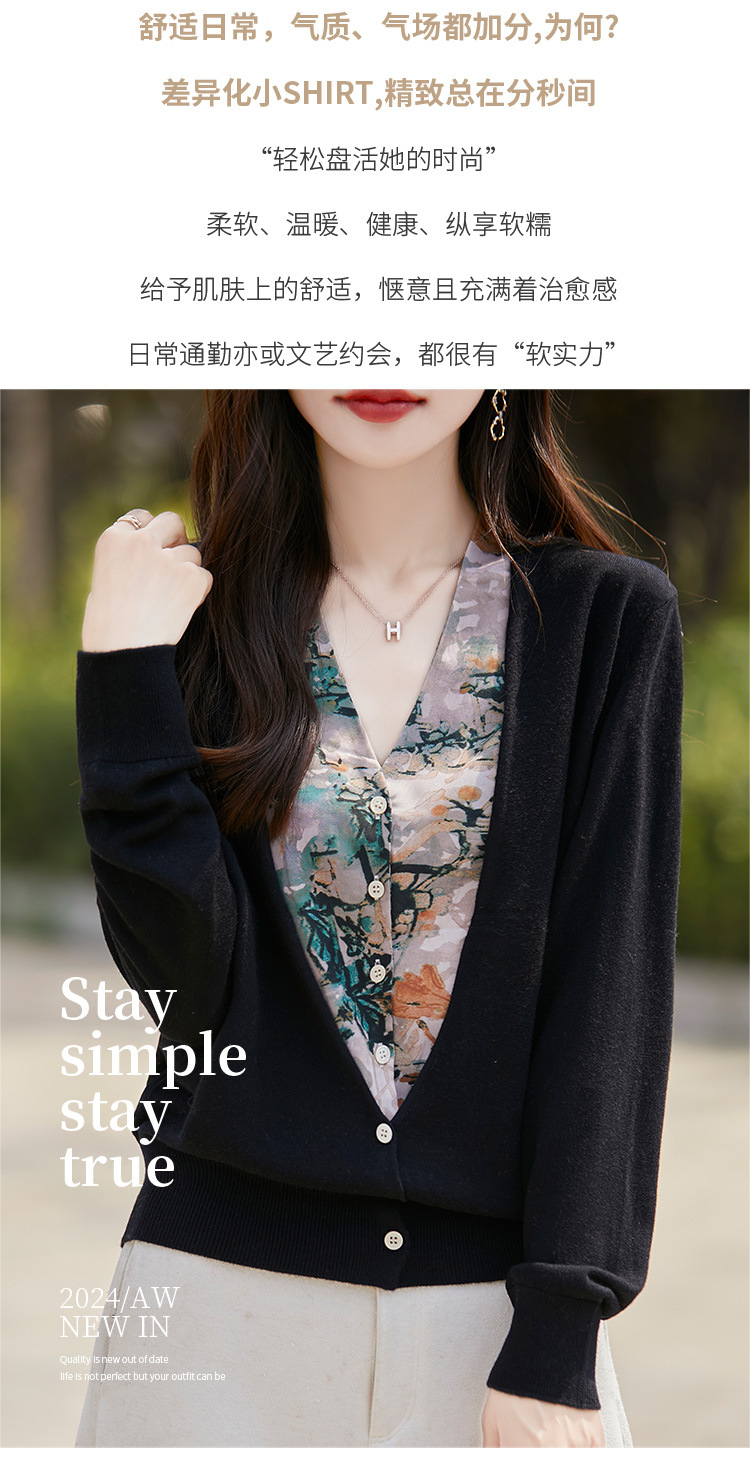 초가을 2024 새로운 도착 Worsted Wool V-Neck 니트 카디건 긴팔 여성용 인쇄 디자인 센스 페이크 투피스 탑