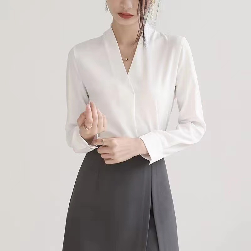 칼라리스 화이트 셔츠 여성용 주름 방지 작업복 최고 가을 하이 엔드 센스 우아한 쉬폰 V 넥 전문 긴팔 셔츠