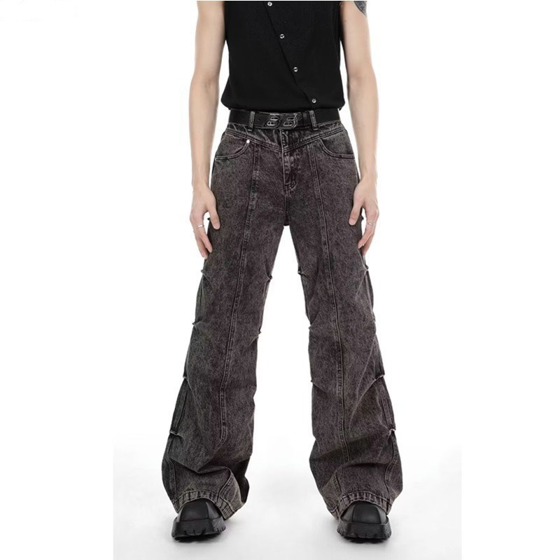 미국식 하이 스트리트 빈티지 구식 폐기물 토양 바람 Pleated Micro-lar 청바지 남성 유럽 및 미국 와이드 레그 트렌디 바지