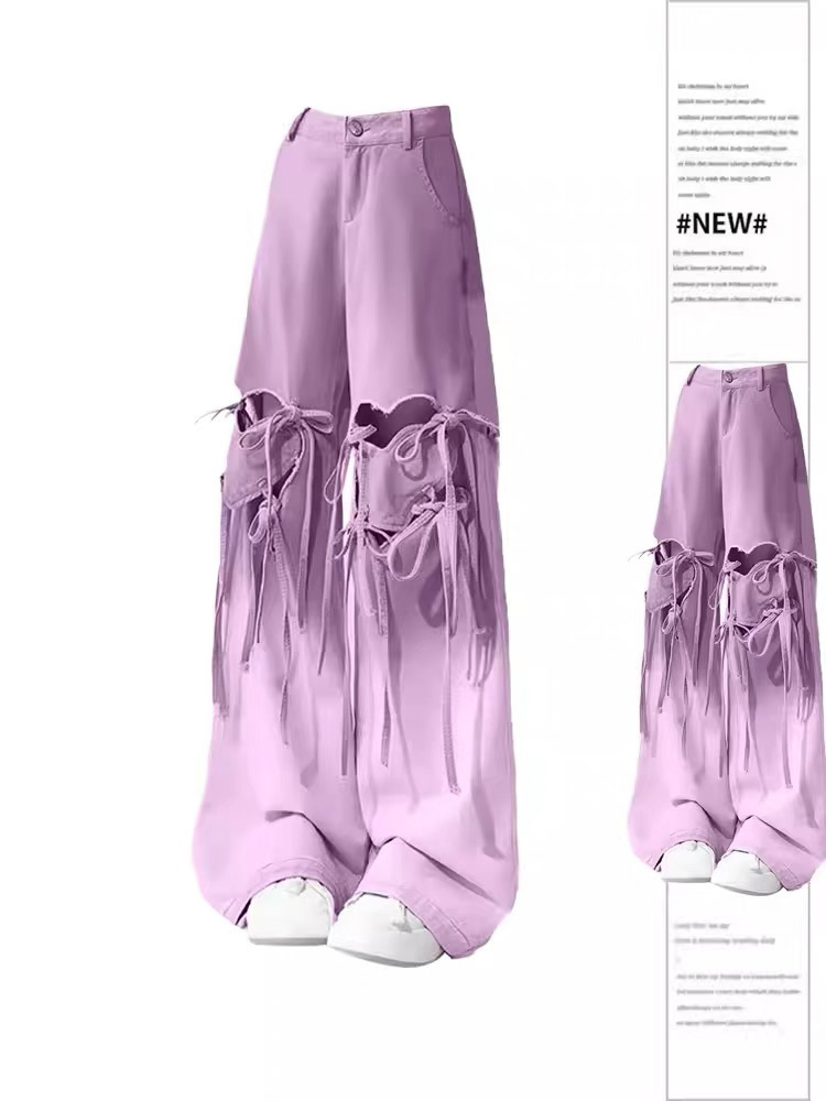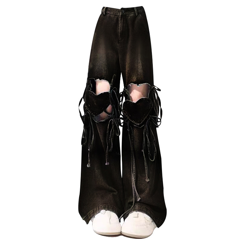 통통녀 도파민 착용 그라디언트 러브 스트랩 찢어진 청바지 여성 플러스 사이즈 틈새 느슨한 슬림 와이드 다리 바지스토어 가기