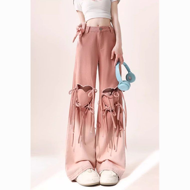 통통녀 도파민 착용 그라디언트 러브 스트랩 찢어진 청바지 여성 플러스 사이즈 틈새 느슨한 슬림 와이드 다리 바지