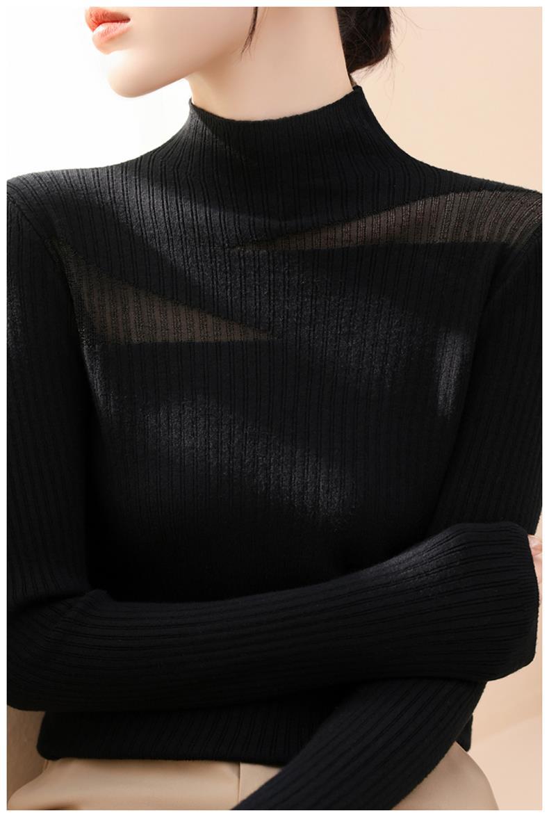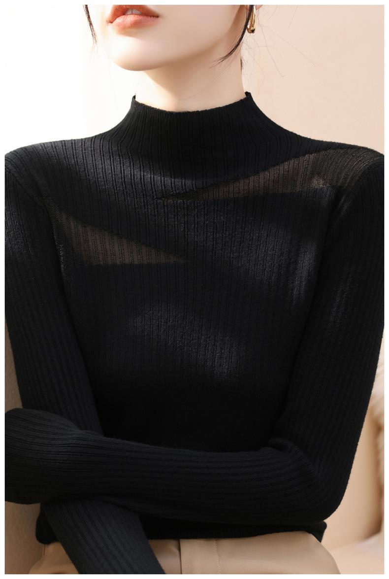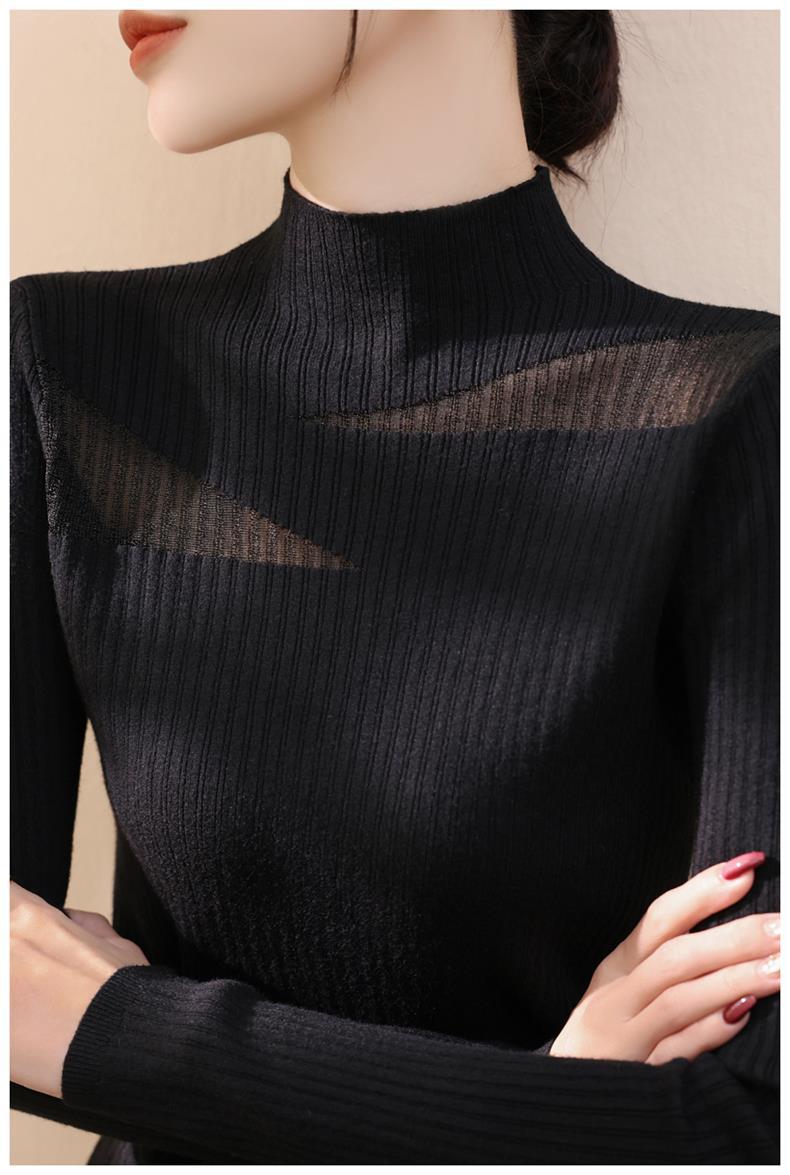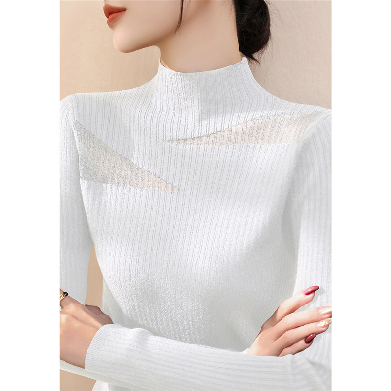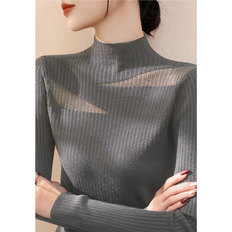 양모 봄과 가을 여성의 반 높이 칼라 레이스 메쉬 할로우 니트 2024 새로운 프랑스 스티칭베이스 탑스토어 가기