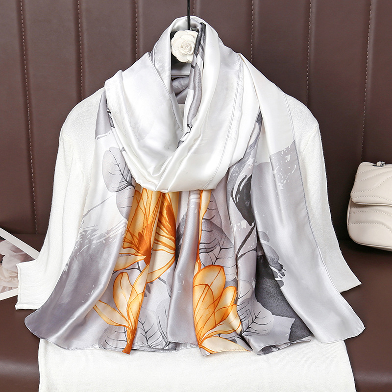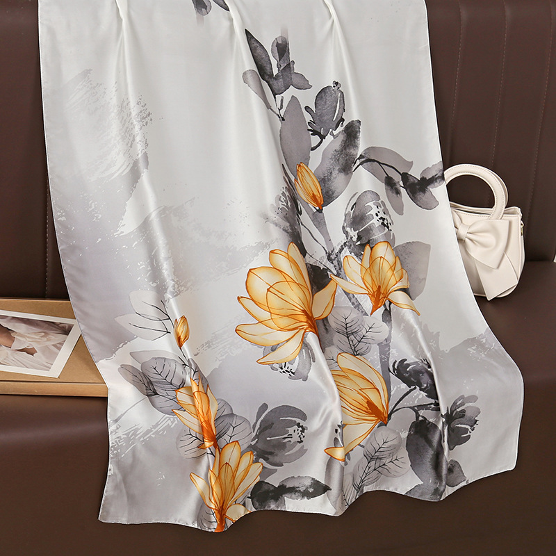 문학적이고 우아한 식물 연꽃 인쇄 리 브로케이드 새틴 긴 실크 스카프 국립 스타일 잉크 그림 여성용 케이프스토어 가기