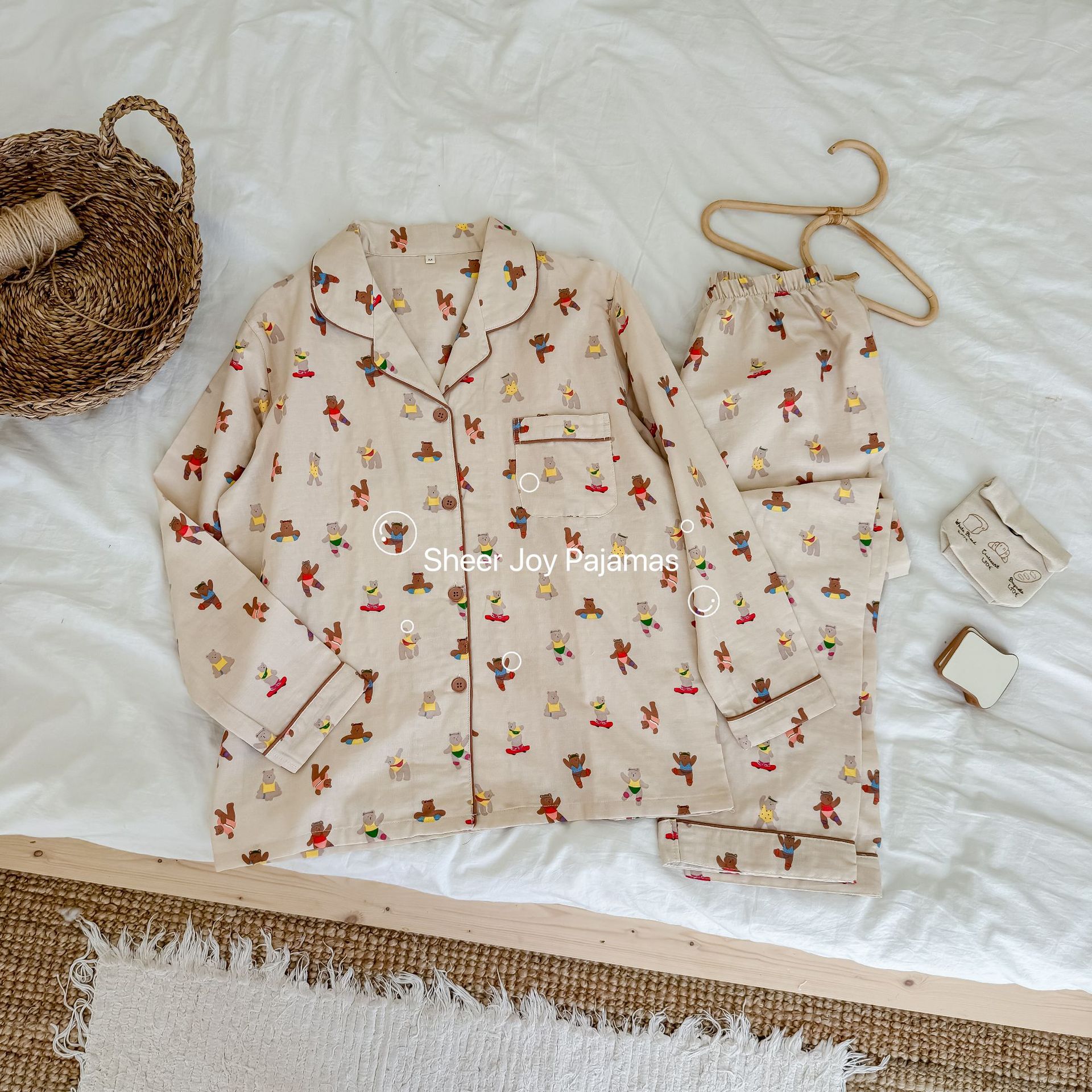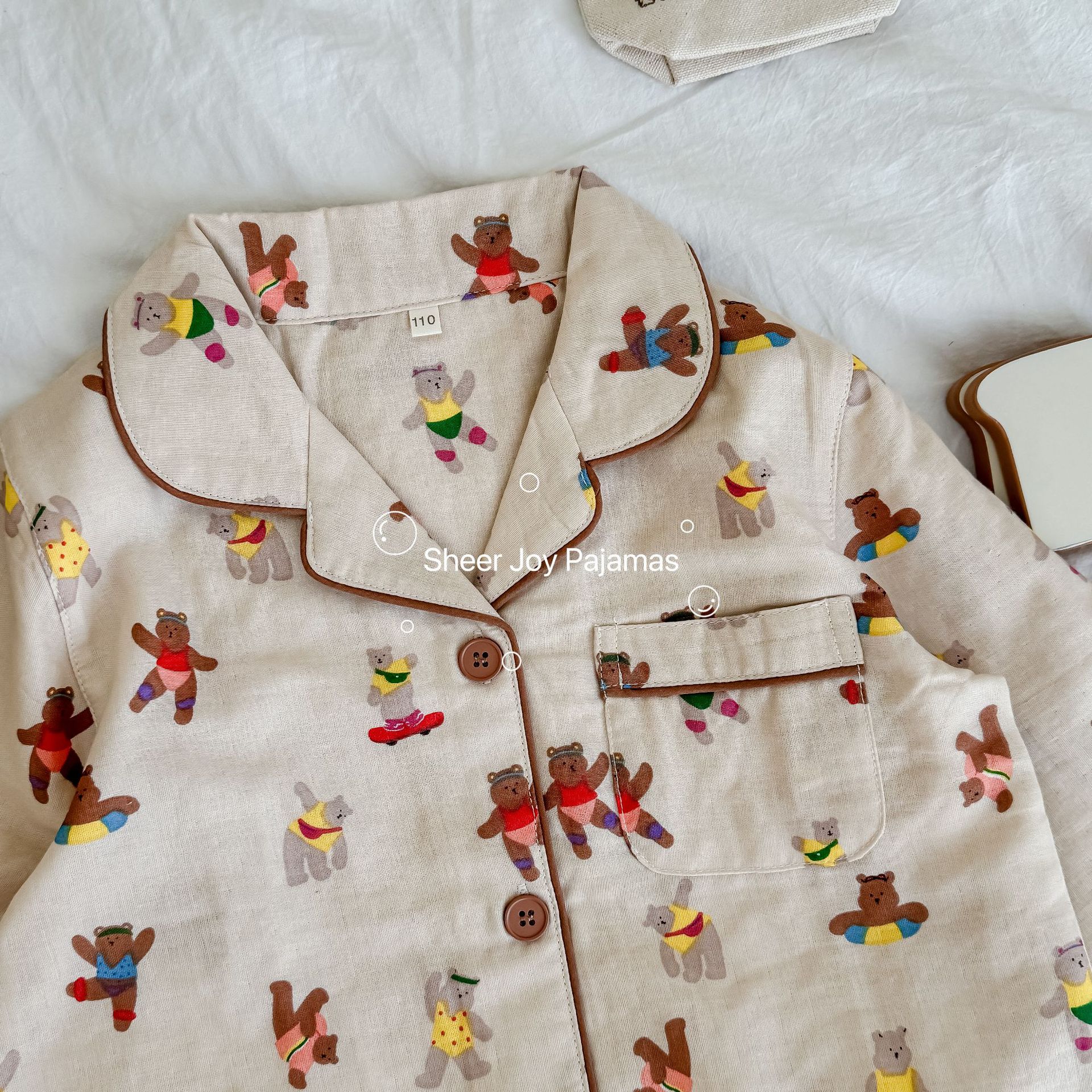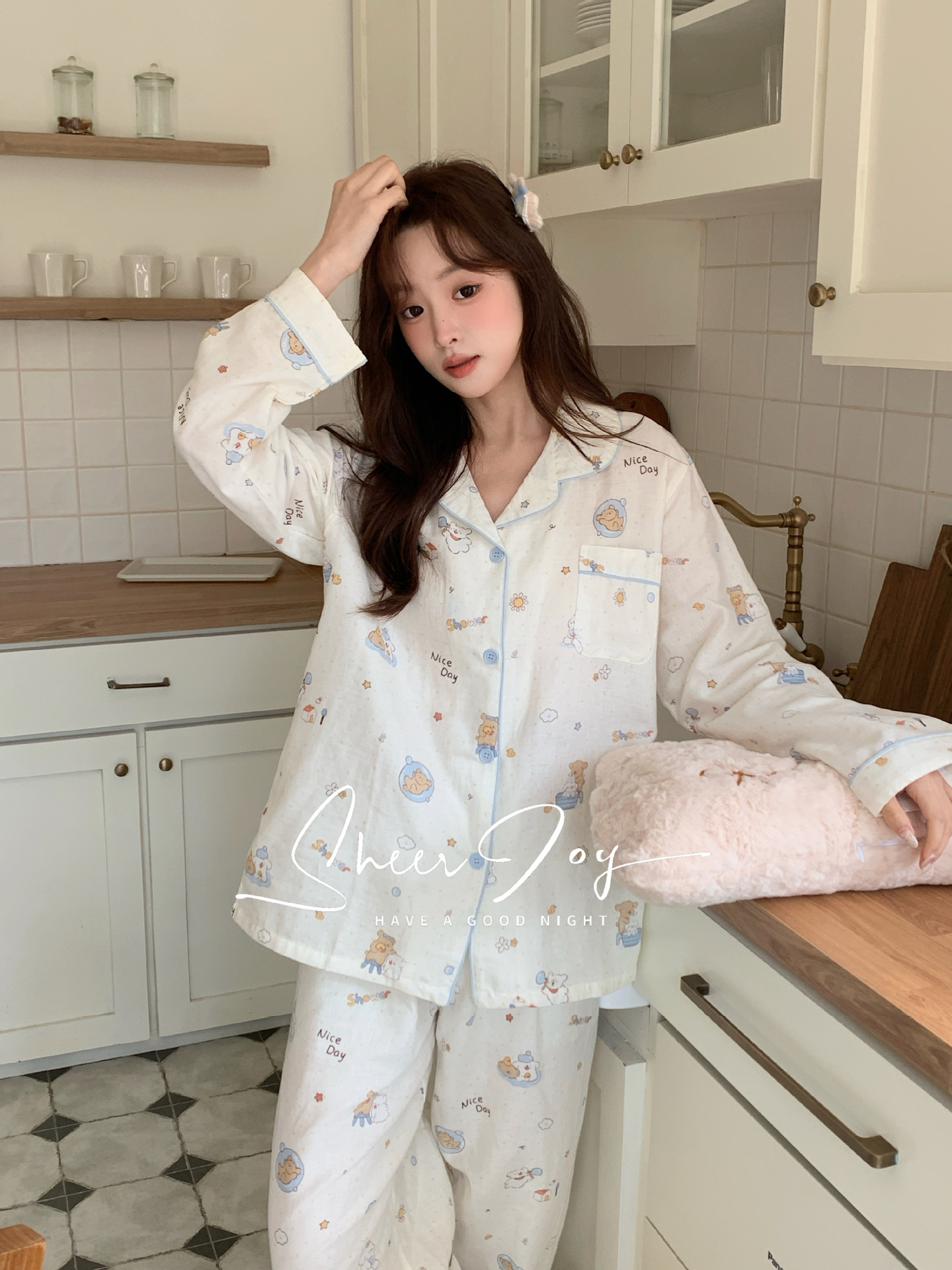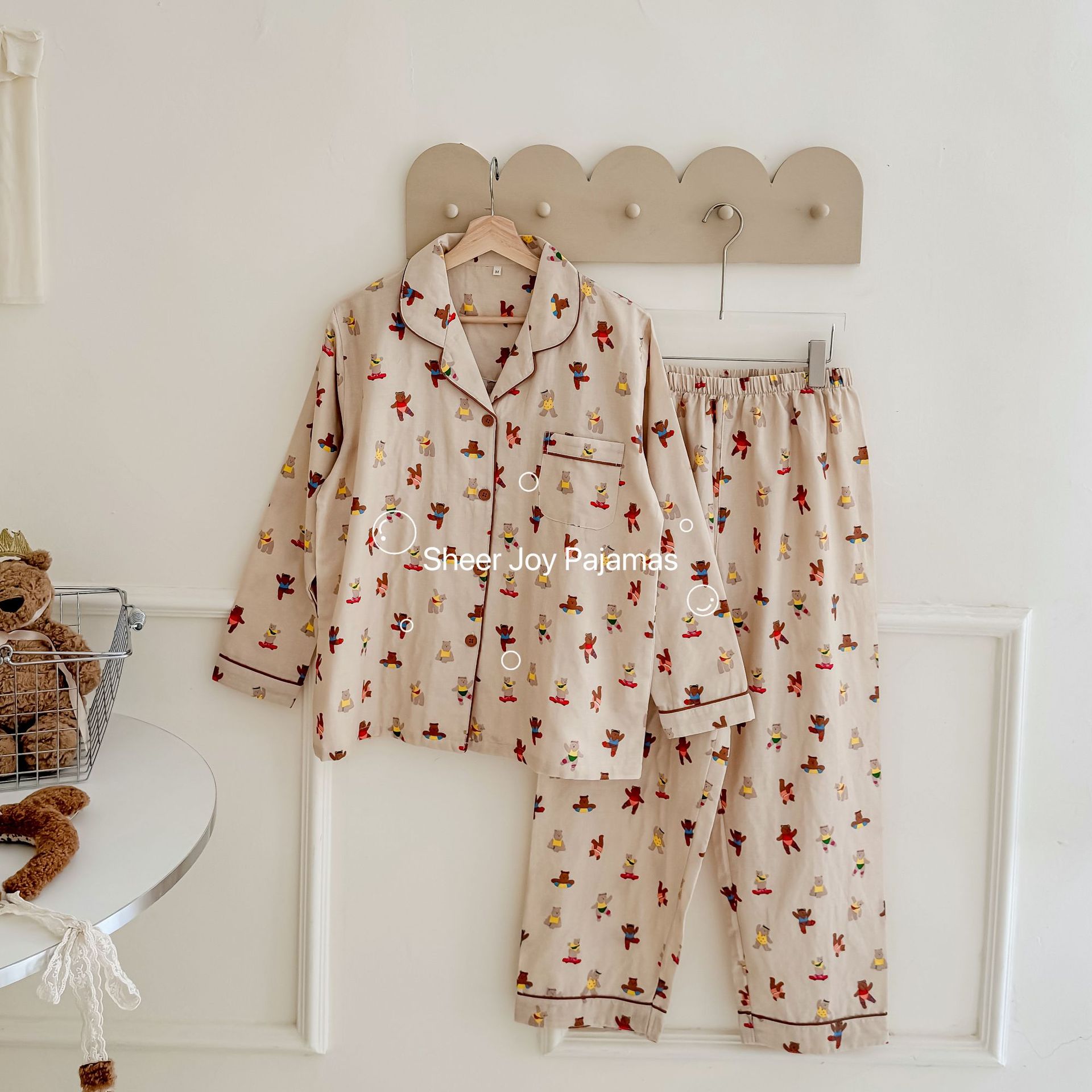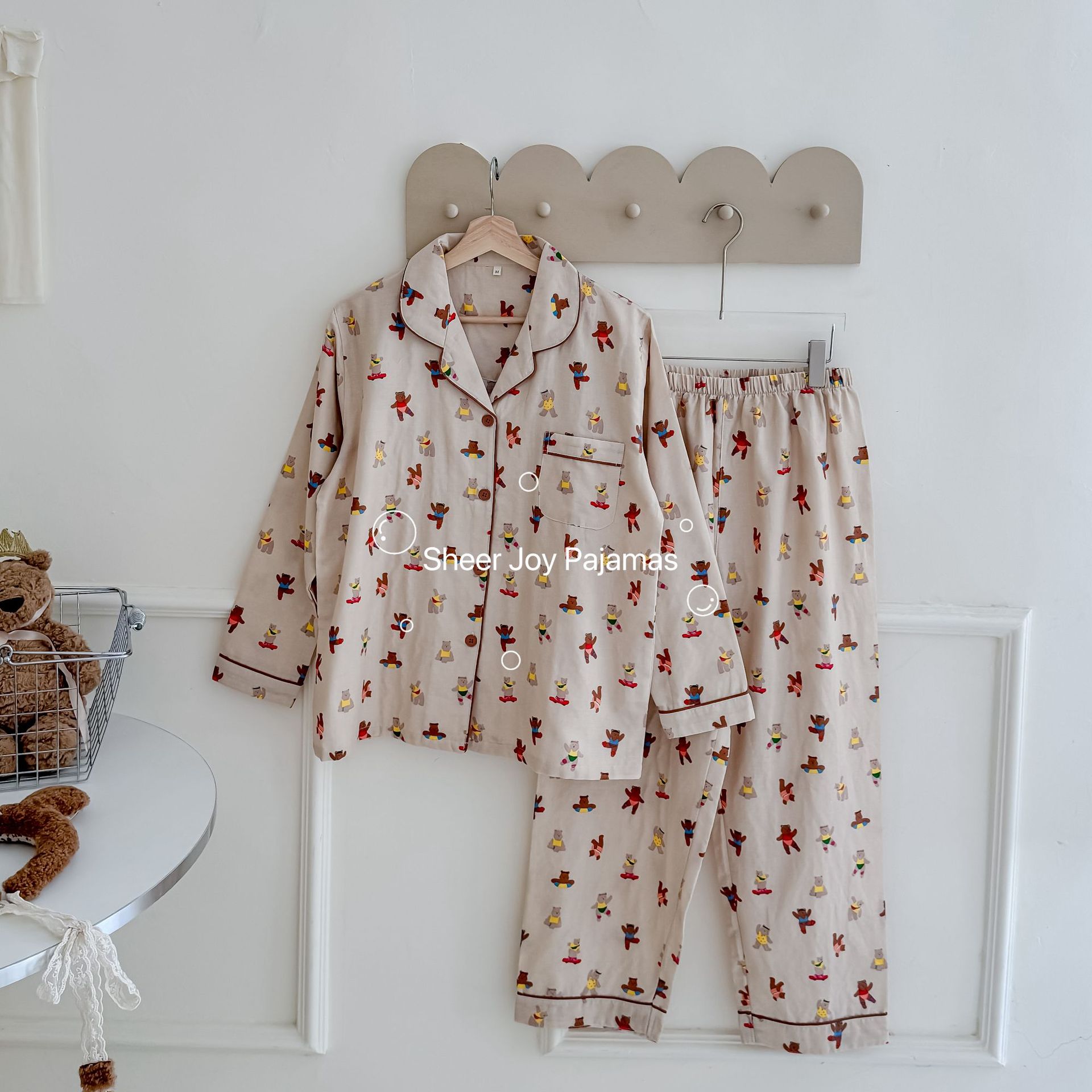 순수 면 더블 레이어 원사 임베디드 용어 부모 자식 긴팔 바지 홈 의류 세트 댄싱 베어
