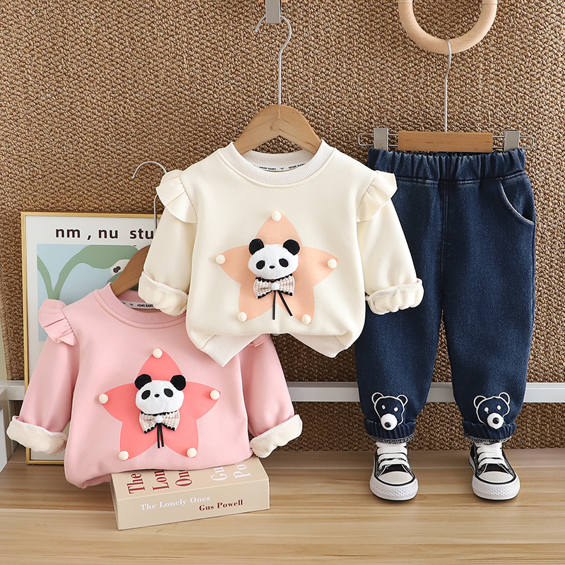 아동복 2024 가을과 겨울 새로운 한국 어린이 세트 다섯개 별 곰 소녀 기모 긴 소매 투피스 가을 의류스토어 가기