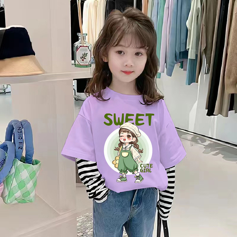 G2528 # 코튼 걸스 긴 소매 티셔츠 가짜 두 조각 봄과 가을 원피스 큰 아이들 티셔츠 최고 초등 및 중등 학생 기본 셔츠스토어 가기