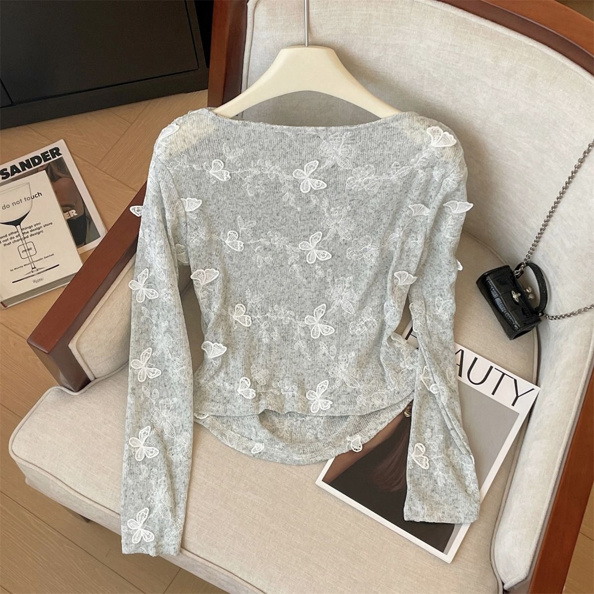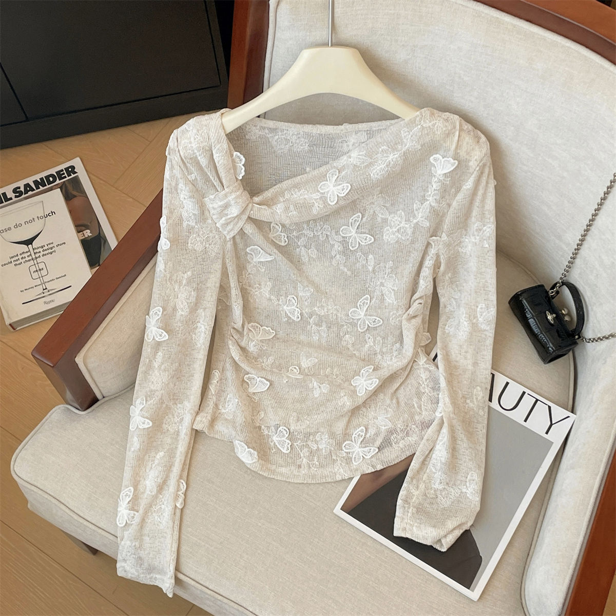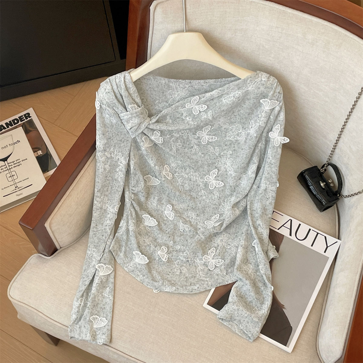 고급 입체 나비 레이스 긴팔 여성 가을 슬래시 넥 티셔츠 불규칙 탑 핫 소녀 트렌디 스타일 새로운 스타일스토어 가기