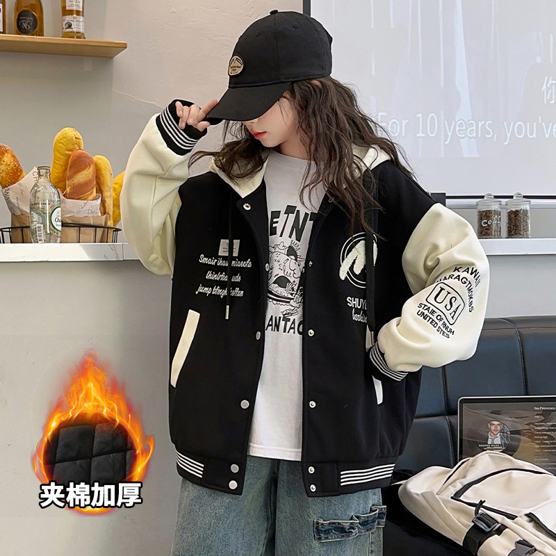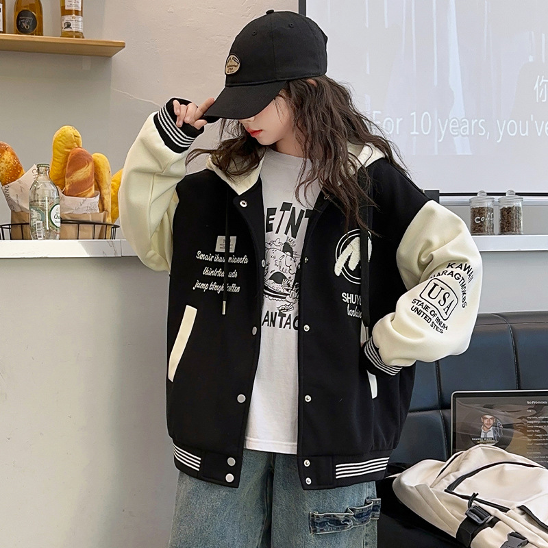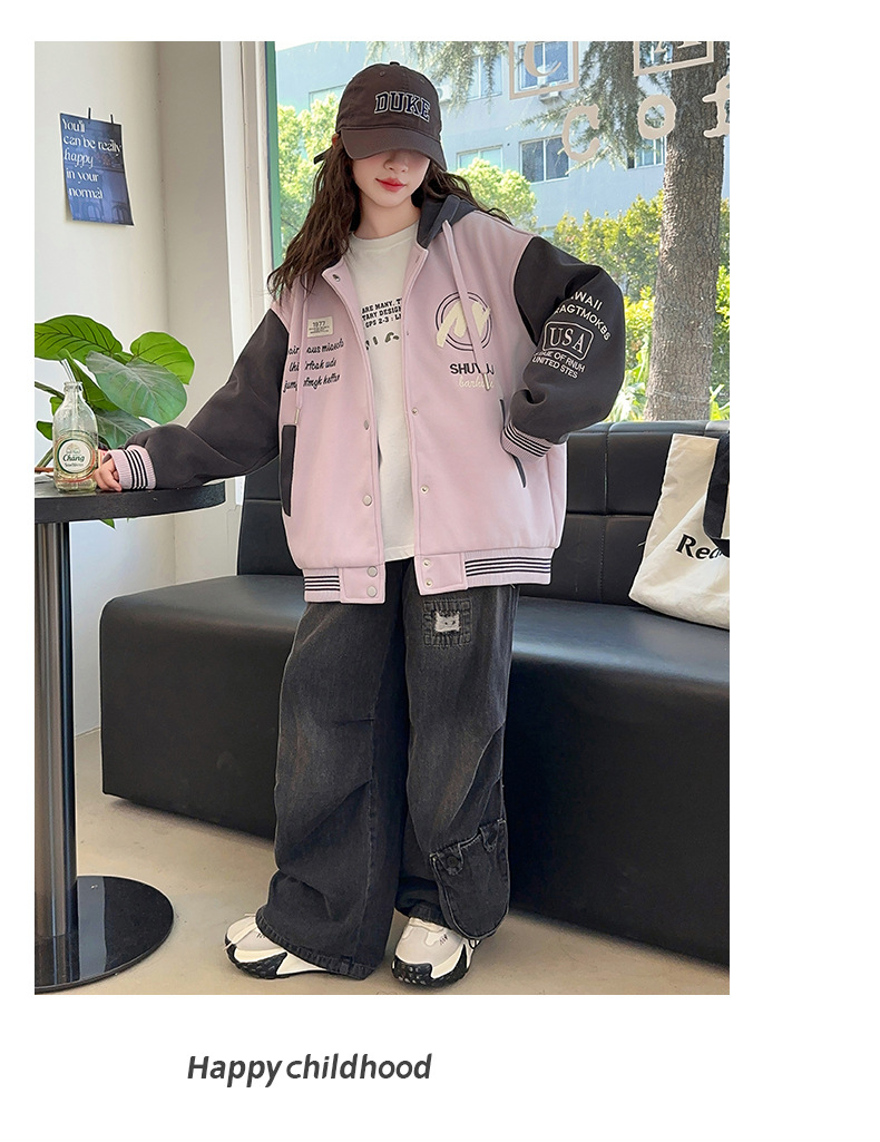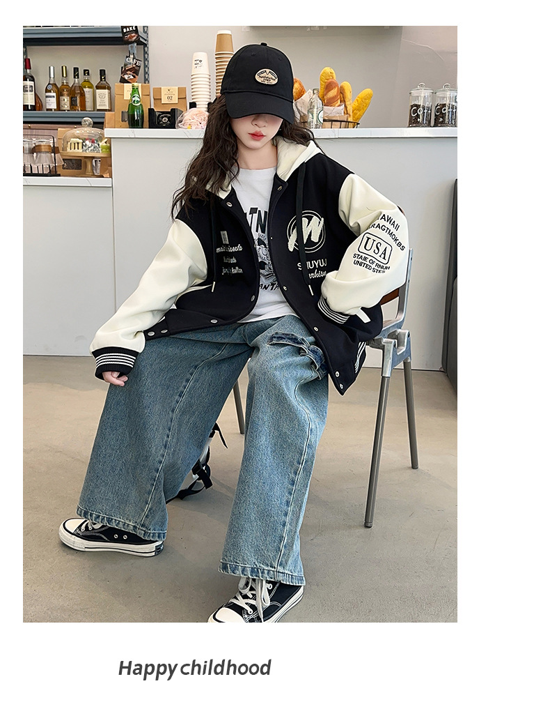 소녀 코트 봄과 가을 2025 새로운 어린이 서양 스타일 느슨한 캐주얼 후드 탑 어린이 가을 야구 세트스토어 가기