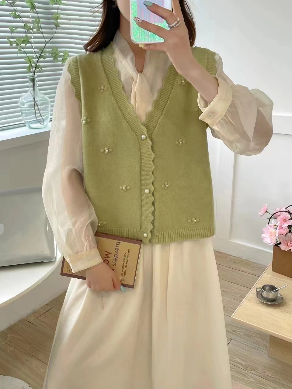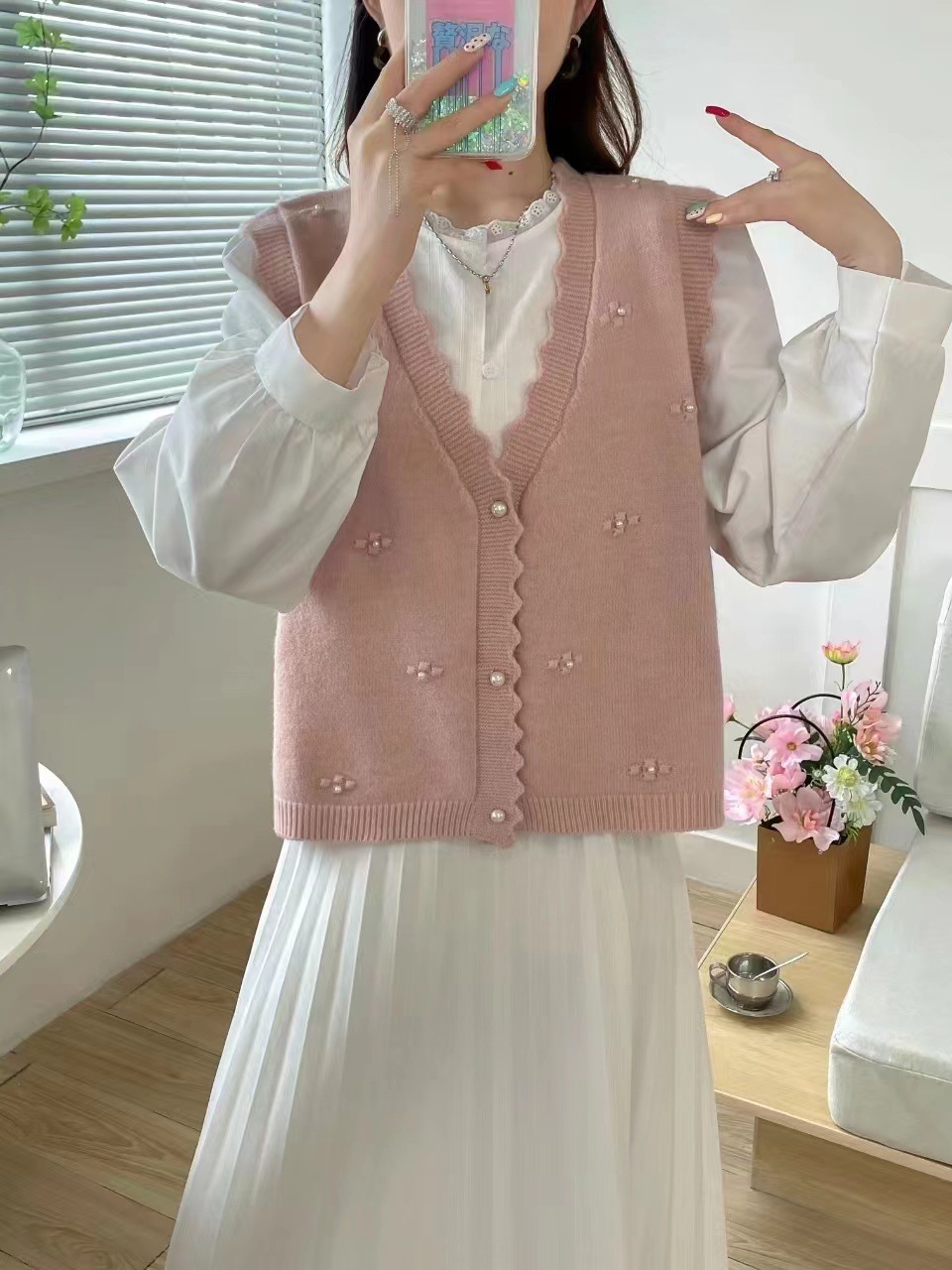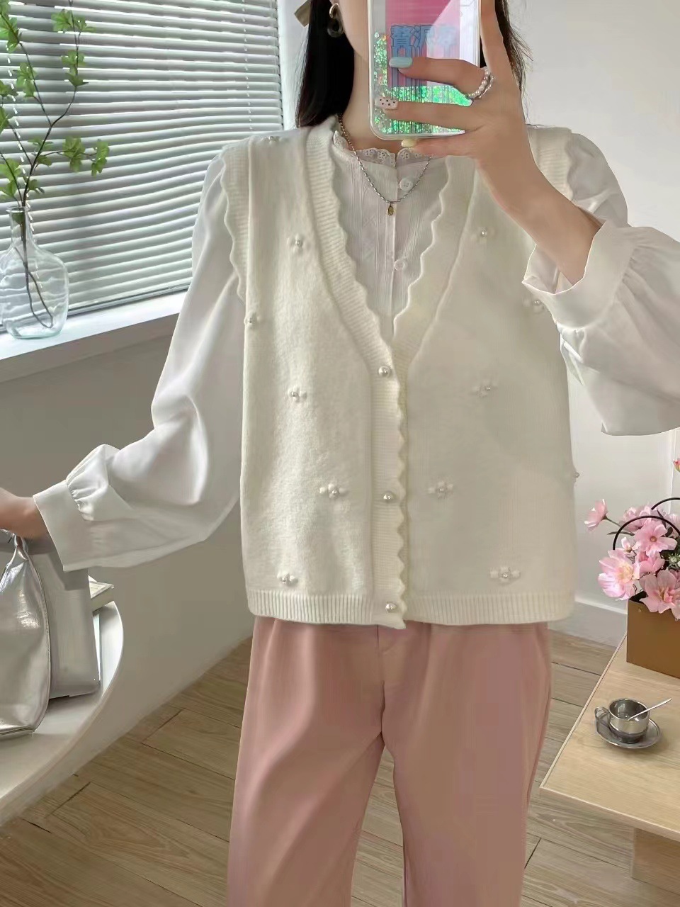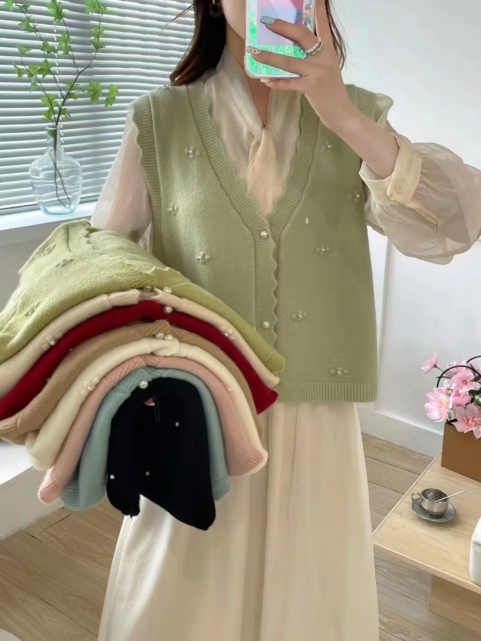 재고 가을 새로운 스웨터 조끼 여성용 구슬 칼리지 스타일 외부 착용 얇은 민소매 니트 카디건 조끼스토어 가기
