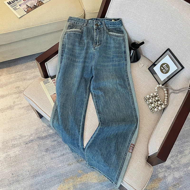 빈티지 콘트라스트 컬러 배 모양의 넓은 다리 청바지 여성 패션 느슨한 스트레이트 바지 디자인 바느질 긴 바지 가을